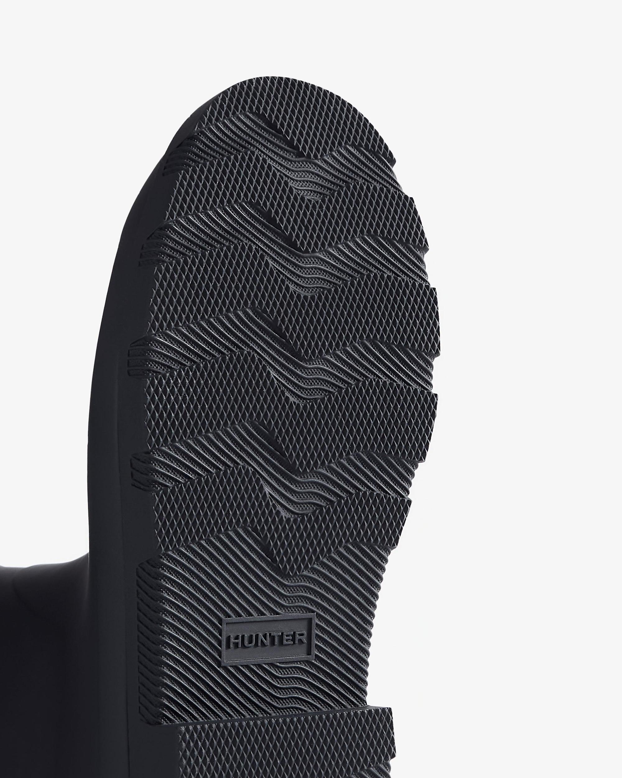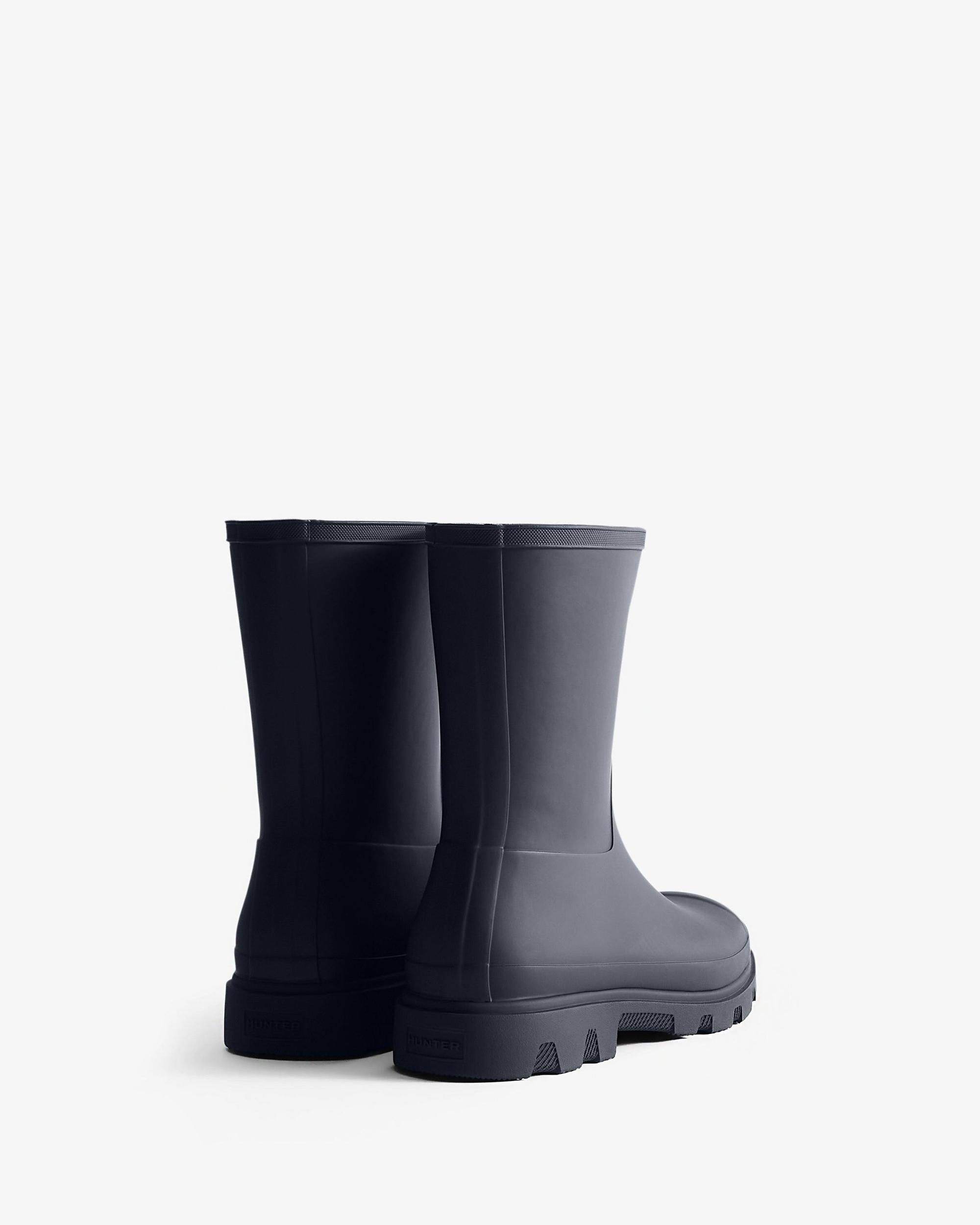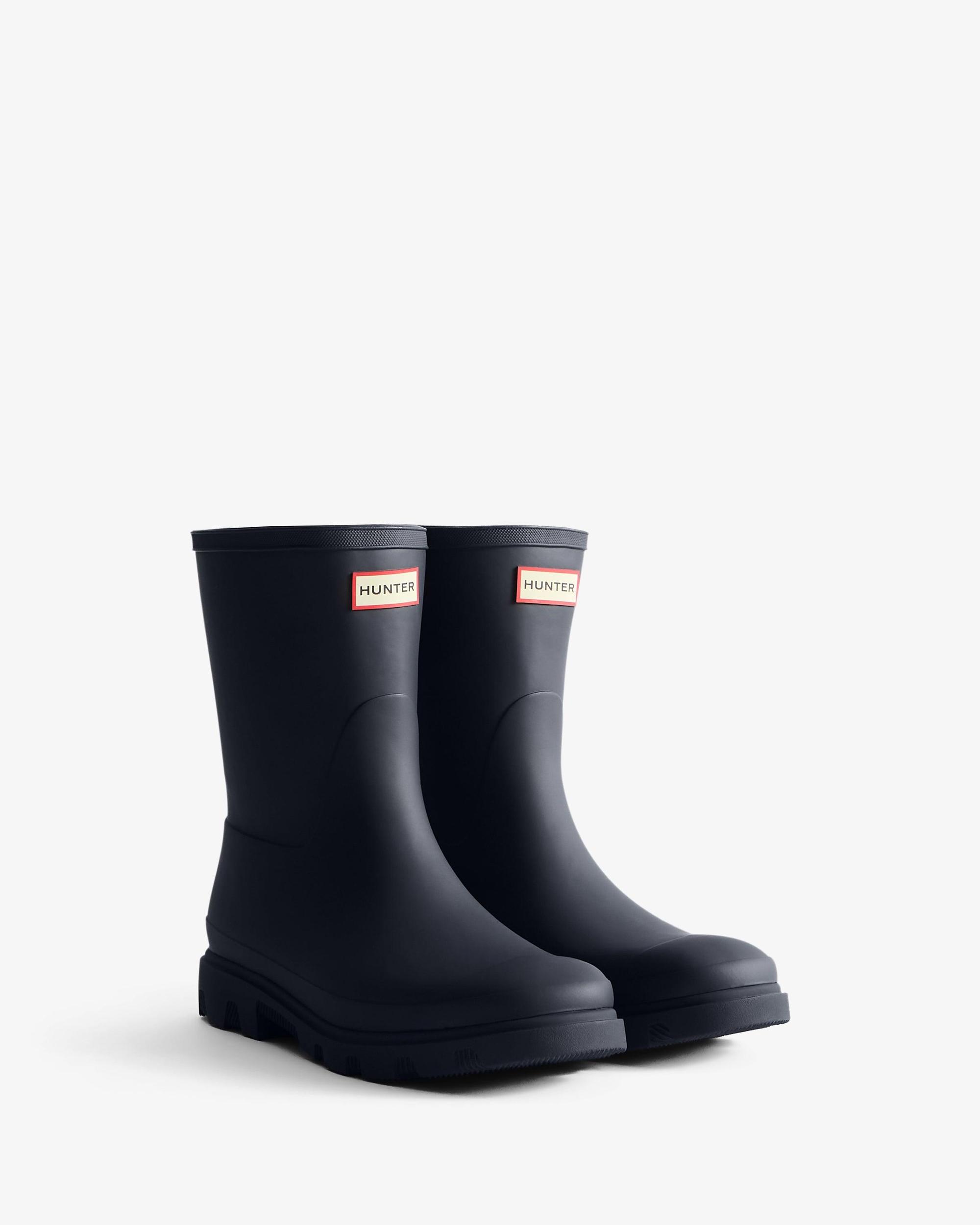 Men's Downpour Short Wellington Boot Size/Fit Summary: True to size, Regular fit. Introducing the newest addition to the Hunter family, our fully waterproof Men's Downpour Short Boot. With a sleek upper design and a lightweight moulded outsole, the unique tread has taken influence from natural shapes found in landscapes. Handcrafted and finished with a heritage topbind, this men's navy short boot has been engineered to have a more modern and voluminous calf fit. We recommend that all Hunter boots be worn with socks to protect the wearer's skin from contact with rubber.