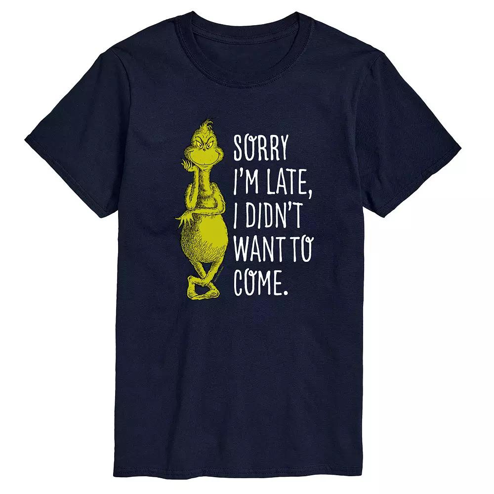 Add a quirky touch to your wardrobe with this Mens Dr. Seuss Grinch Sorry Im Late Graphic Tee. FEATURES Crewneck Short sleeveFABRIC & CARE Solid Color: Cotton ; Heather Colors: Cotton/Polyester Machine wash Imported Color: Navy. Gender: male. Age Group: adult.