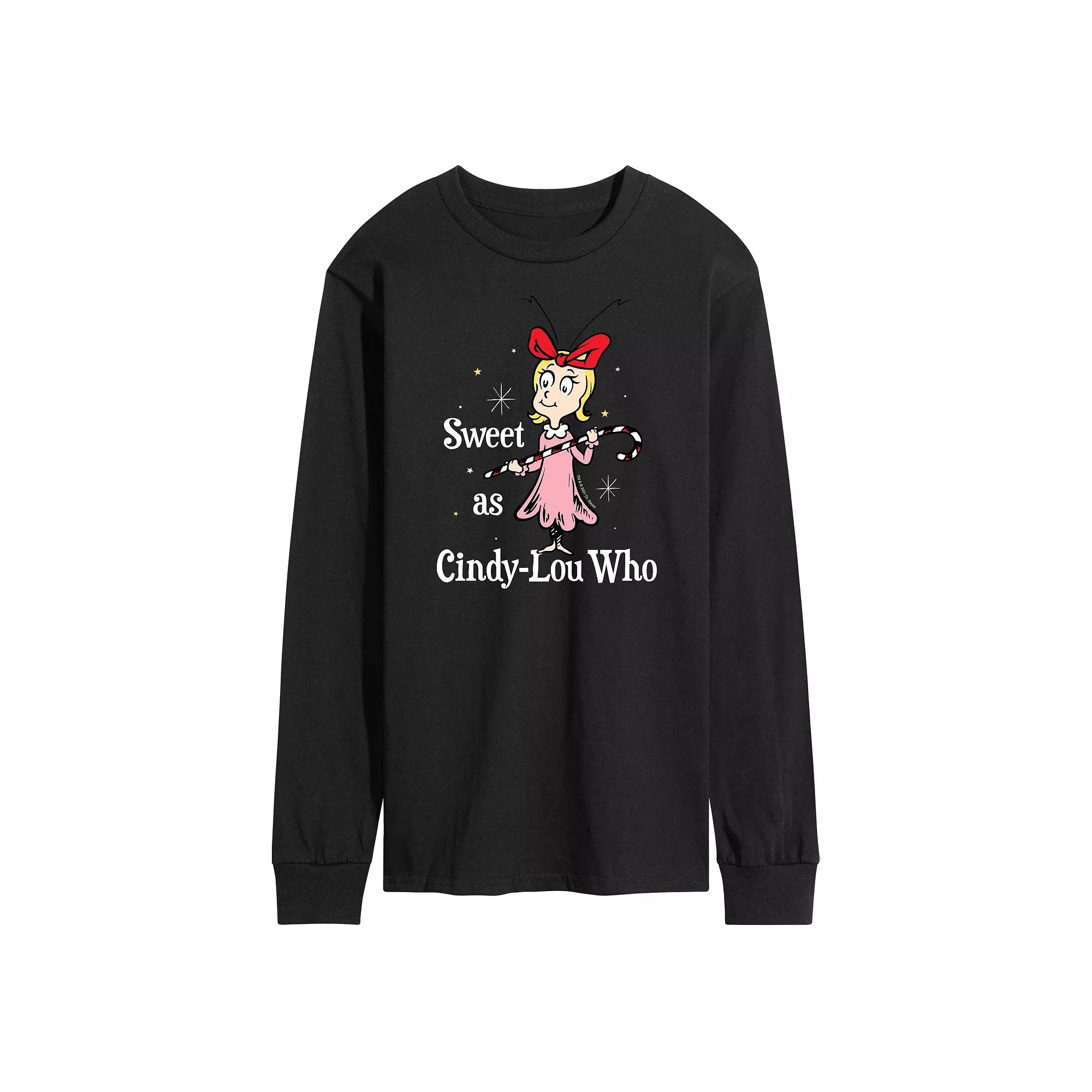 Cindy Lou Who fans are the sweetest bunch. Rep your sweetness in this Dr. Seuss Grinch long sleeve graphic tee. Cindy Lou Who fans are the sweetest bunch. Rep your sweetness in this Dr. Seuss Grinch long sleeve graphic tee. Crewneck Long sleevesFABRIC & CARE Cotton Machine wash Imported Color: Black. Gender: male. Age Group: adult.