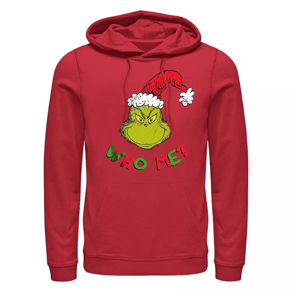 Get in the Holiday spirit with your favorite character in this Men's Dr. Seuss Grinch Who Me Graphic Hoodie.Get in the Holiday spirit with your favorite character in this Men's Dr. Seuss Grinch Who Me Graphic Hoodie.FEATURES Attached hood Long sleeve Kangaroo pocketFABRIC & CARE Cotton, polyester Machine wash Imported Color: Red. Gender: male. Age Group: adult.
