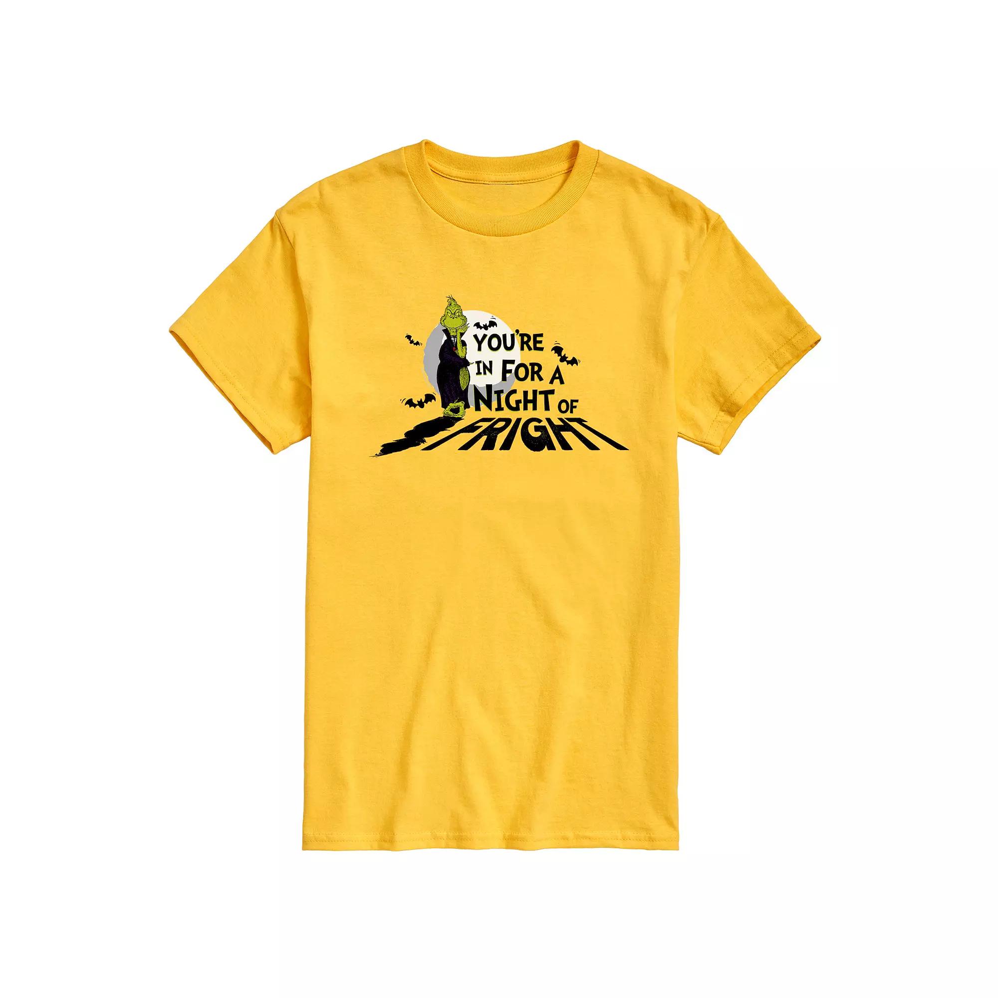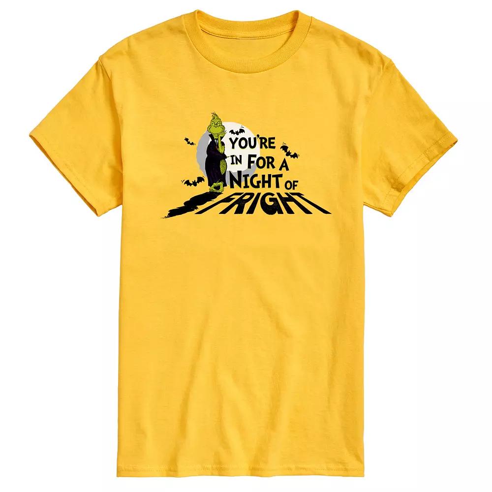 Give your wardrobe a spooktacular refresh with this Mens Dr. Seuss Grinch Youre In For A Night Graphic Tee. Give your wardrobe a spooktacular refresh with this Mens Dr. Seuss Grinch Youre In For A Night Graphic Tee. FEATURES Crewneck Short sleeveFABRIC & CARE Solid Color: Cotton ; Heather Colors: Cotton/Polyester Machine wash Imported Size: L. Color: Yellow. Gender: male. Age Group: adult.