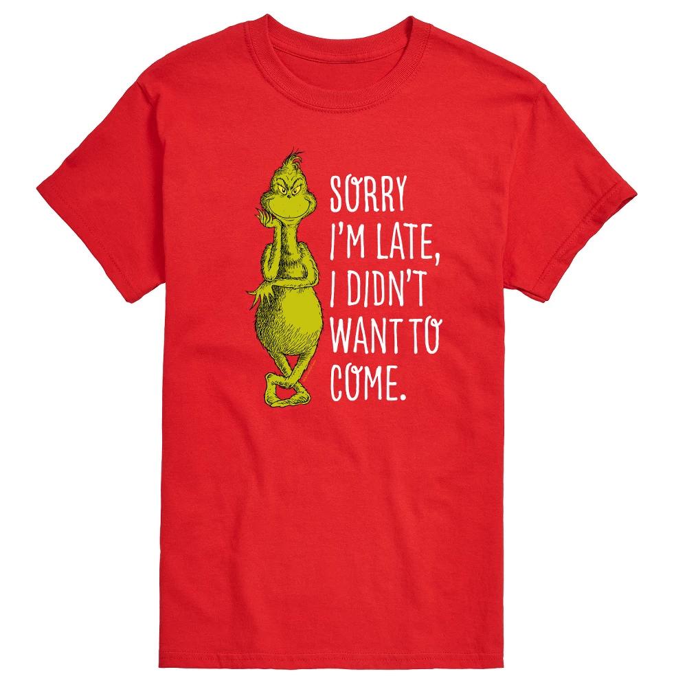 Dr. Seuss The Grinch - Christmas - Sorry I'm Late Didn't Want To Come - Men's Short Sleeve Graphic T-Shirt - Our collection of graphic apparel featuring officially licensed Dr. Seuss characters brings the whimsy and wonder of Seussville straight into your wardrobe. From the mischievous Cat in the Hat to the stinky Grinch each design showcases iconic characters and scenes from Dr. Seuss's timeless stories.