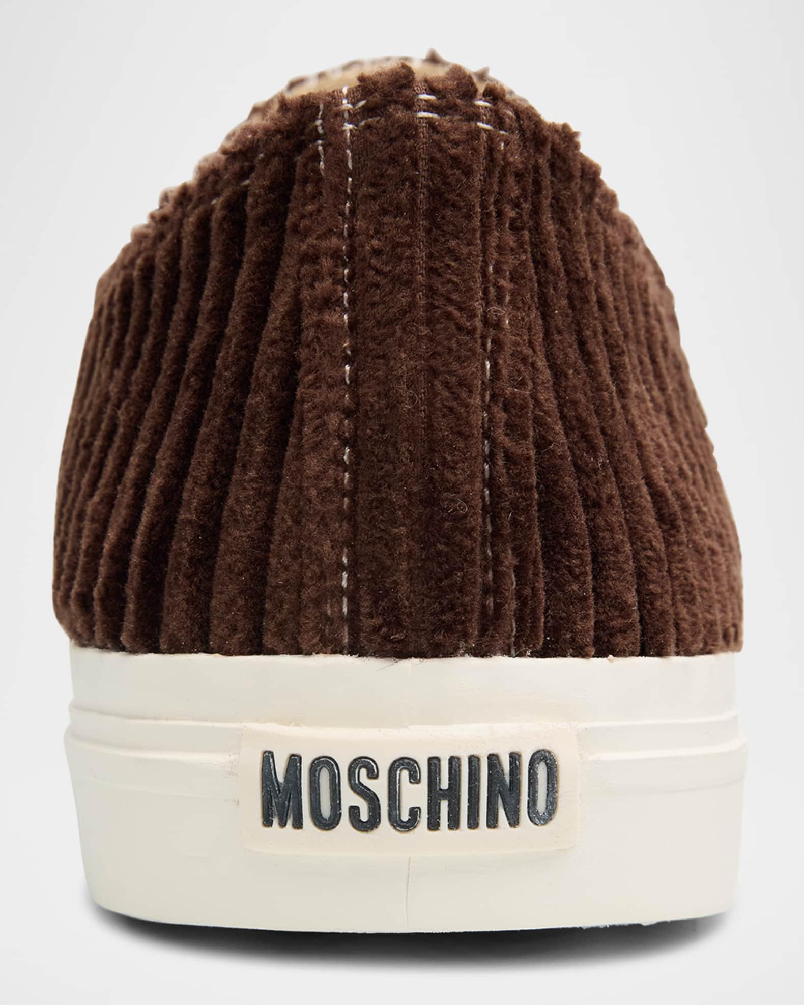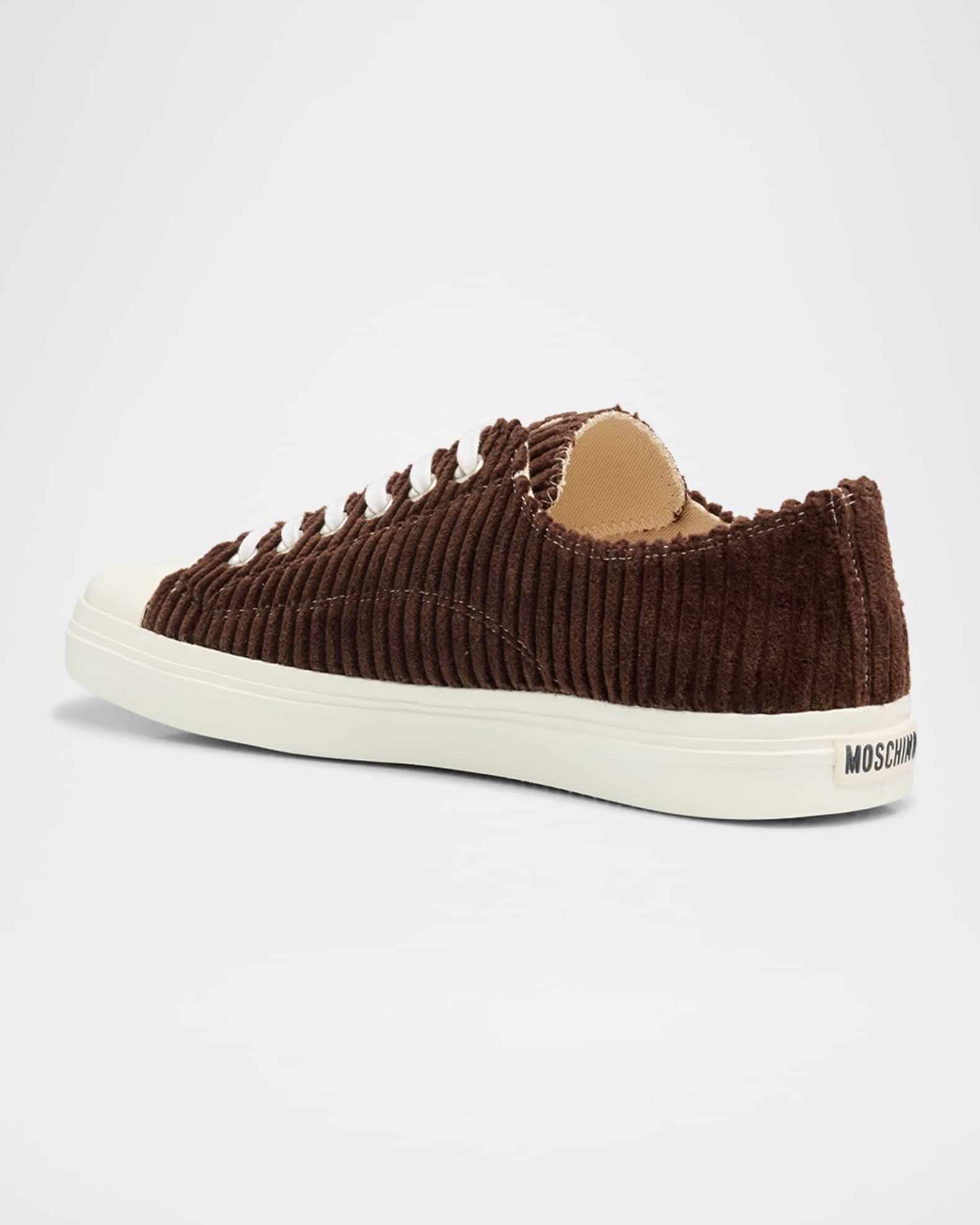 Moschino low-top sneakers in soft corduroy, highlighted with a classic cap toe Flat heel Lace-up vamp Branded insole Cotton lining Heel logo Rubber outsole Spot clean Made in Spain
