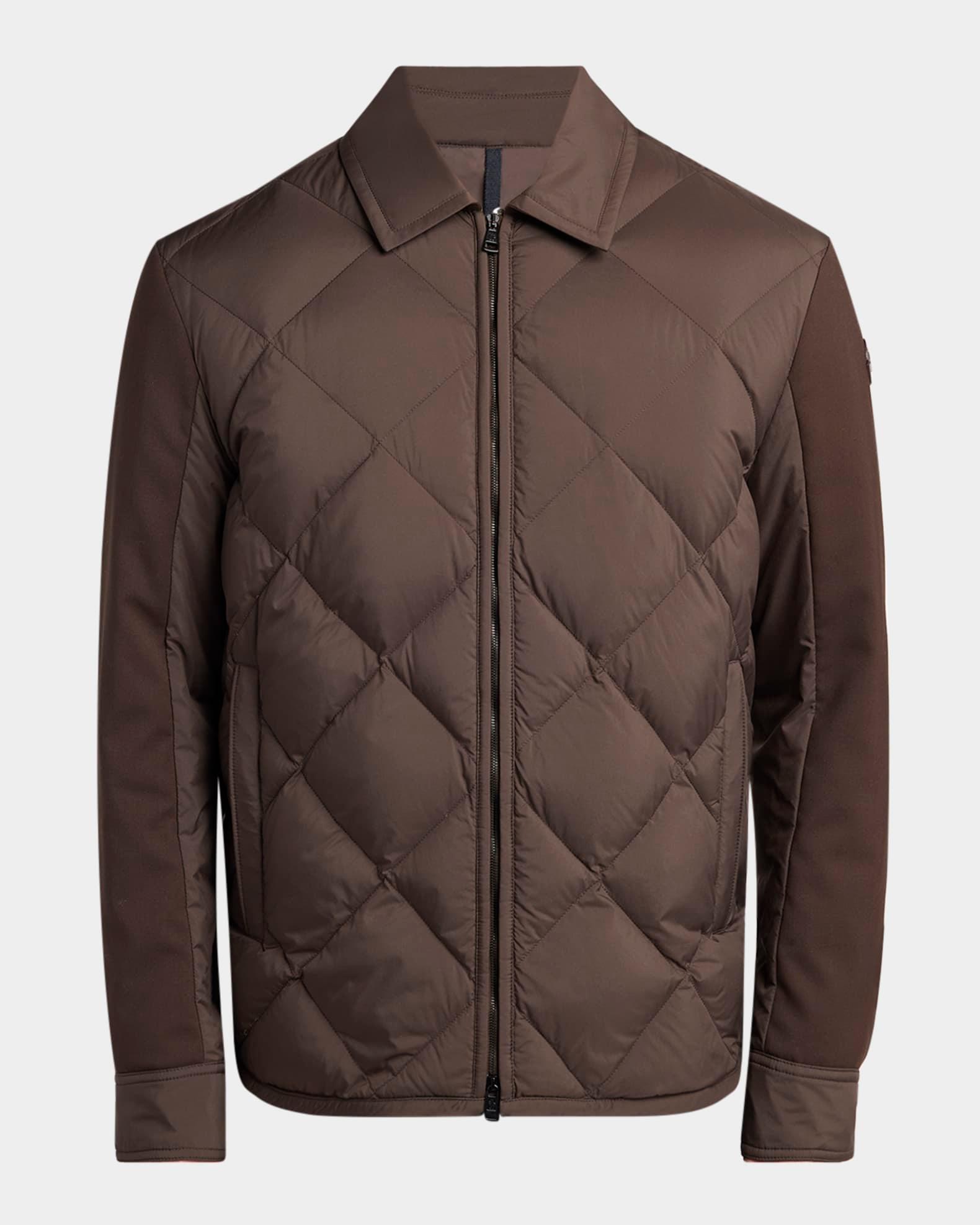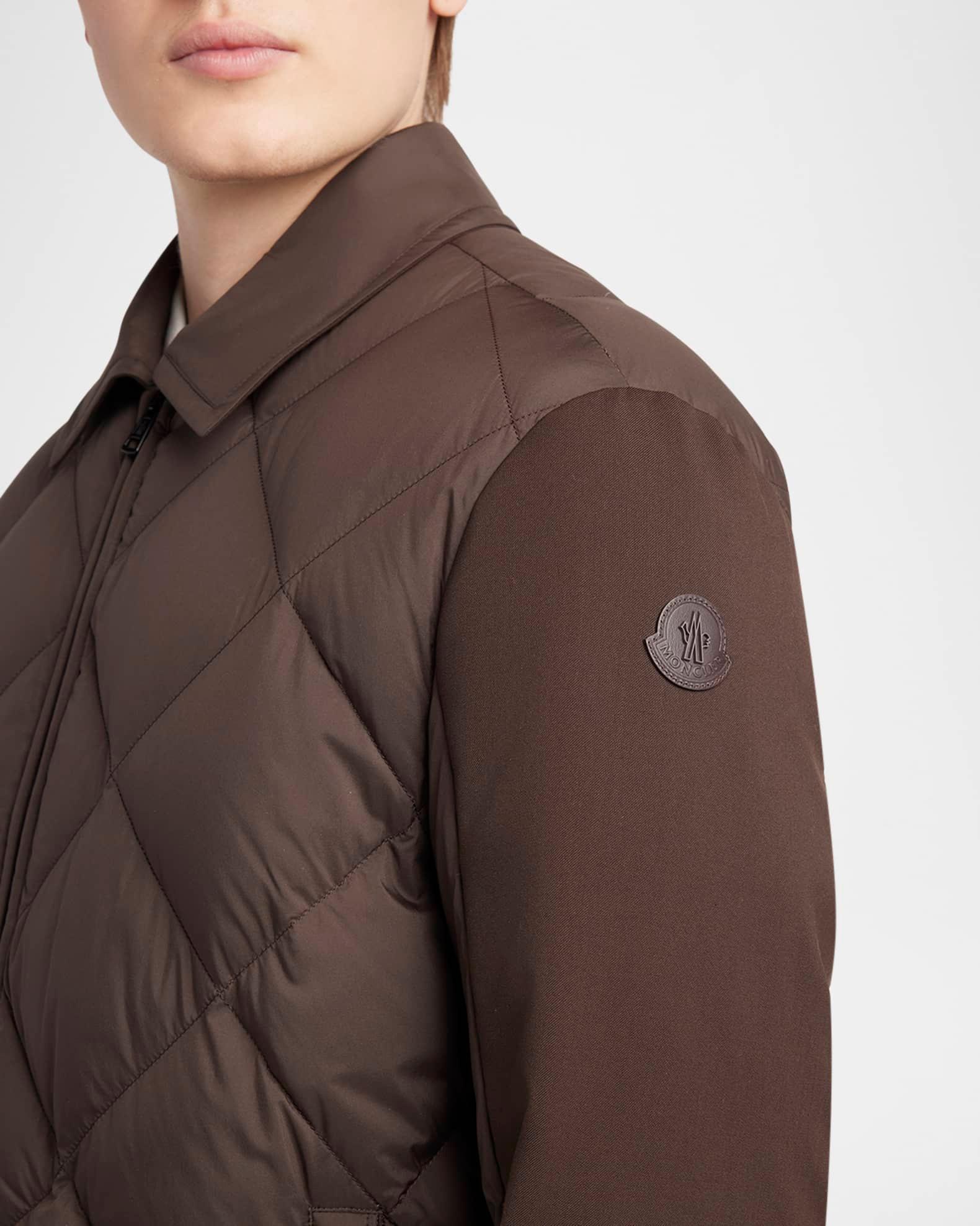 Moncler presents a new version of the shirt jacket from the Edit collection. A down/feather diamond quilt covers the body of the "Aiguille" while the paneled sleeves are smooth to the touch. Point collar Two-way zipper/snap placket Leather logo on the left arm Side welt pockets Adjustable cuffs Virgin wool/polyester/elastane Lining: Polyester Machine wash cold, professional cleaning recommended Made in Romania