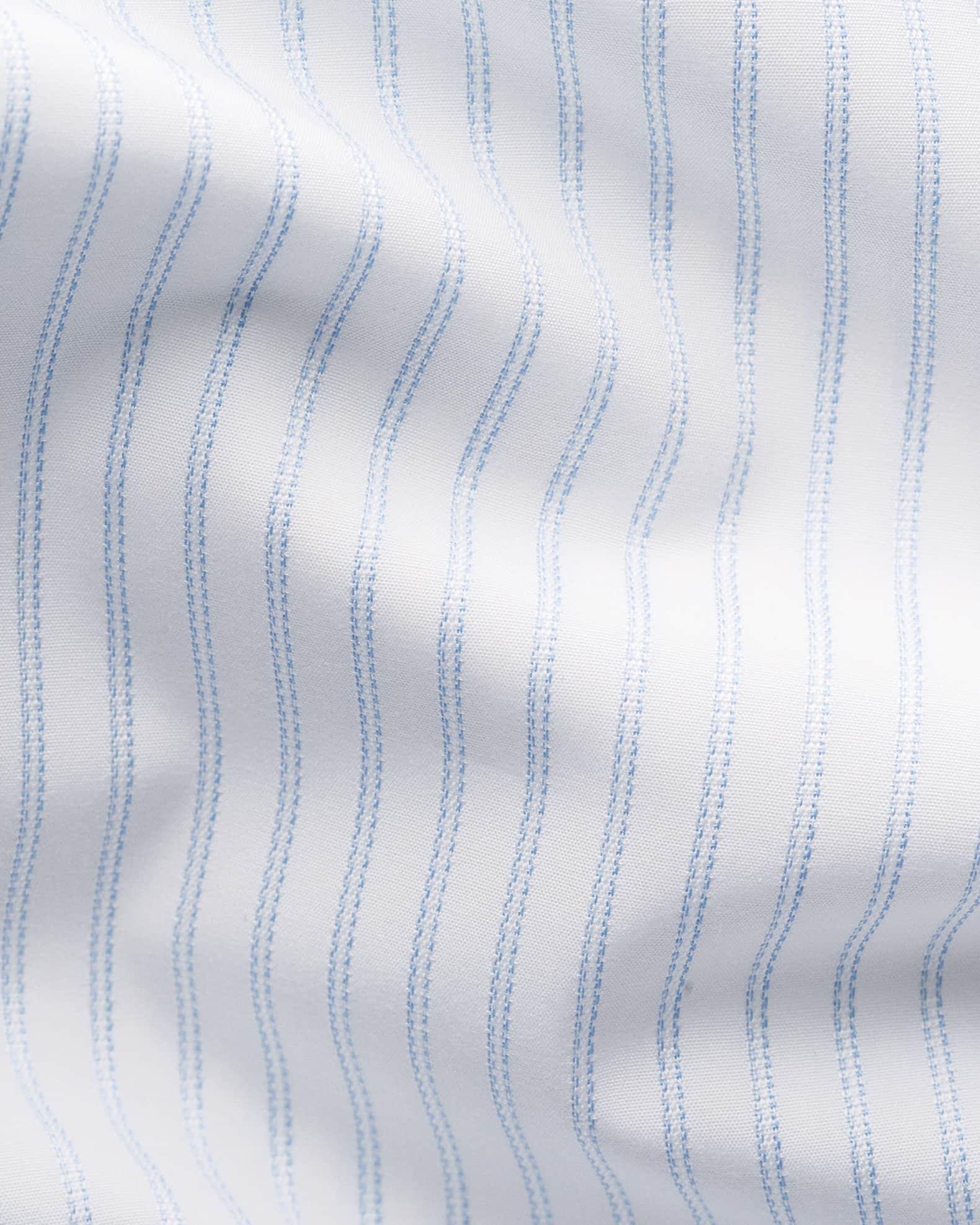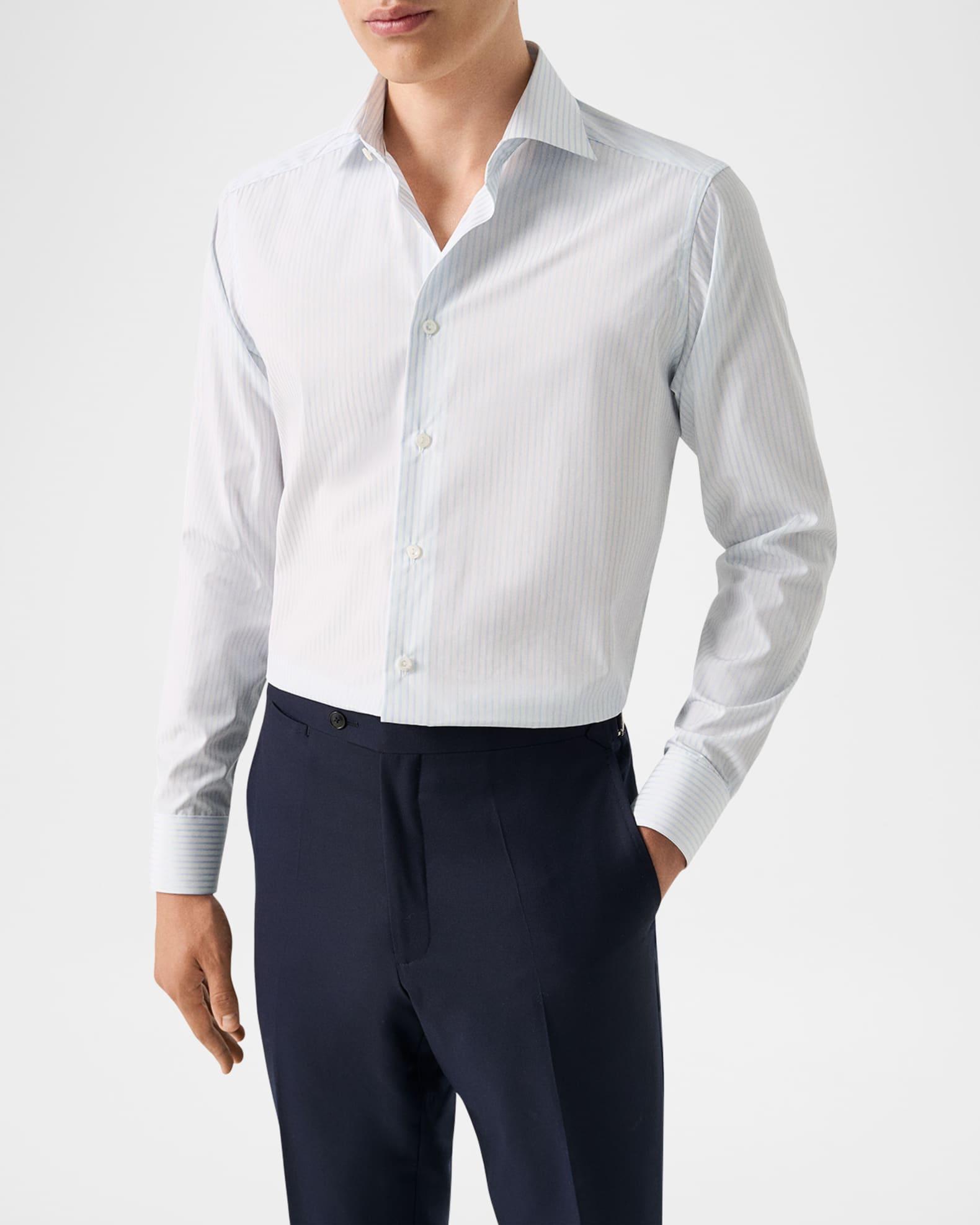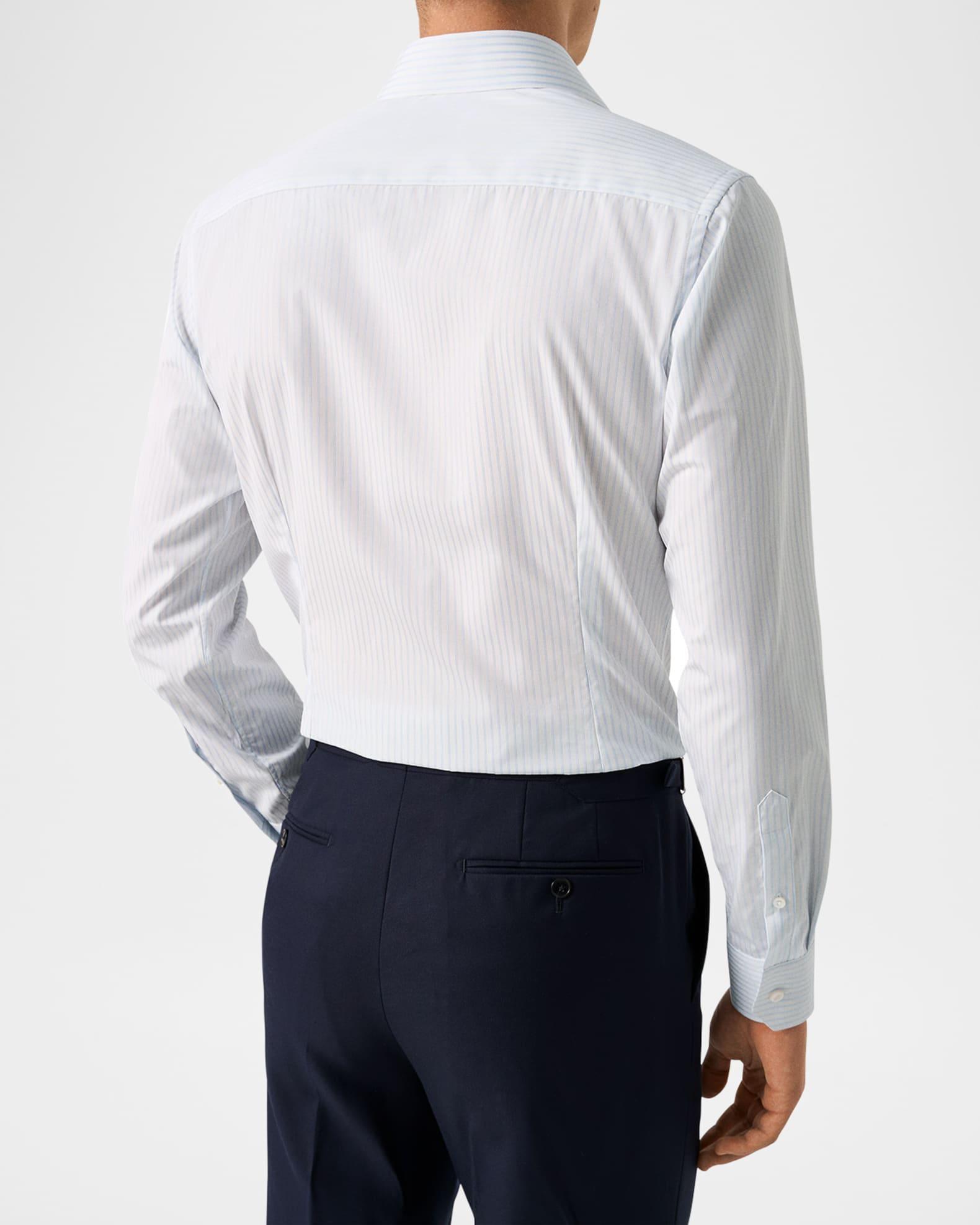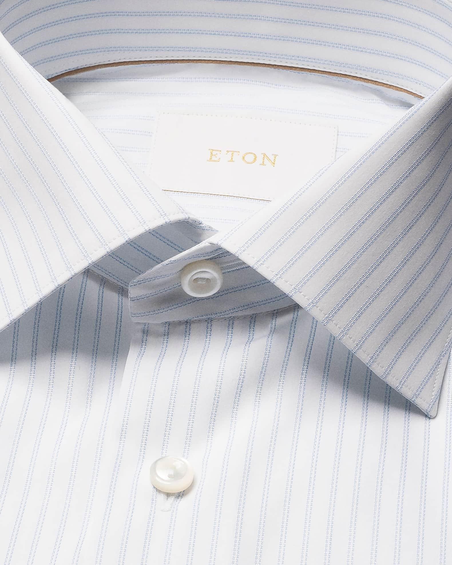 Eton dress shirt in high performance, crease-resistant fabric expertly woven in Italy Allover thin pinstripe print for a classic look Cut away collar with permanent collar stays Button placket Genuine mother-of-pearl buttons Darts at the back to adjust the width Convertible barrel cuff to French cuff Curved hem Slim fit Cotton Machine wash line dry Made in Italy