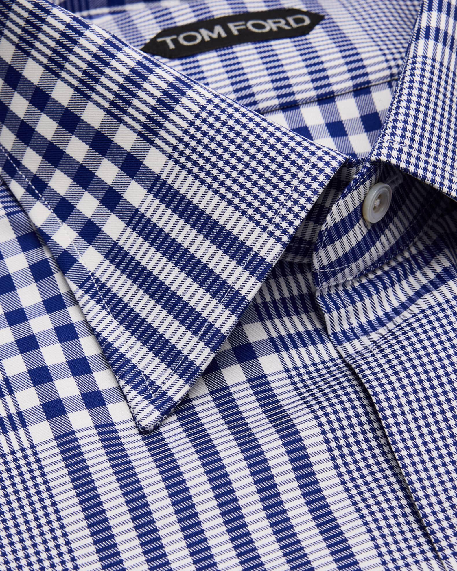 TOM FORD sport shirt spotlighting an expolded check pattern for visual interest Point collar Button placket Genuine mother-of-pearl buttons Long sleeves Double-button cuffs Cotton Professional cleaning recommended Made in Italy Proposition 65 warning for California residents
