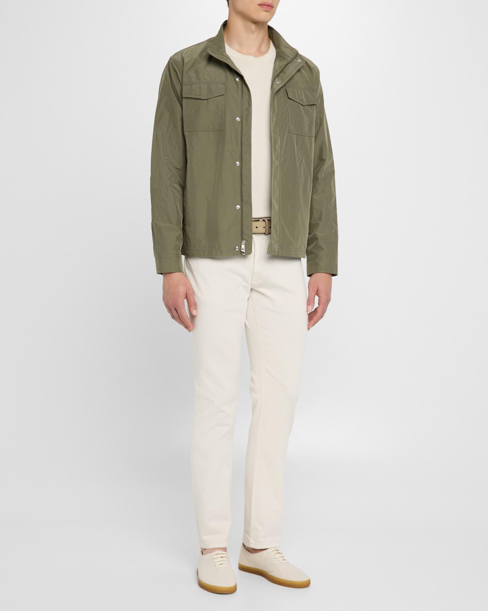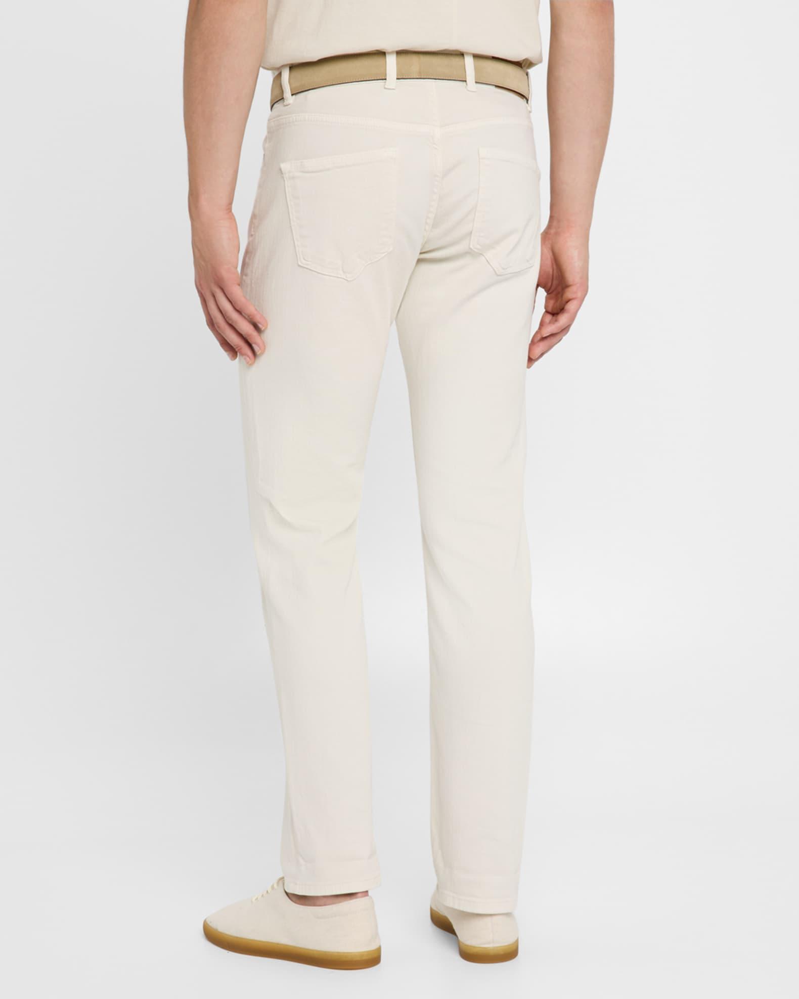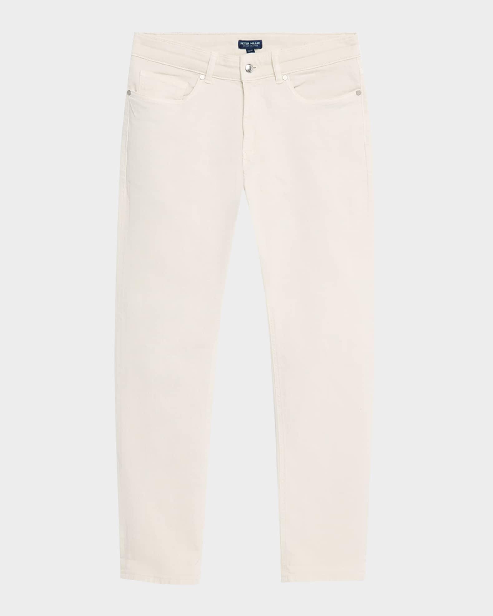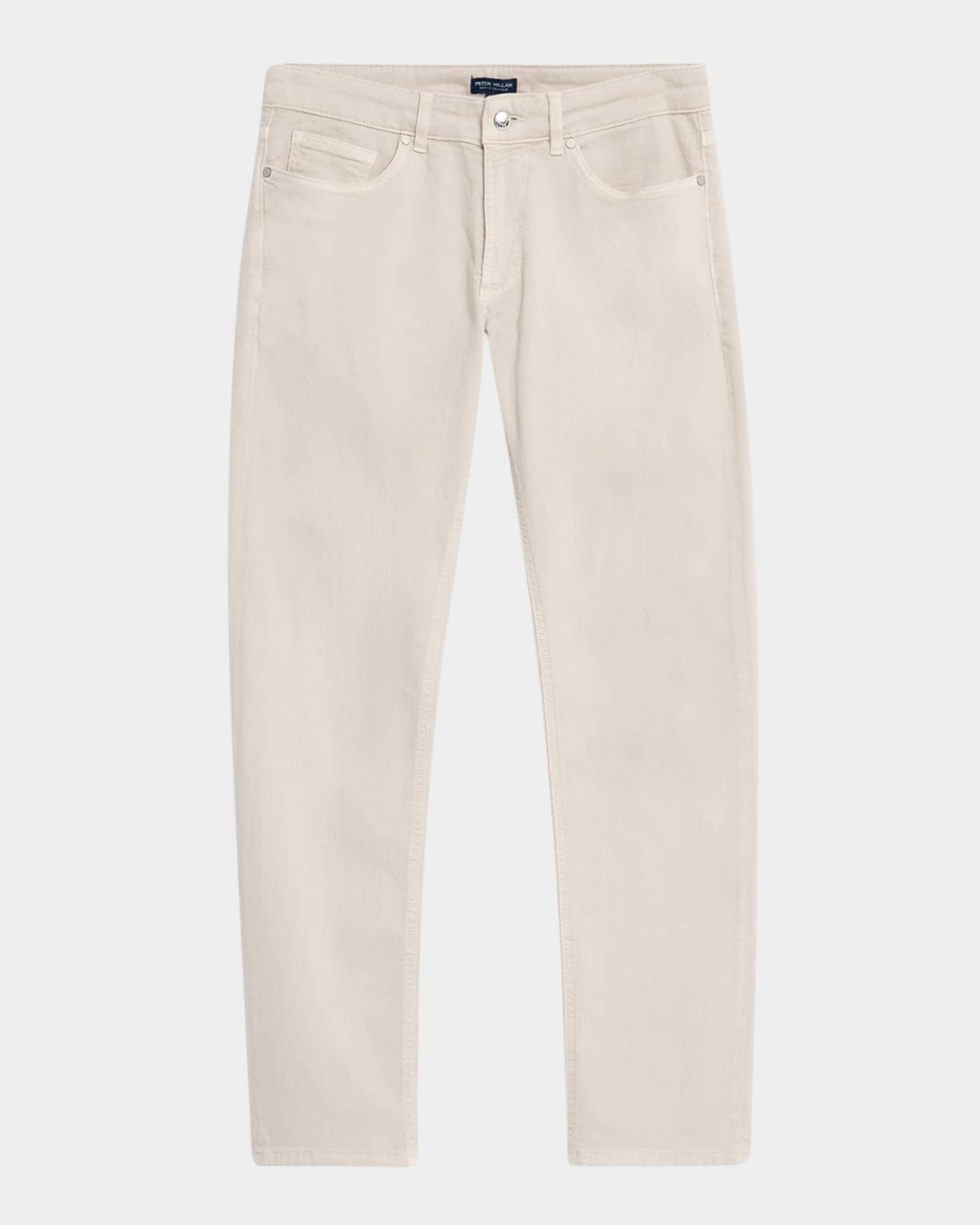 Peter Millar casual pants made from soft cotton with a hint of stretch for a comfortable finish A versatile alternative to traditional jeans with subtle texture in an ideal three-season weight Regular rise Flat front Five-pocket style Leather label Slim fit through tapered legs Full length Button-zip fly; belt loops Cotton/elastane Dry clean, machine wash cold Imported