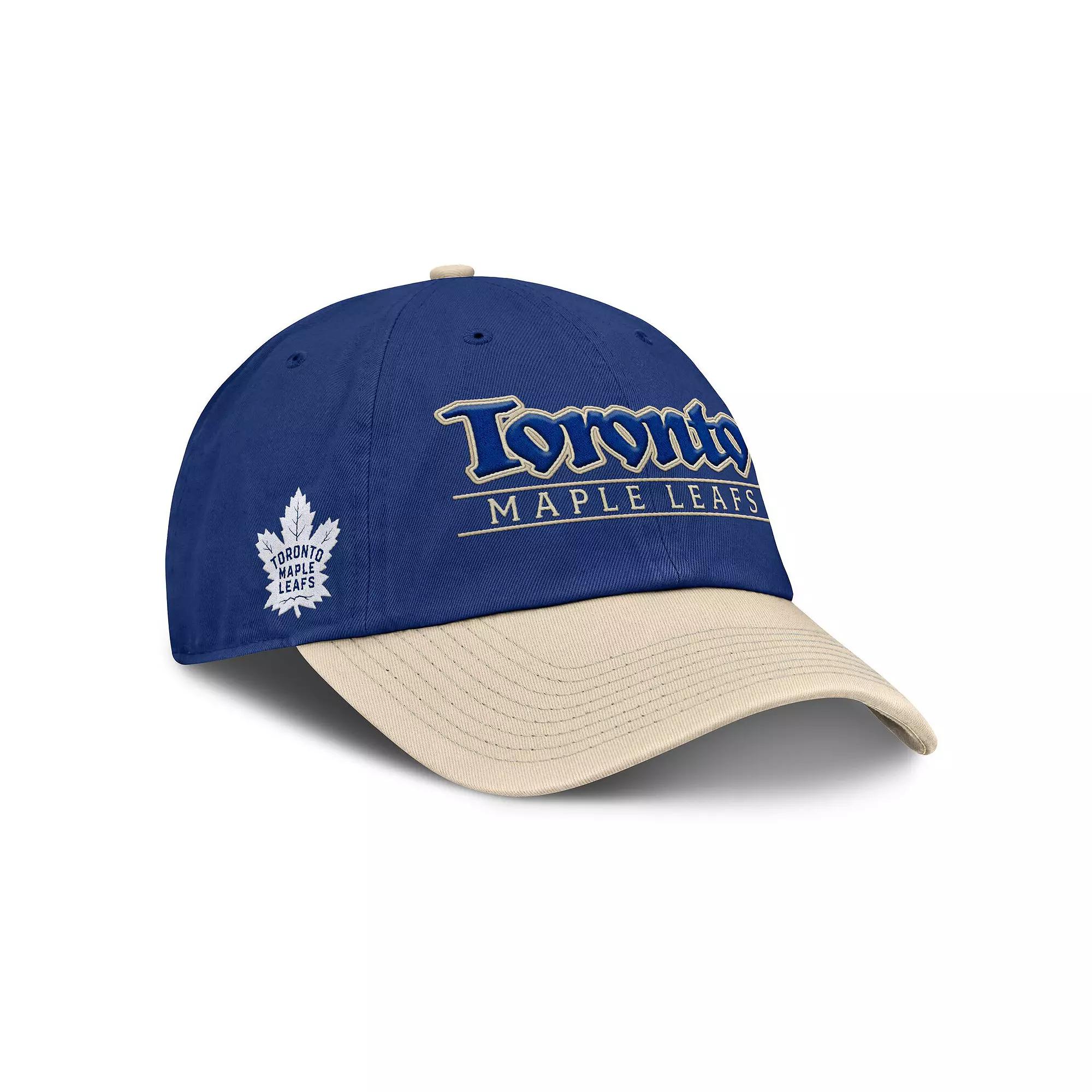 Show off your Toronto Maple Leafs pride with this Heritage Home Ice Two-Tone Adjustable Hat from Fanatics. This hat features a relaxed, unstructured fit with a low crown and curved bill for all-day comfort. With embroidered graphics that include raised details, this hat provides a stylish way to show your Toronto Maple Leafs pride.Show off your Toronto Maple Leafs pride with this Heritage Home Ice Two-Tone Adjustable Hat from Fanatics. This hat features a relaxed, unstructured fit with a low crown and curved bill for all-day comfort. With embroidered graphics that include raised details, this hat provides a stylish way to show your Toronto Maple Leafs pride.PRODUCT FEATURESUnstructured relaxed fitAdjustable fabric strap with snap buckleWipe clean with a damp clothOfficially licensedMaterial: 100% CottonBrand: FanaticsImportedEmbroidered graphics with raised detailsLow CrownSix panels with eyeletsCurved bill Size: One Size. Color: Mpl Blue. Gender: male. Age Group: adult.