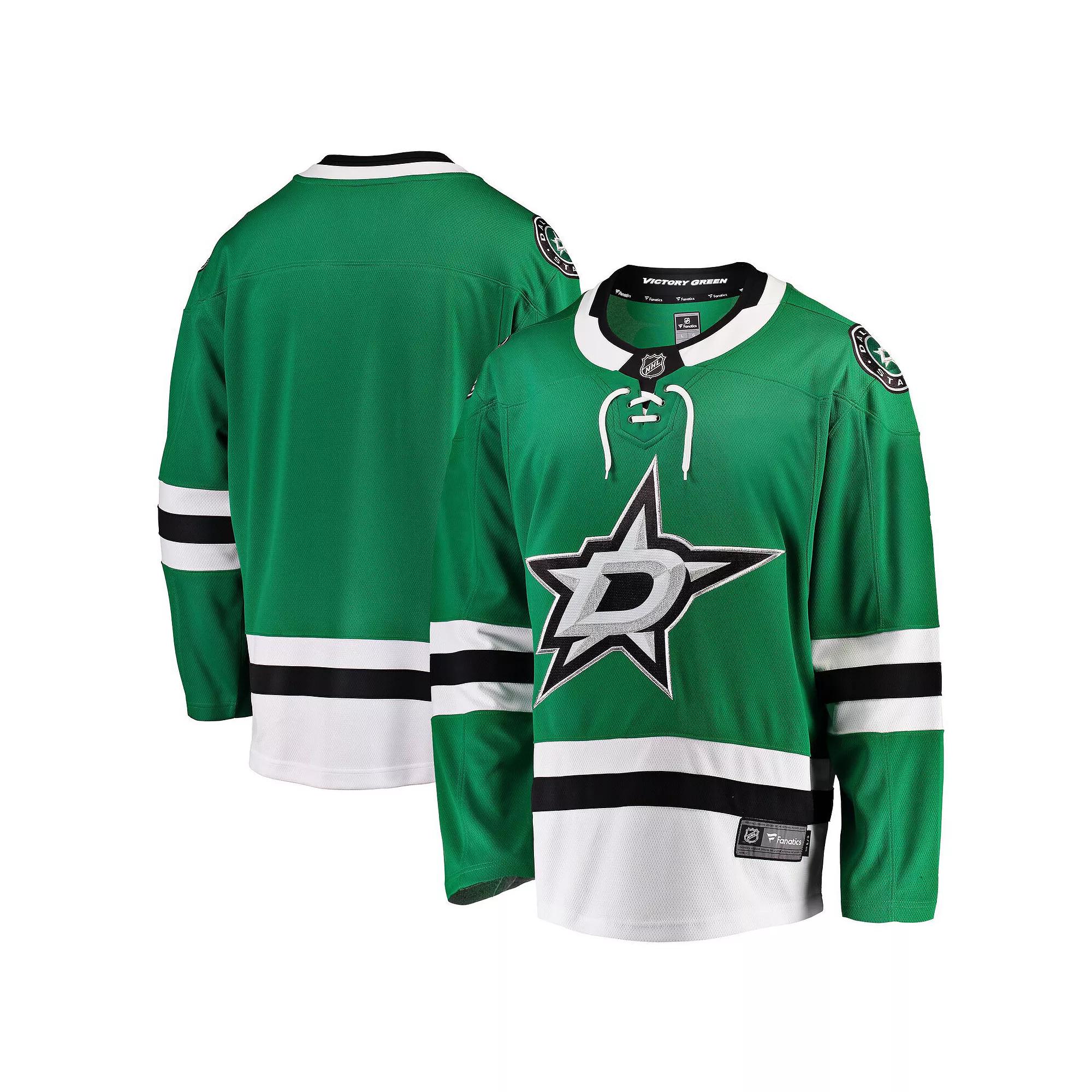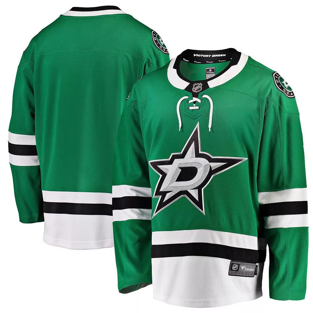 This Dallas Stars Home Breakaway jersey features crisp team graphics that match those worn by players on the ice, making you feel like a member of your favorite team. The Fanatics Branded fabric technologies will keep you comfortable while cheering the Dallas Stars to victory. This durable jersey is a great addition to any Dallas Stars collection.This Dallas Stars Home Breakaway jersey features crisp team graphics that match those worn by players on the ice, making you feel like a member of your favorite team. The Fanatics Branded fabric technologies will keep you comfortable while cheering the Dallas Stars to victory. This durable jersey is a great addition to any Dallas Stars collection.PRODUCT FEATURESTagless CollarBrand: Fanatics BrandedOfficially licensedImportedMachine wash, tumble dry lowCrew neckRounded droptail hemWoven jock tag above left hemContrast color stripes sewn into sleeves and lower bodiceEmbroidered fabric appliqueEmbroidered NHL shield at collarFront and back yoke seamsMaterial: 100% Polyester - Body; 96% Polyester/4% Spandex - CollarLong sleeve Color: Str Green. Gender: male. Age Group: adult.