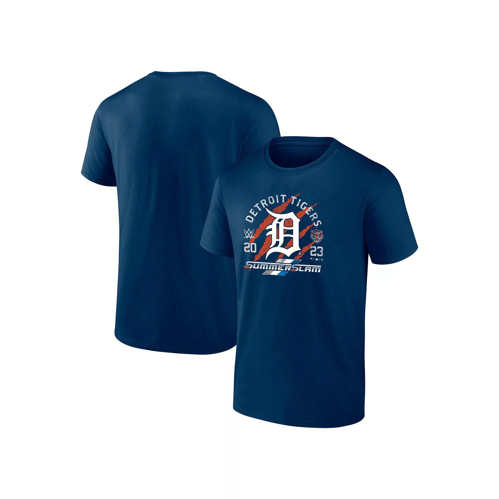 Relive the epic evening that the Biggest Party of the Summer rocked Ford Field by adding this commemorative Detroit Tigers X 2023 SummerSlam T-shirt from Fanatics Branded. It features event graphics along with multiple team graphics printed on the torso of this distinct crossover tee. One look at this tees fun graphics will reignite your appreciation for the Detroit Tigers, WWEs first Tribal Combat match, and much more.Relive the epic evening that the Biggest Party of the Summer rocked Ford Field by adding this commemorative Detroit Tigers X 2023 SummerSlam T-shirt from Fanatics Branded. It features event graphics along with multiple team graphics printed on the torso of this distinct crossover tee. One look at this tees fun graphics will reignite your appreciation for the Detroit Tigers, WWEs first Tribal Combat match, and much more.PRODUCT FEATURESBrand: Fanatics BrandedScreen print graphicsImportedMachine wash, tumble dry lowOfficially licensedCrew neckMaterial: 100% CottonShort sleeve Size: 4XL. Color: Navy. Gender: male. Age Group: adult.