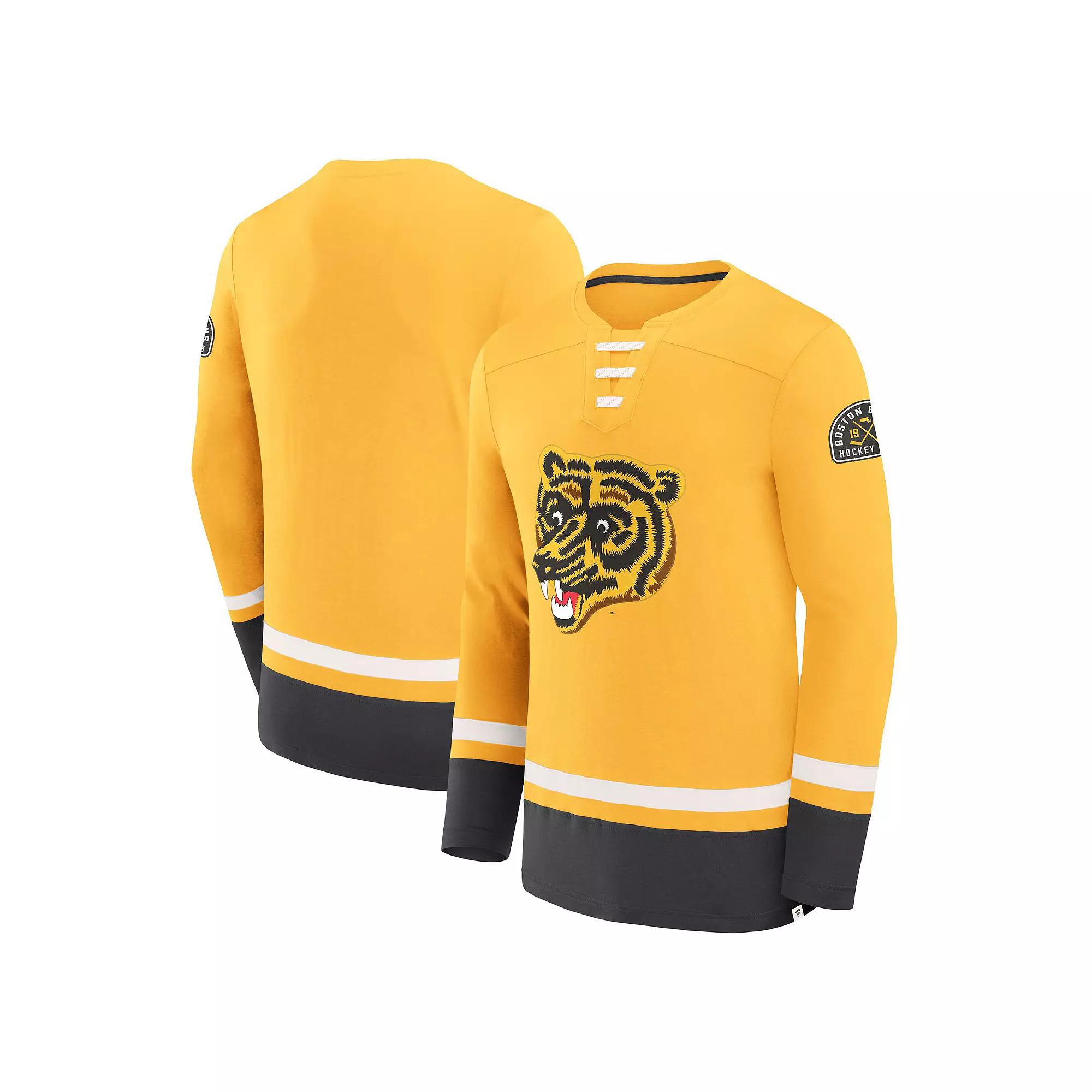 Represent your Boston Bruins in retro style with this Vintage High Point Long Sleeve T-Shirt by Fanatics. Its embroidered team appliques provide a textured, high-quality look that elevates the overall design. The contrast-color stripes add a traditional look to this Boston Bruins tee, reminiscent of classic hockey jerseys.Represent your Boston Bruins in retro style with this Vintage High Point Long Sleeve T-Shirt by Fanatics. Its embroidered team appliques provide a textured, high-quality look that elevates the overall design. The contrast-color stripes add a traditional look to this Boston Bruins tee, reminiscent of classic hockey jerseys.PRODUCT FEATURESMaterial: 100% Cotton JerseyImportedLong sleeveMachine wash, tumble dry lowOfficially licensedSewn-on, contrast-color stripesBrand: FanaticsEmbroidered team appliquesFaux-lace neckline provides the aesthetic of a jersey Color: Gold. Gender: male. Age Group: adult.