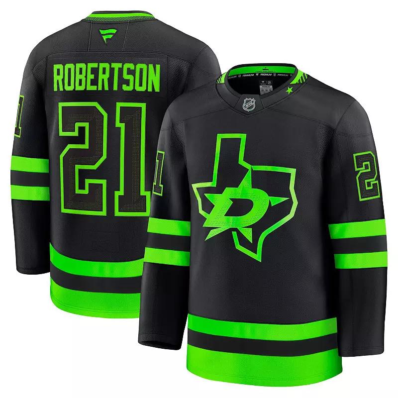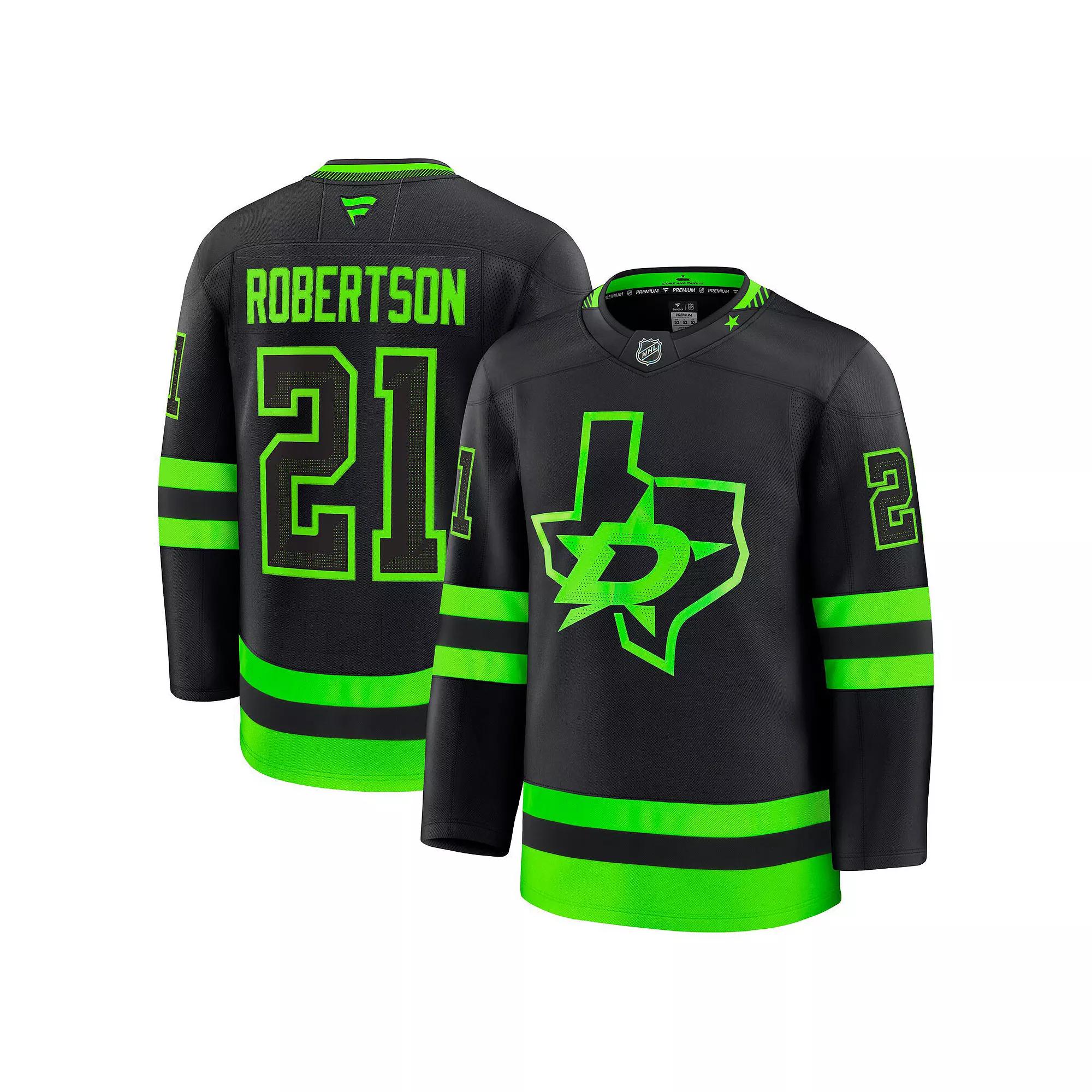 When you're watching the on-ice action, you need a jersey to match. With this Dallas Stars Fanatics Alternate Premium Jersey you get just that! This premium jersey is made for the loyal Dallas Stars fan like you and takes inspiration from what your team wears on gameday. Available in traditional colors, this Jason Robertson jersey possesses a more adjusted fit and mesh panels to enhance your comfort no matter where you enjoy the game!When you're watching the on-ice action, you need a jersey to match. With this Dallas Stars Fanatics Alternate Premium Jersey you get just that! This premium jersey is made for the loyal Dallas Stars fan like you and takes inspiration from what your team wears on gameday. Available in traditional colors, this Jason Robertson jersey possesses a more adjusted fit and mesh panels to enhance your comfort no matter where you enjoy the game!PRODUCT FEATURESMachine wash, tumble dry lowFanatics Premium JerseyJersey Color Style: AlternateSewn-down tackle twill with embroidered crest and shoulder patchesMaterial: 100% Polyester PiqueLong sleeveImportedOfficially licensedAll-new neck tape and jock tag designsRounded droptail hem with side ventsAuthentic tie-down fight strap inside lower backHolographic NHL Shield and embroidered Fanatics flag patchBrand: FanaticsPremium chassis is not as wide as Authentic Pro jersey, but still larger than Breakaway jersey Size: 50. Color: Str Black. Gender: male. Age Group: adult.