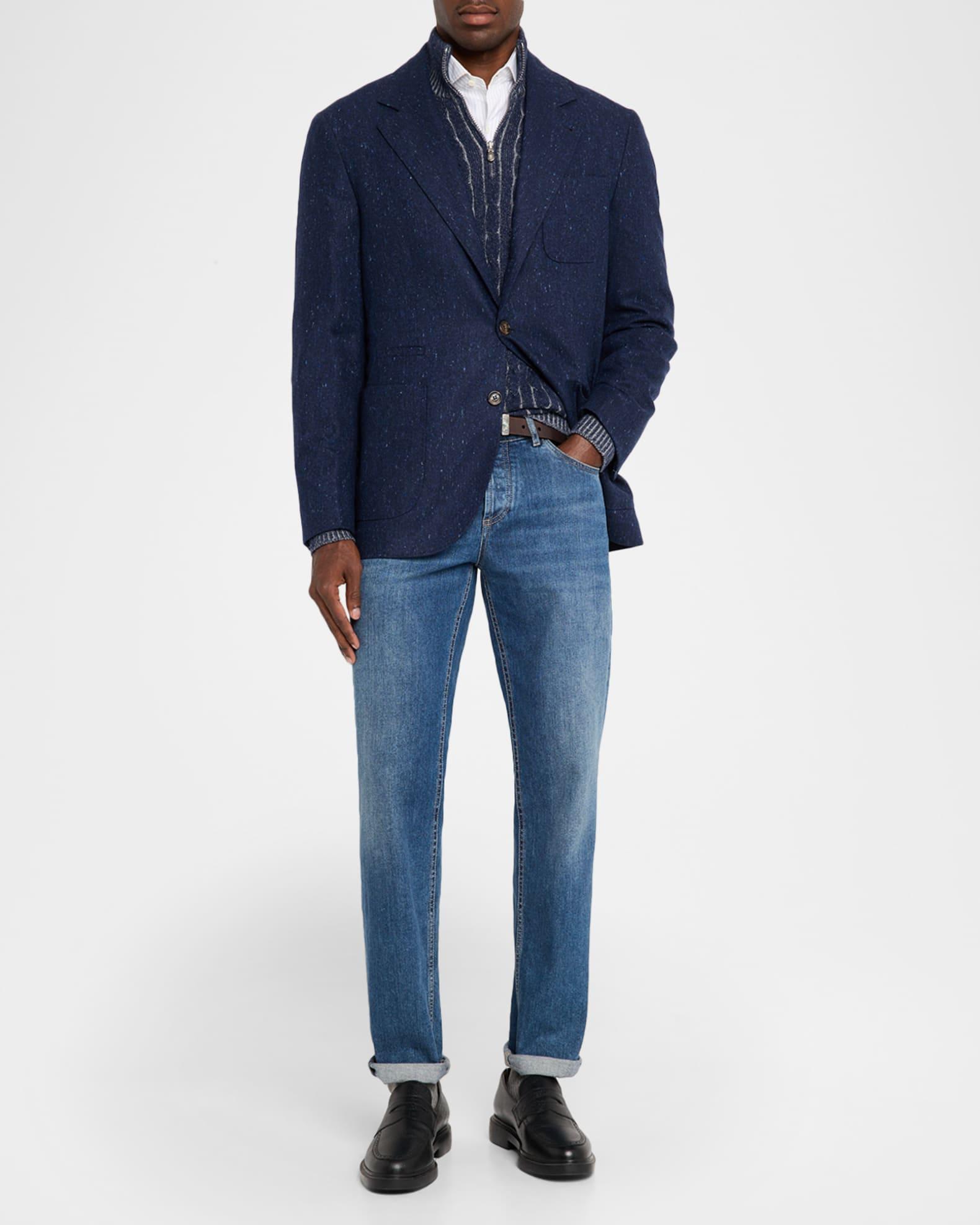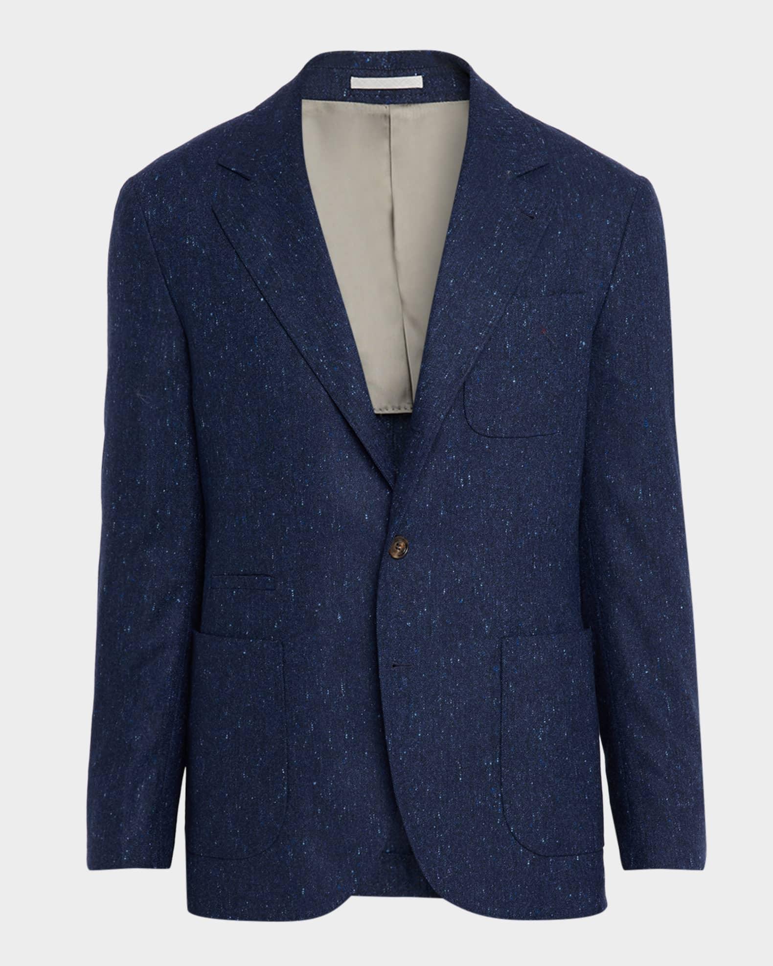 Flecked with color, the Brunello Cucinelli sport jacket is crafted in a wool-cashmere blend and then finished with buffalo horn buttons. Peak lapels Single-breasted front Three patch pockets Interior and exterior welt pockets Double-vented back Wool/cashmere Lining: Cupro Dry clean Made in Italy