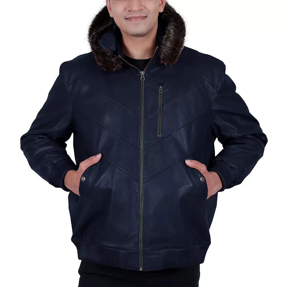 A cut above the rest. Instantly upgrade your look with this mens hooded leather jacket from Franchise Club. A cut above the rest. Instantly upgrade your look with this mens hooded leather jacket from Franchise Club. Midweight warmth rating Lambskin leather construction Attached hood with faux-fur collar Zippered chest pocket Zip front 3-pocket Long sleevesFIT & SIZING Classic fitFABRIC & CARE Shell: Aniline lambskin leather Lining: satin Dry clean Imported Color: Navy. Gender: male. Age Group: adult. Material: Polyester.