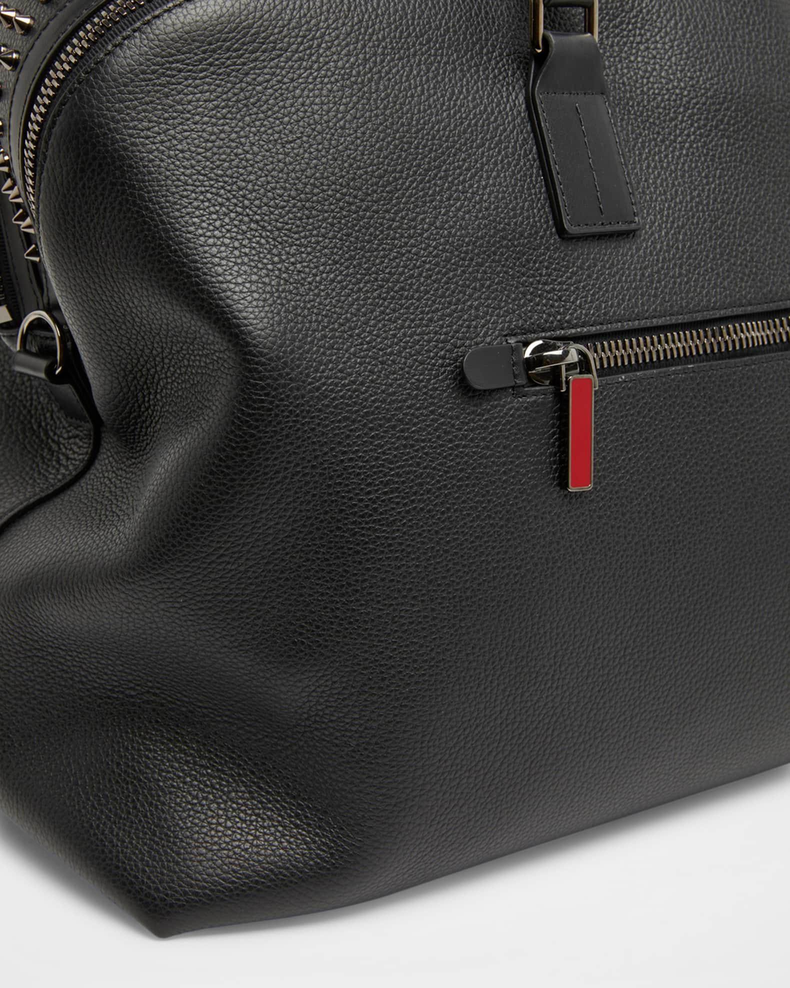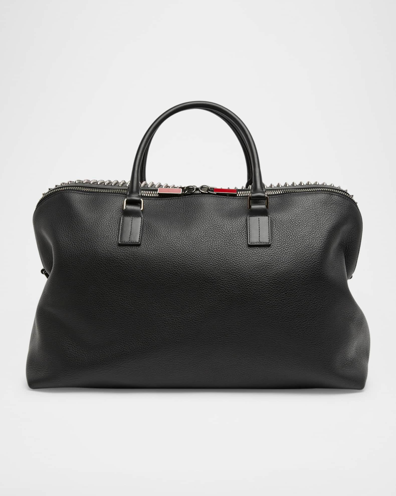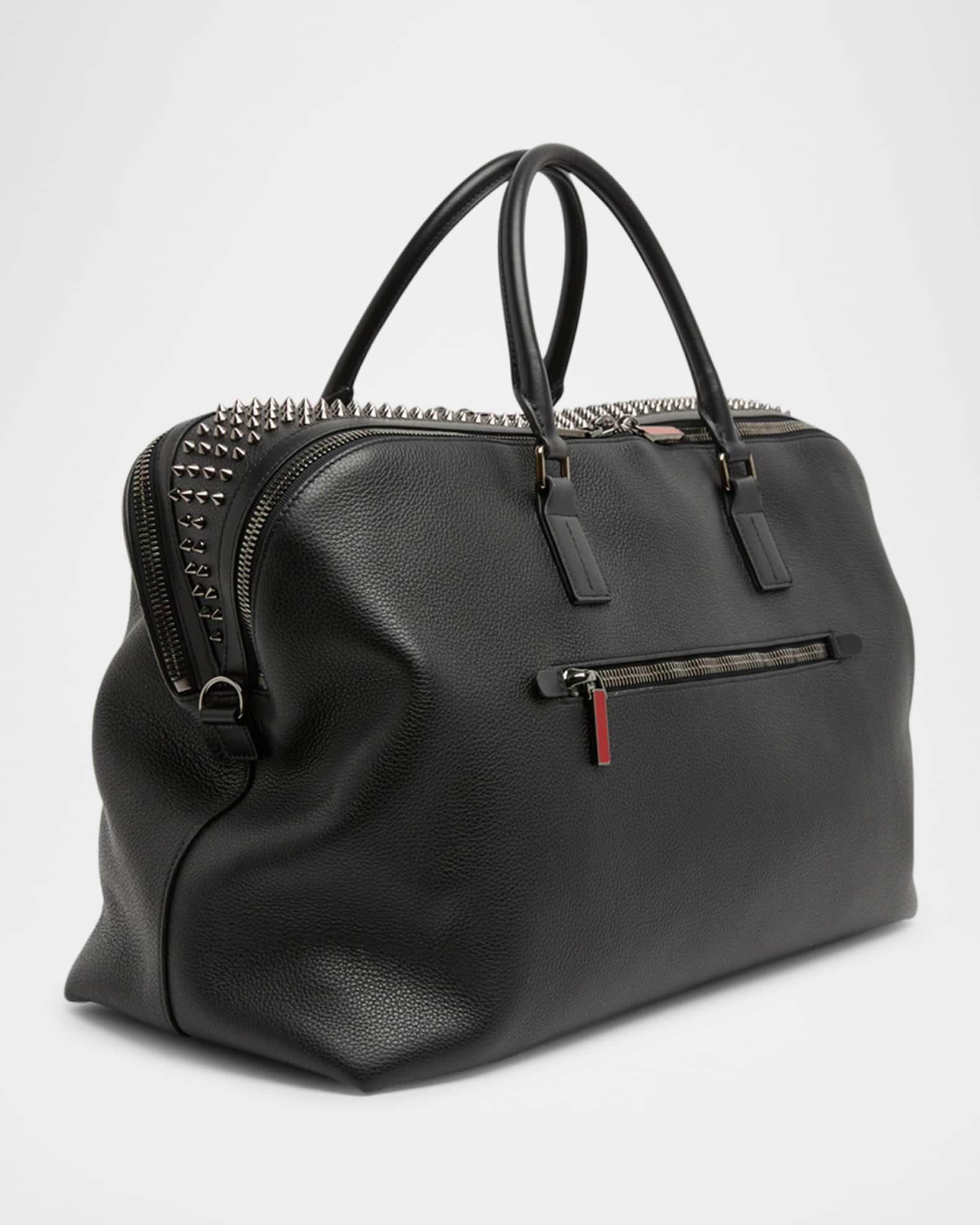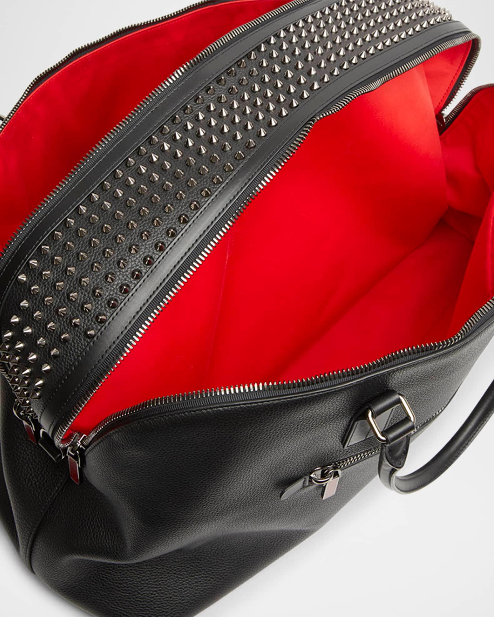 Christian Louboutin "Funky" weekender bag in grained calf leather The center panel features signature Empire spikes Two rolled top handles Adjustable, detachable crossbody strap Two-way zip closure Exterior, one zip pocket Interior, two main zip compartments Signature Loubi red lining Approx. 12.6"H x 20.9"W x 8.3"D Made in Italy