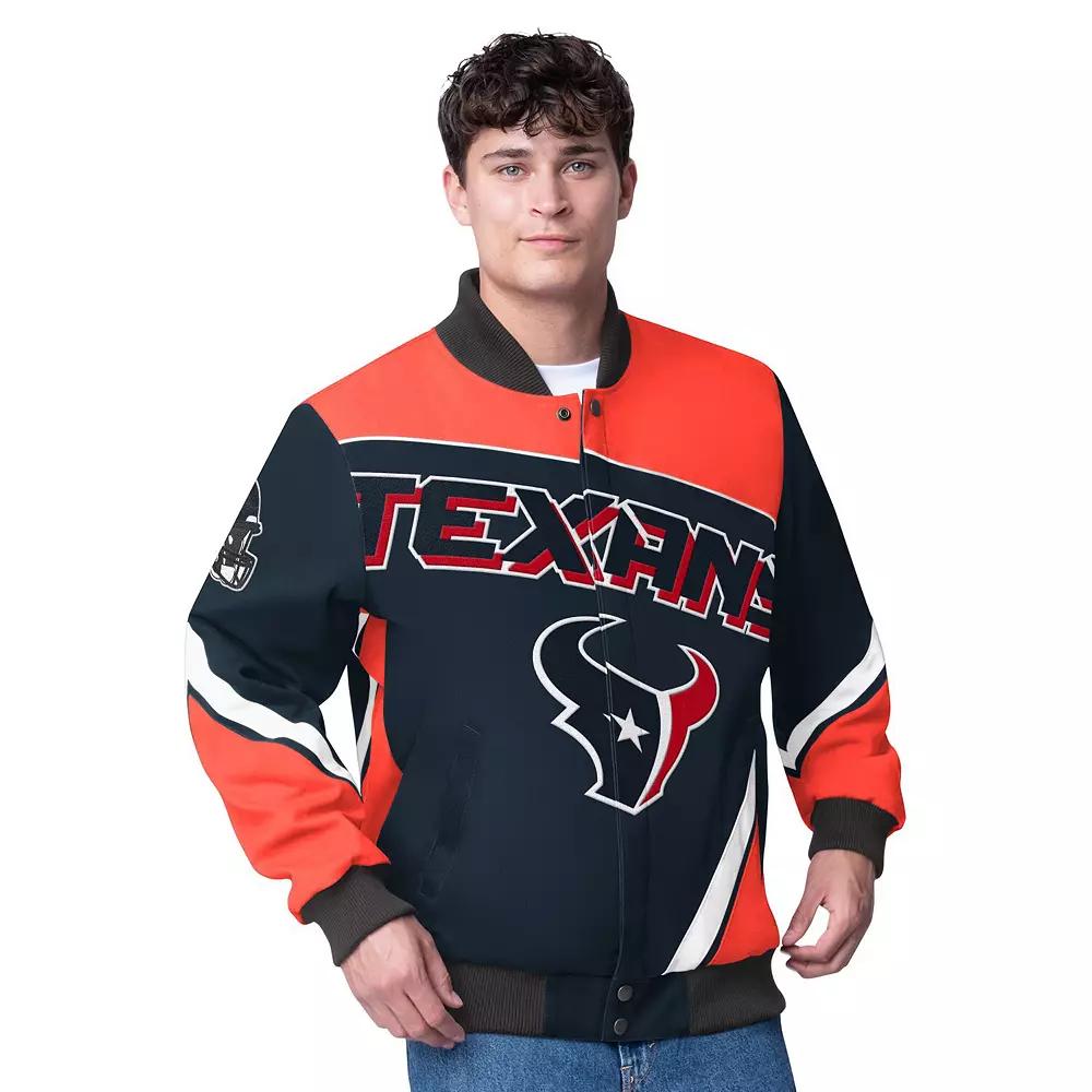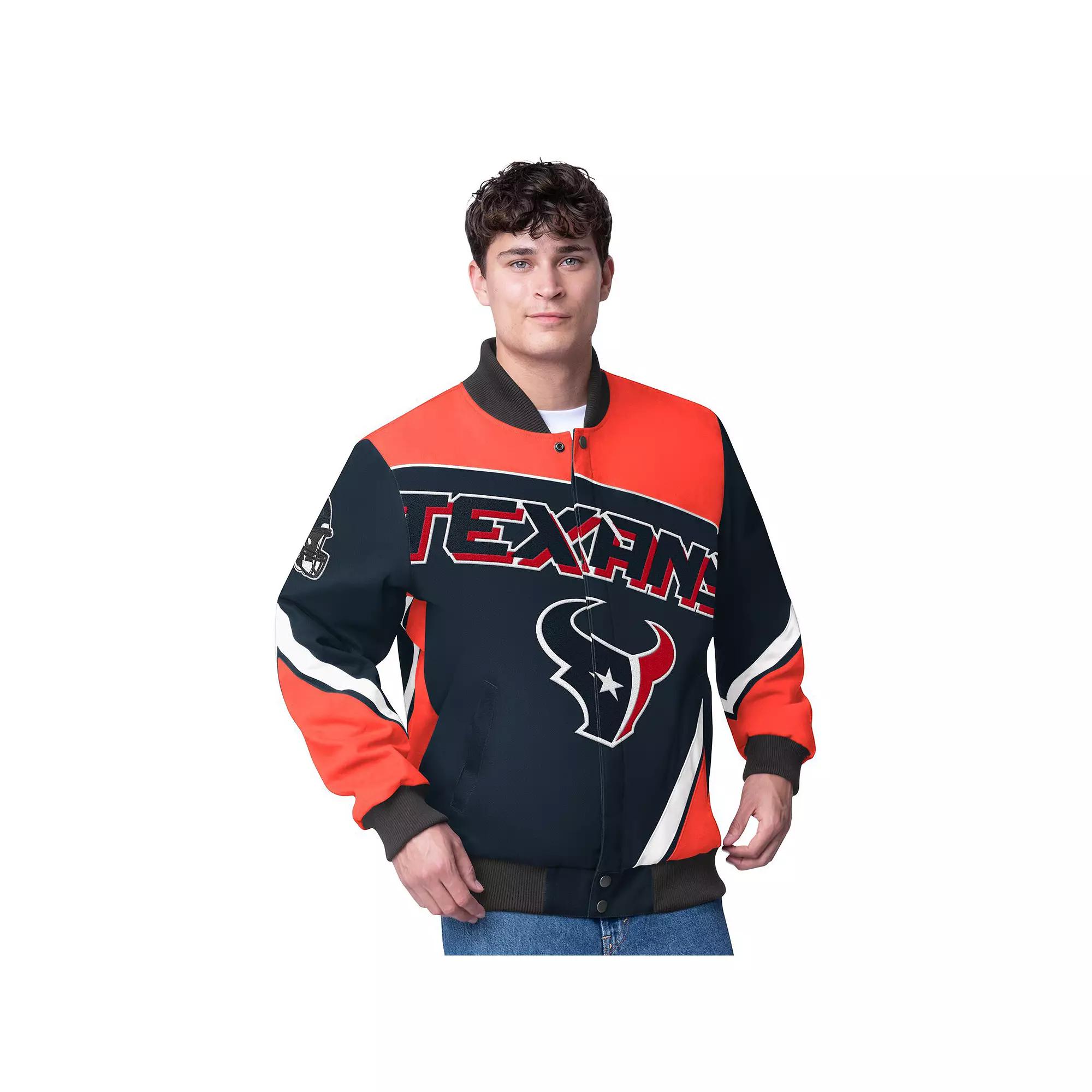 Gear up for game day with this Houston Texans Maximum Racing Full-Snap Jacket from G-III Extreme. This heavyweight jacket is perfect for braving the elements on game day, featuring a quilted lining and a stand-up collar for extra warmth. Tackle twill appliques and embroidered details showcase your Houston Texans pride, making it clear who you're rooting for.Gear up for game day with this Houston Texans Maximum Racing Full-Snap Jacket from G-III Extreme. This heavyweight jacket is perfect for braving the elements on game day, featuring a quilted lining and a stand-up collar for extra warmth. Tackle twill appliques and embroidered details showcase your Houston Texans pride, making it clear who you're rooting for.PRODUCT FEATURESFull SnapLong sleeveOfficially licensedMaterial: 100% Cotton - Shell; 100% Polyester - Filler and Lining; 99% Polyester/1% Spandex - Rib KnitLocker loop at interior back neckRibbed knit collar, cuffs and waist hemMachine washEmbroidered tackle twill applique at both sleevesStand-up collarBrand: G-III ExtremeTackle twill applique team logo, name and city on chest and backQuilted liningHeavyweight jacket suitable for cold temperaturesOne interior pocket with hook and loop closureTwo side pocketsImportedOne interior slip pocket Size: XL. Color: Navy. Gender: male. Age Group: adult.