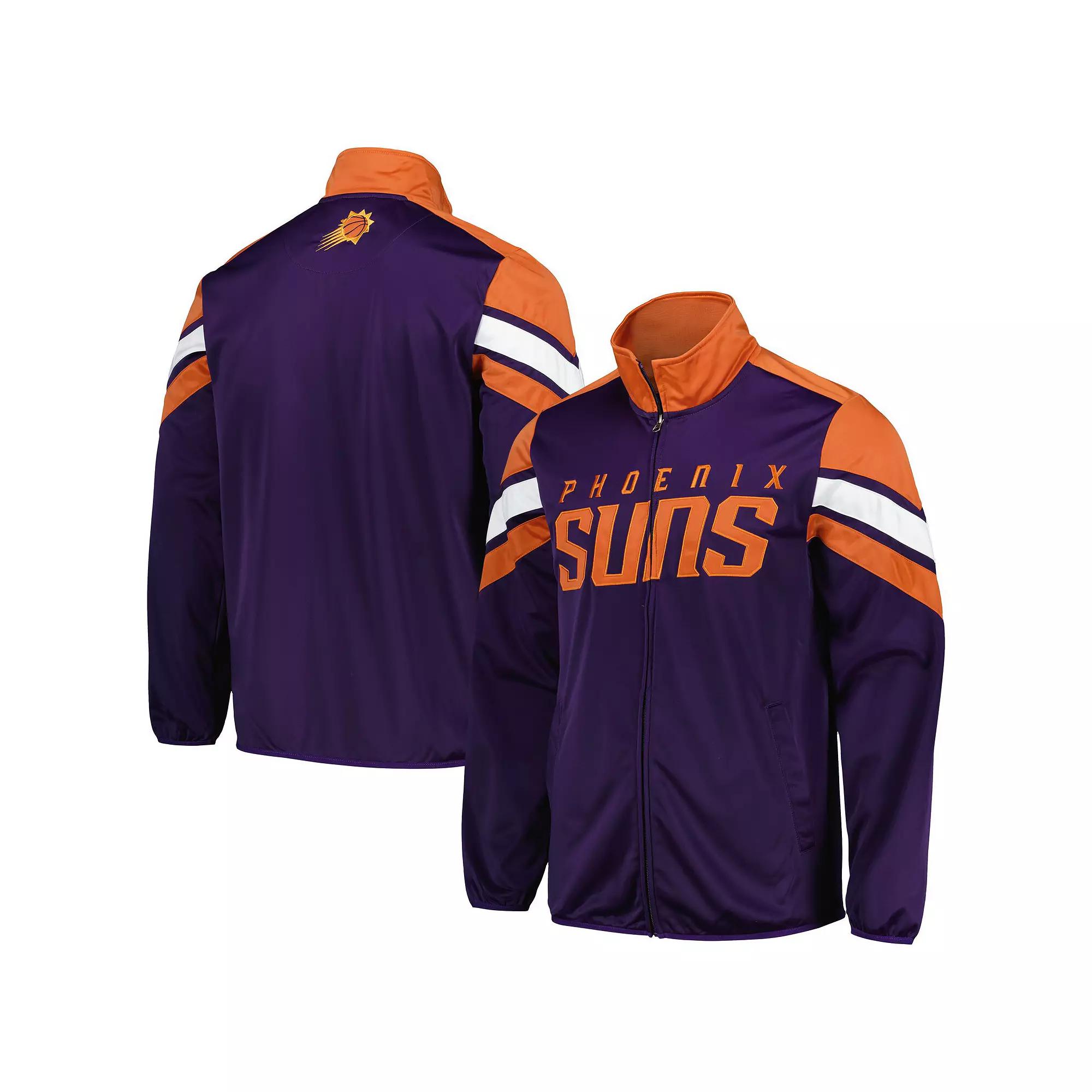 Elevate your gameday style with the G-III Sports by Carl Banks Phoenix Suns Game Ball Full-Zip Track Jacket. This lightweight jacket features embroidered Phoenix Suns graphics and fabric appliques, along with sewn-on stripes and elastic cuffs and hem for a comfortable fit. Whether youre at Footprint Center or watching from home, this jacket will keep you comfortable and stylish while you cheer on the Phoenix Suns.Elevate your gameday style with the G-III Sports by Carl Banks Phoenix Suns Game Ball Full-Zip Track Jacket. This lightweight jacket features embroidered Phoenix Suns graphics and fabric appliques, along with sewn-on stripes and elastic cuffs and hem for a comfortable fit. Whether youre at Footprint Center or watching from home, this jacket will keep you comfortable and stylish while you cheer on the Phoenix Suns.PRODUCT FEATURESMaterial: 100% PolyesterOfficially licensedMachine wash, tumble dry lowLightweight jacket suitable for mild temperaturesTwo front pocketsSewn-on stripesImportedFull ZipStand-up collarElastic cuffs and hemLong sleeveEmbroidered fabric appliquesBrand: G-III Sports by Carl BanksTwo interior pocketsEmbroidered graphics Size: XL. Color: Phx Purple. Gender: male. Age Group: adult.