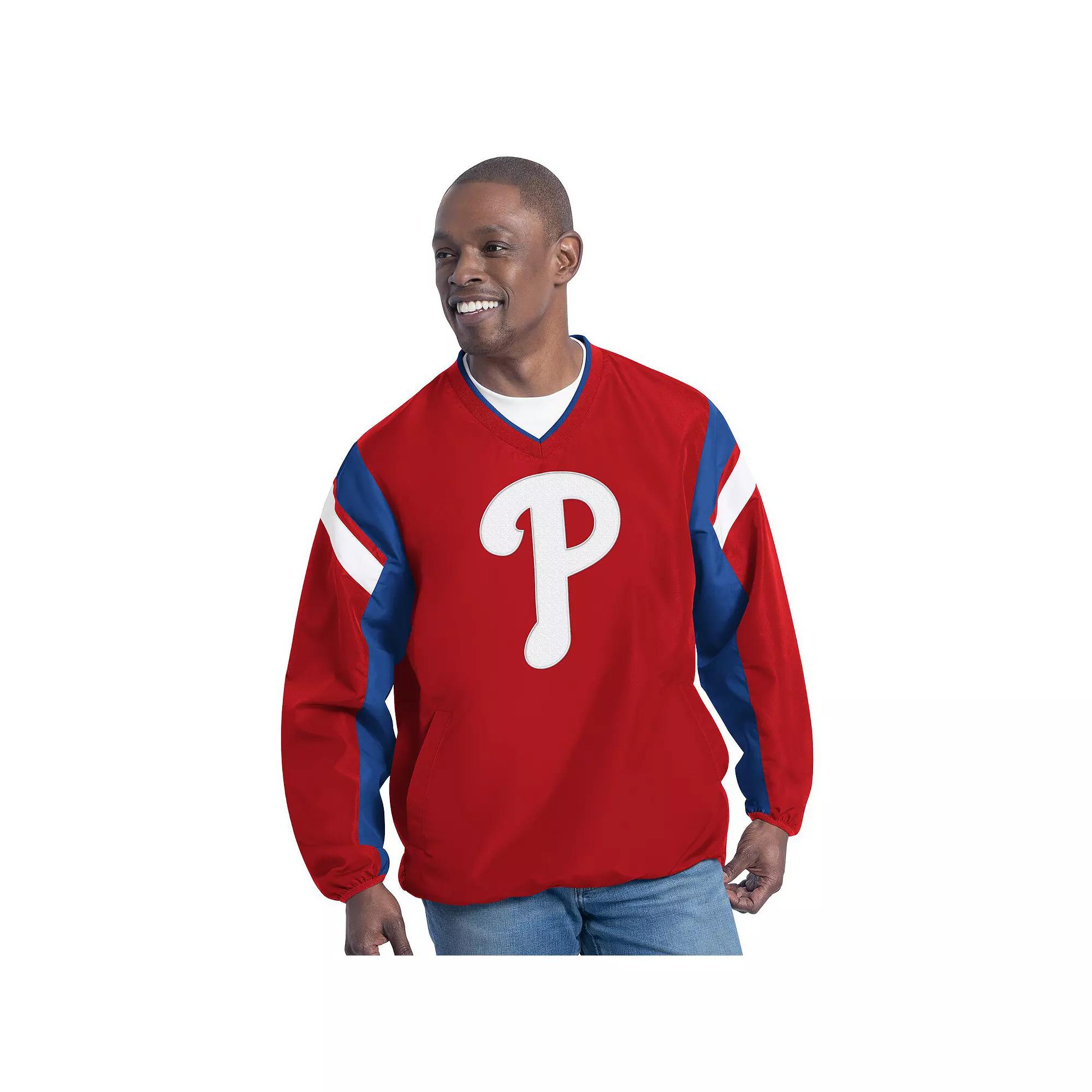 Stay warm while repping your Philadelphia Phillies with this G-III Sports by Carl Banks Double Coverage V-Neck Pullover. This midweight pullover is perfect for moderate temperatures, making it an ideal layering piece for those cool evenings at the ballpark. The large fabric applique embroidered across the chest, along with sewn-on, contrast-color stripes, creates a bold and stylish look that will let everyone know you're a true Philadelphia Phillies fan.Stay warm while repping your Philadelphia Phillies with this G-III Sports by Carl Banks Double Coverage V-Neck Pullover. This midweight pullover is perfect for moderate temperatures, making it an ideal layering piece for those cool evenings at the ballpark. The large fabric applique embroidered across the chest, along with sewn-on, contrast-color stripes, creates a bold and stylish look that will let everyone know you're a true Philadelphia Phillies fan.PRODUCT FEATURESVertical zipper on right side hemBrand: G-III Sports by Carl BanksMachine wash, tumble dry lowEmbroidered team wordmark at back neckContrast-color insets on sleevesLarge fabric applique embroidered across chestMesh liningLong sleeveMaterial: 100% PolyesterSewn-on, contrast-color stripesMidweight pullover suitable for moderate temperaturesOfficially licensedTwo front pocketsPulloverImportedV-neck Size: XL. Gender: male. Age Group: adult.
