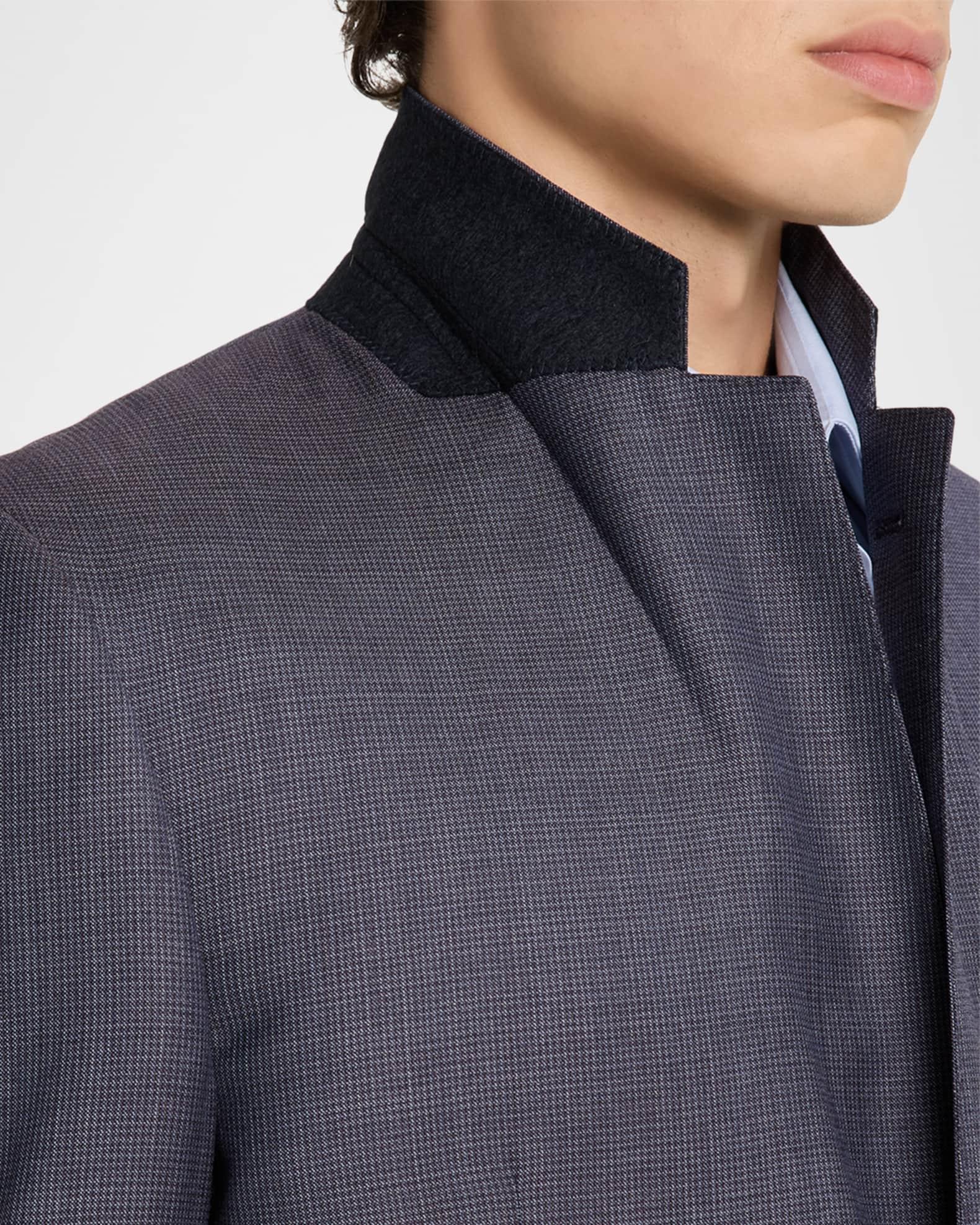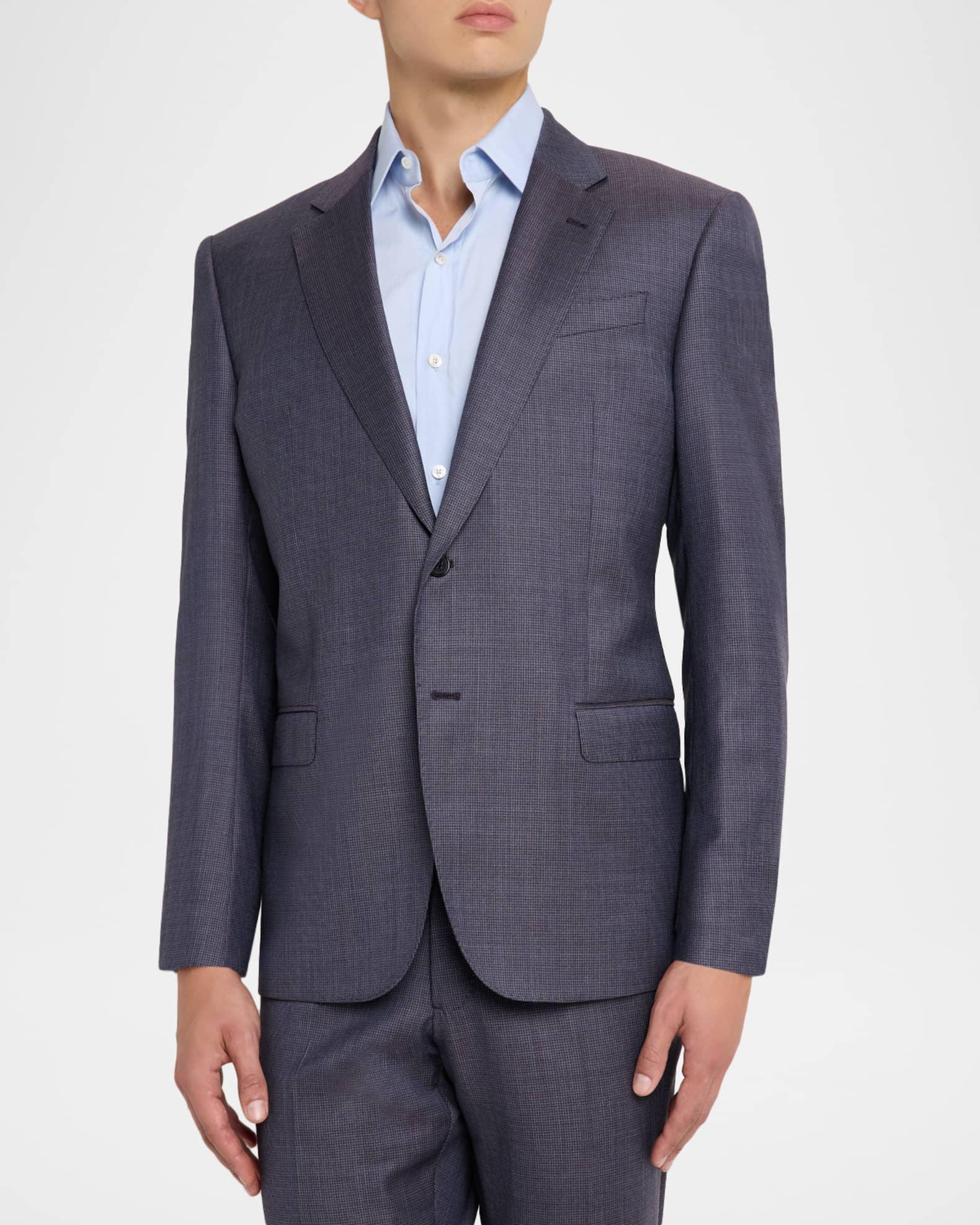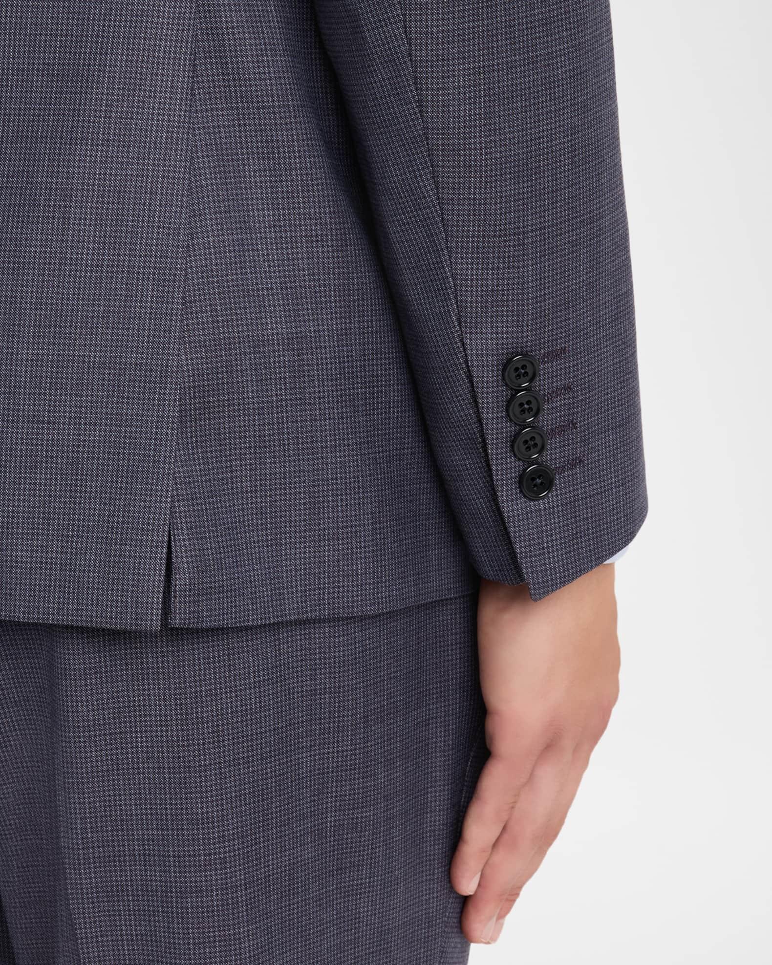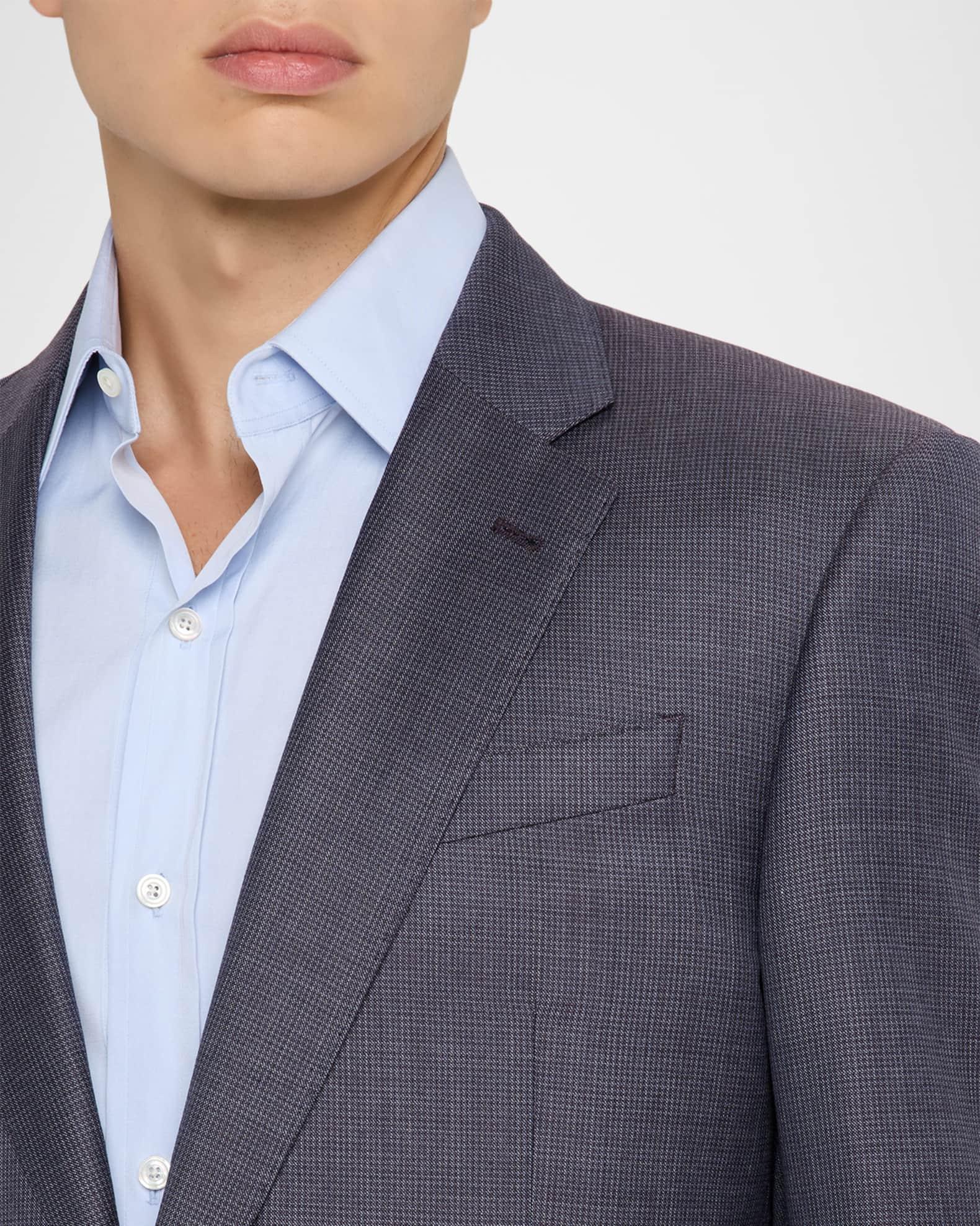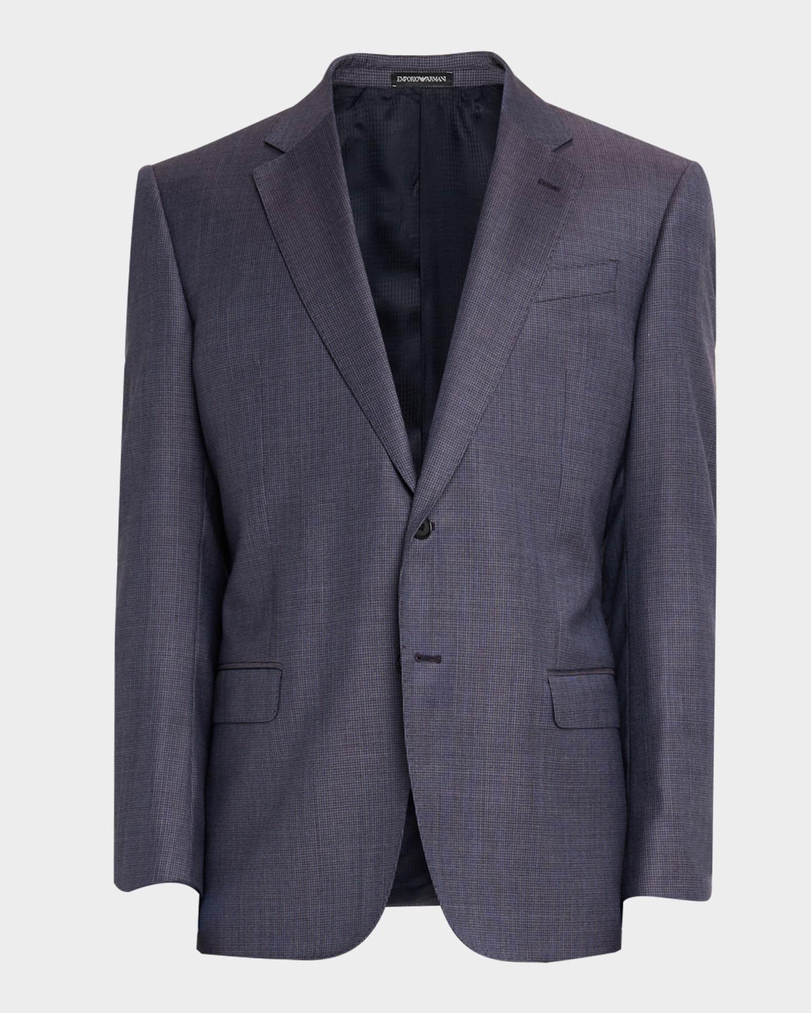 Emporio Armani sport jacket crafted from Super 130's wool, showcasing a textured pinwheel pattern G Line Notch lapels Single-breasted front Chest welt pocket Hip flap pockets Four-button cuffs Double-vented back Virgin wool/viscose Dry clean Imported