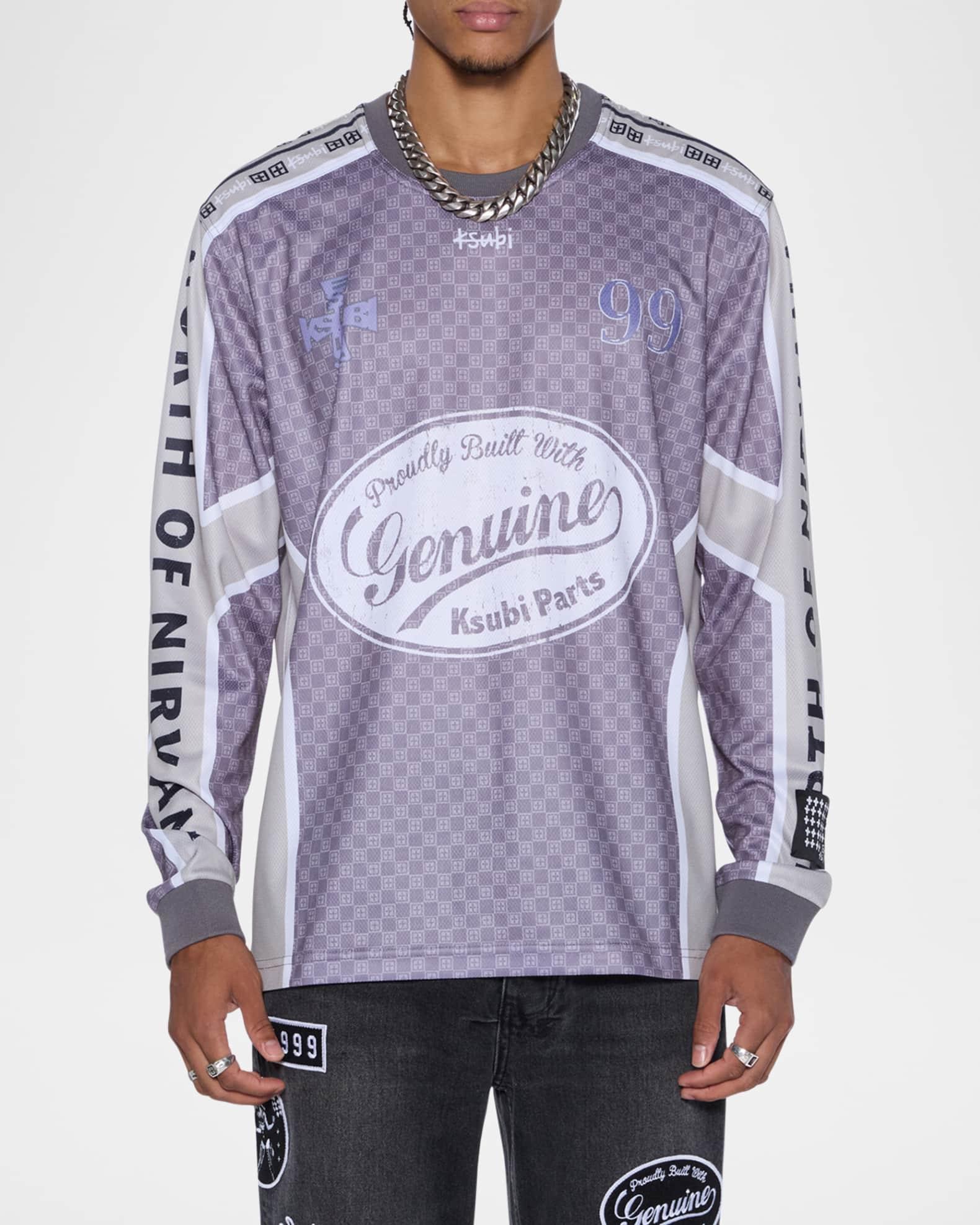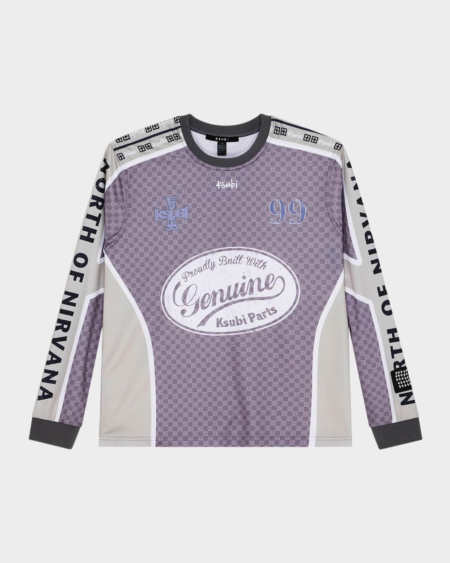 Ksubi T-shirt jersey cut from a technical moto jersey fabric with engineered digitally printed artwork placements Signature T-box and 4x4 branding Crew neckline Long sleeves Sleeve tag detail Ribbed cuffs Classic fit Pullover style Polyester Machine wash cold, wash inside out Imported