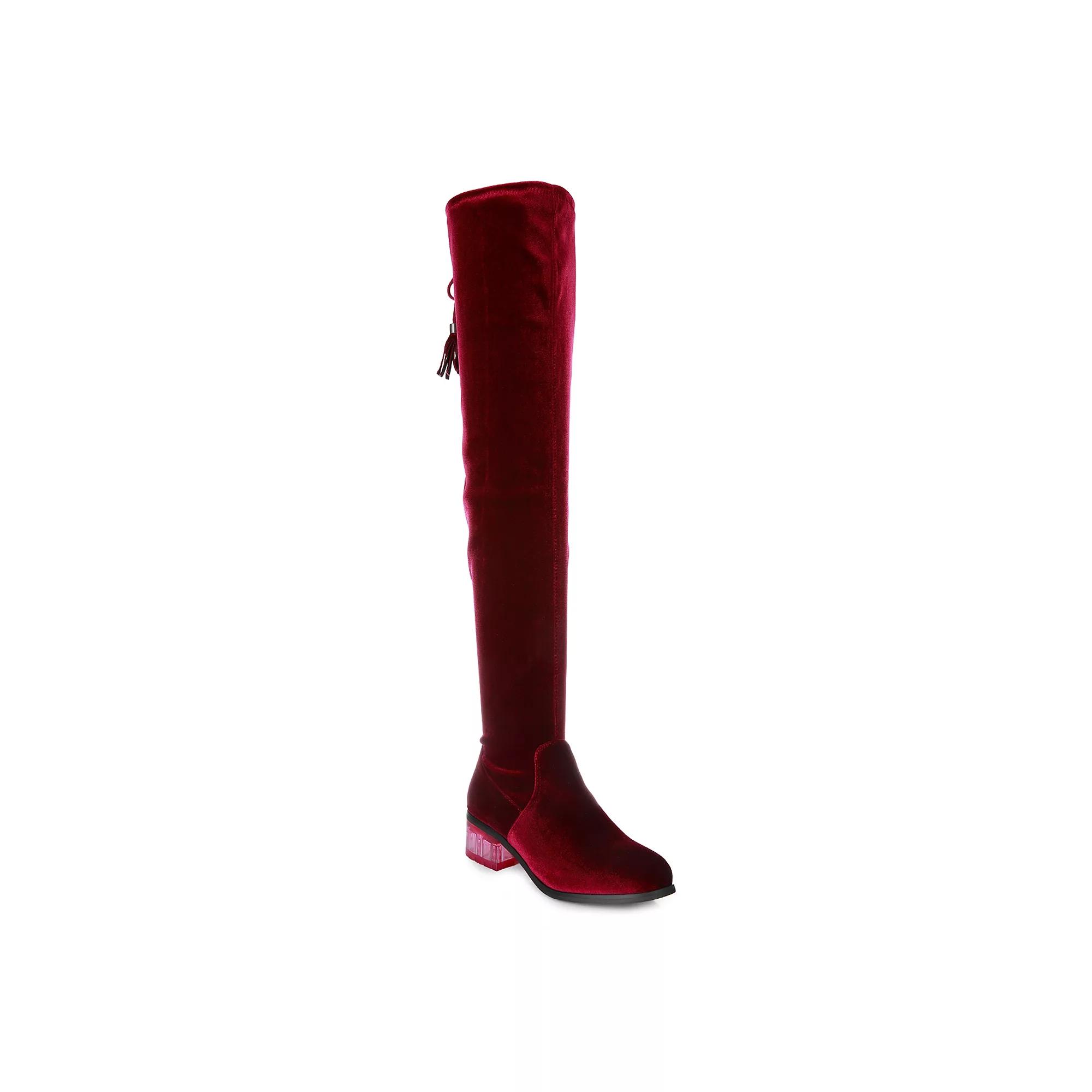 Youll turn heads in these London Rag Rumple womens thigh-high boots.Click this FOOTWEAR GUIDE to find the perfect fit and more! Youll turn heads in these London Rag Rumple womens thigh-high boots. Click this FOOTWEAR GUIDE to find the perfect fit and more! SHOE FEATURES Back tie-up design with tassels Low block heelSHOE CONSTRUCTION Velvet upper Polyester lining Polyurethane midsole TPR outsoleSHOE DETAILS Round toe Zipper closure Padded footbed 1.5-in. heel 21.7-in. shaft 15.15-in. circumference Spot clean Imported Color: Dark Red. Gender: female. Age Group: adult.