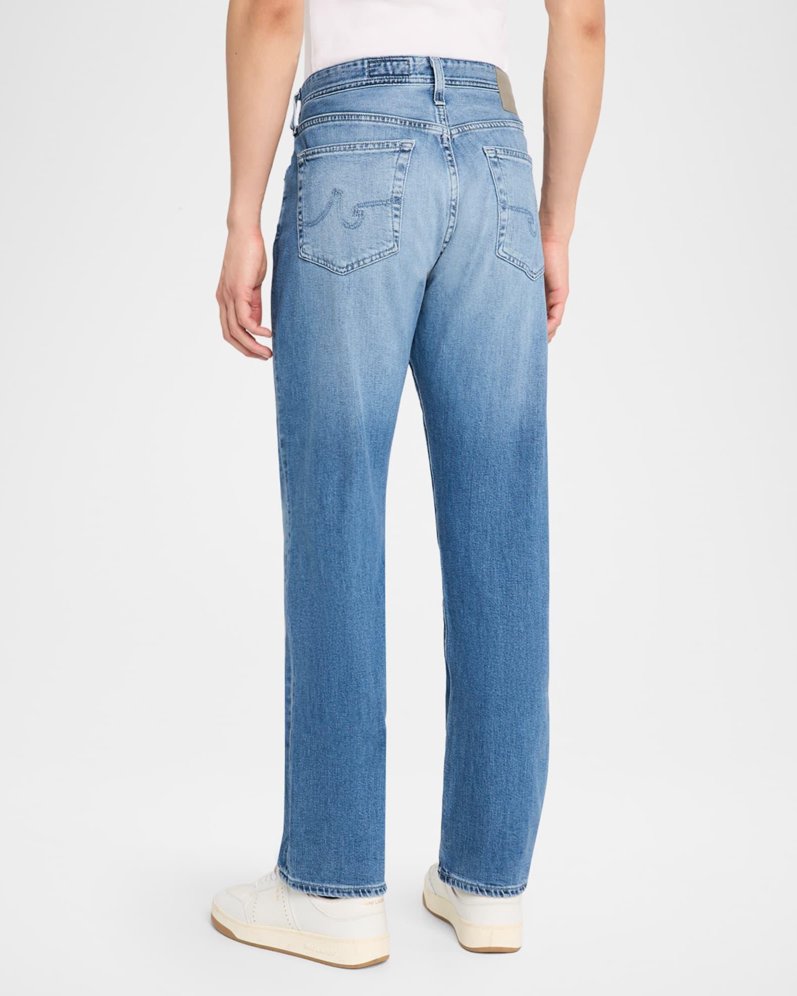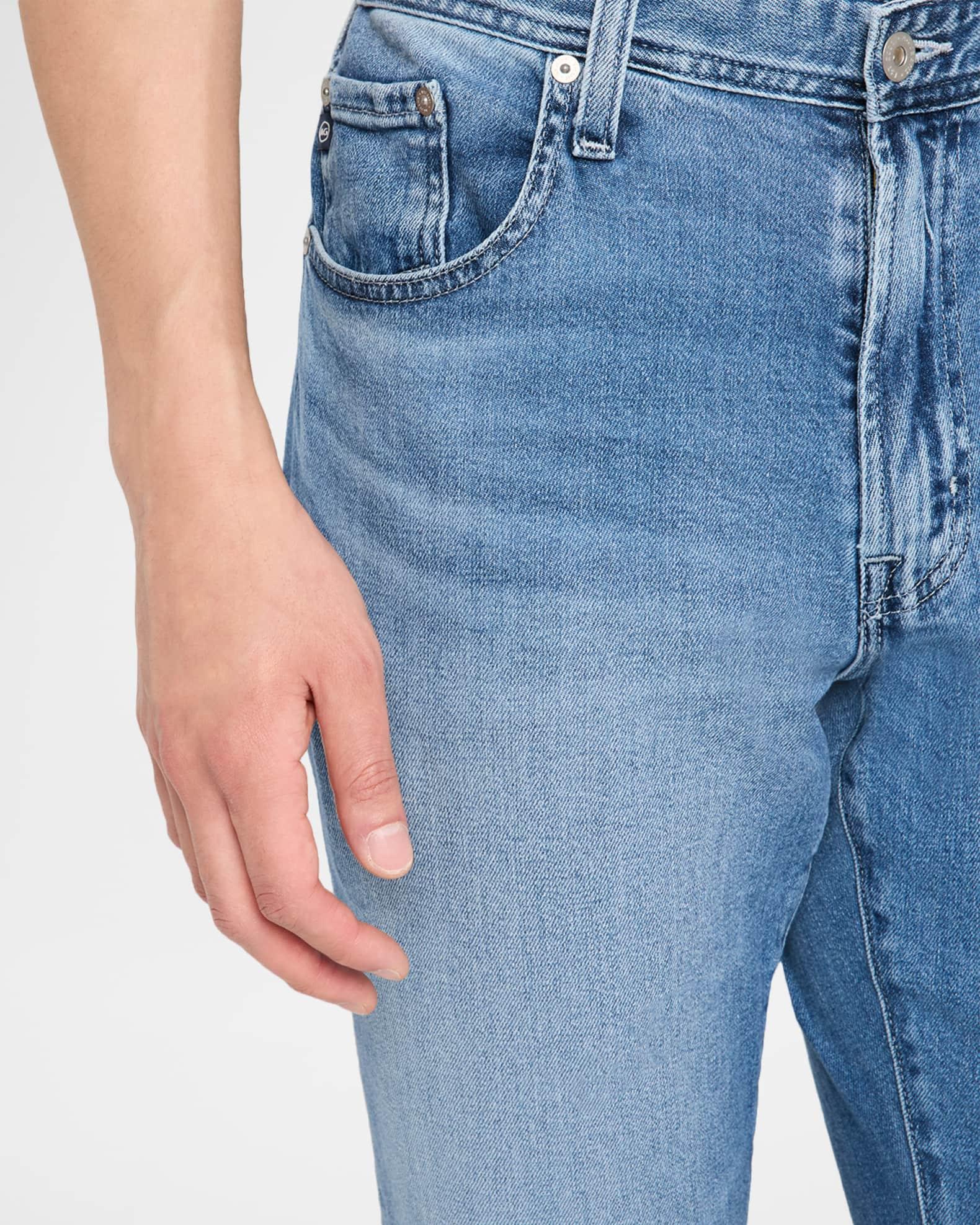 AG "Graduate" jeans in light blue Das denim fabric with whiskering and fading. Approx. measurements: 9.8" front rise; 33" inseam; 15.5" leg opening. Five-pocket style; signature stitching on back pockets. Relaxed fit through waist. Tailored straight leg. Button/zip fly; belt loops. Cotton/lyocell/polyurethane. Imported.