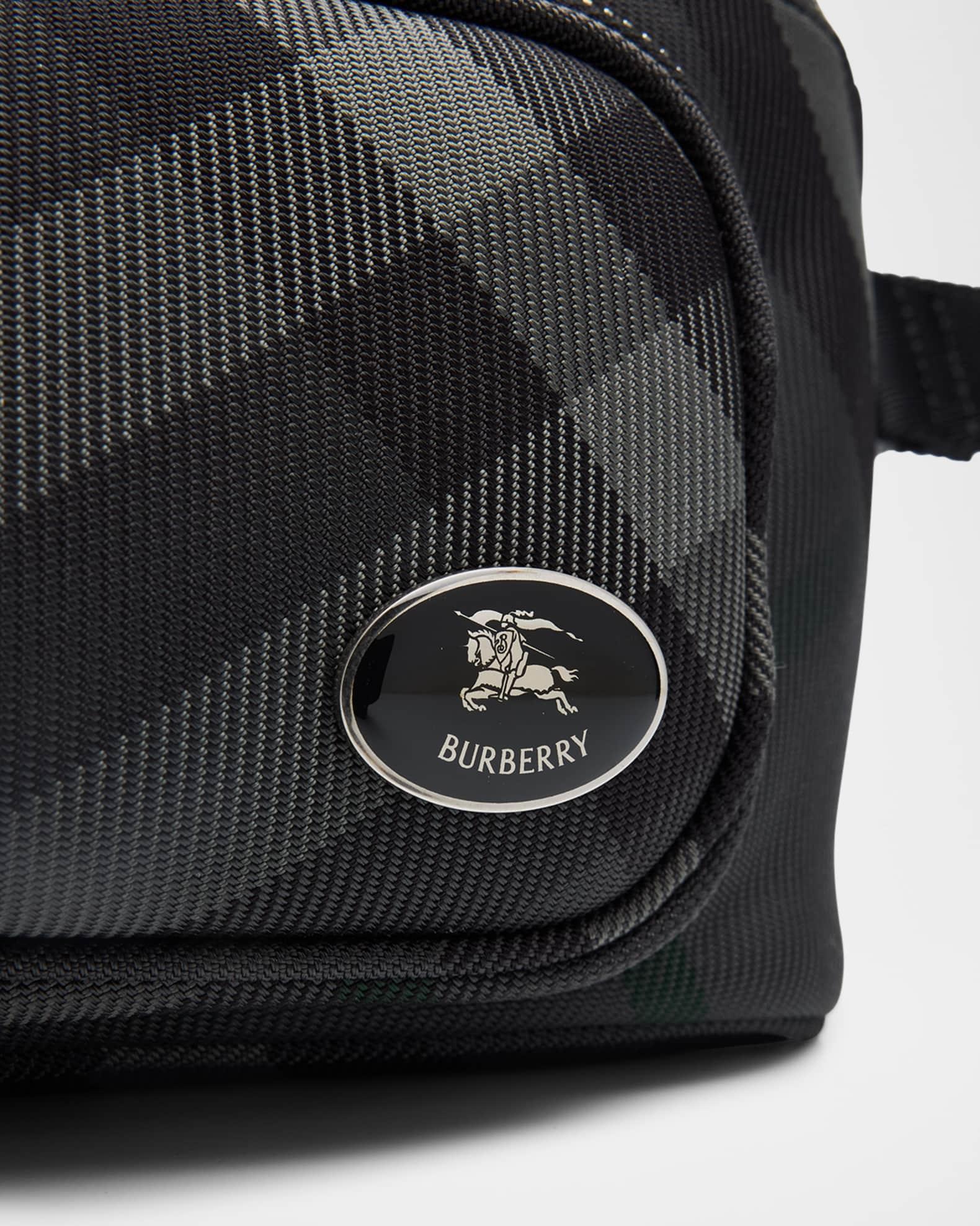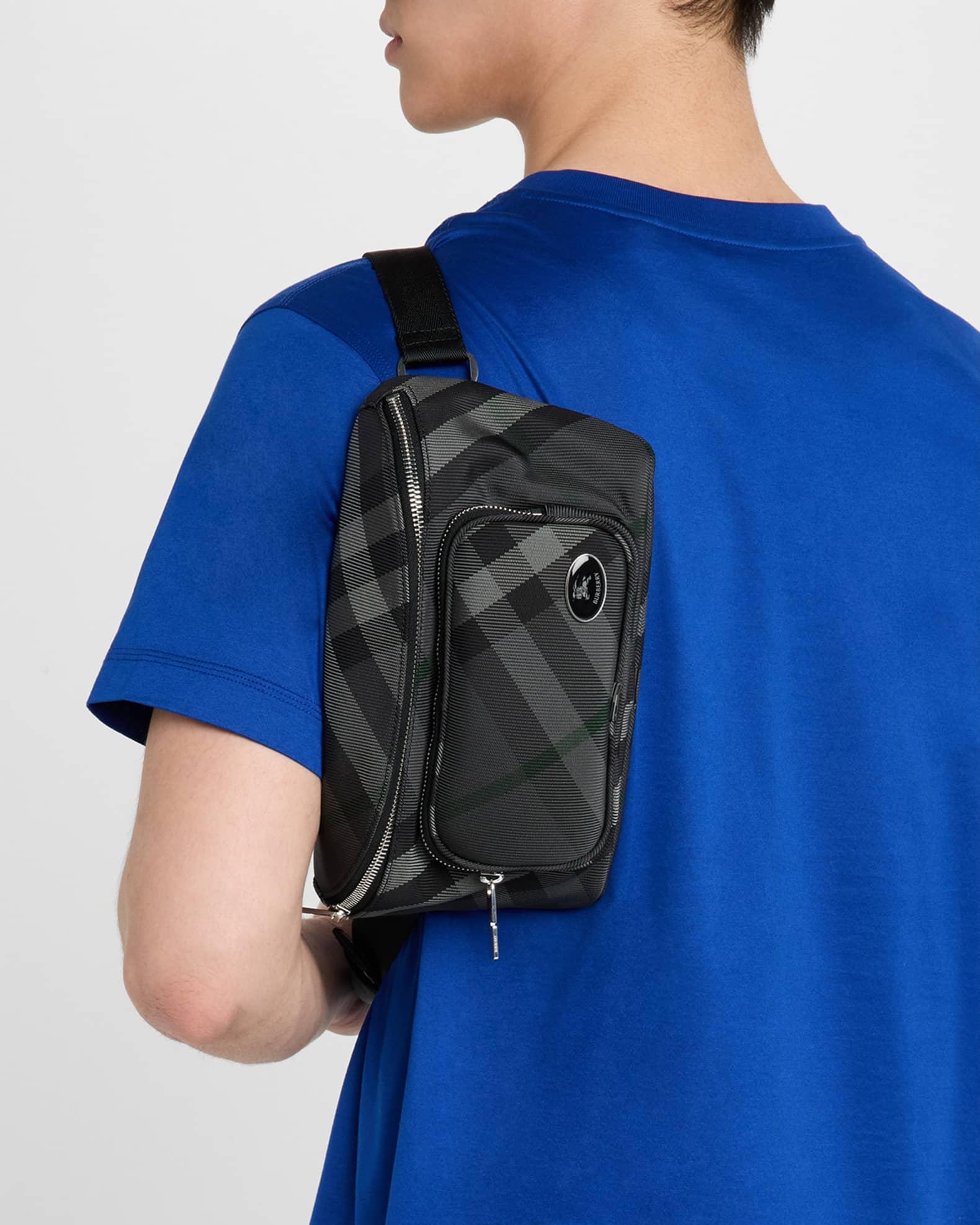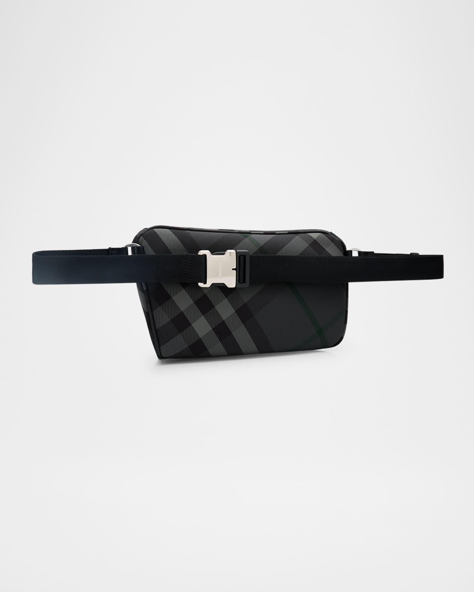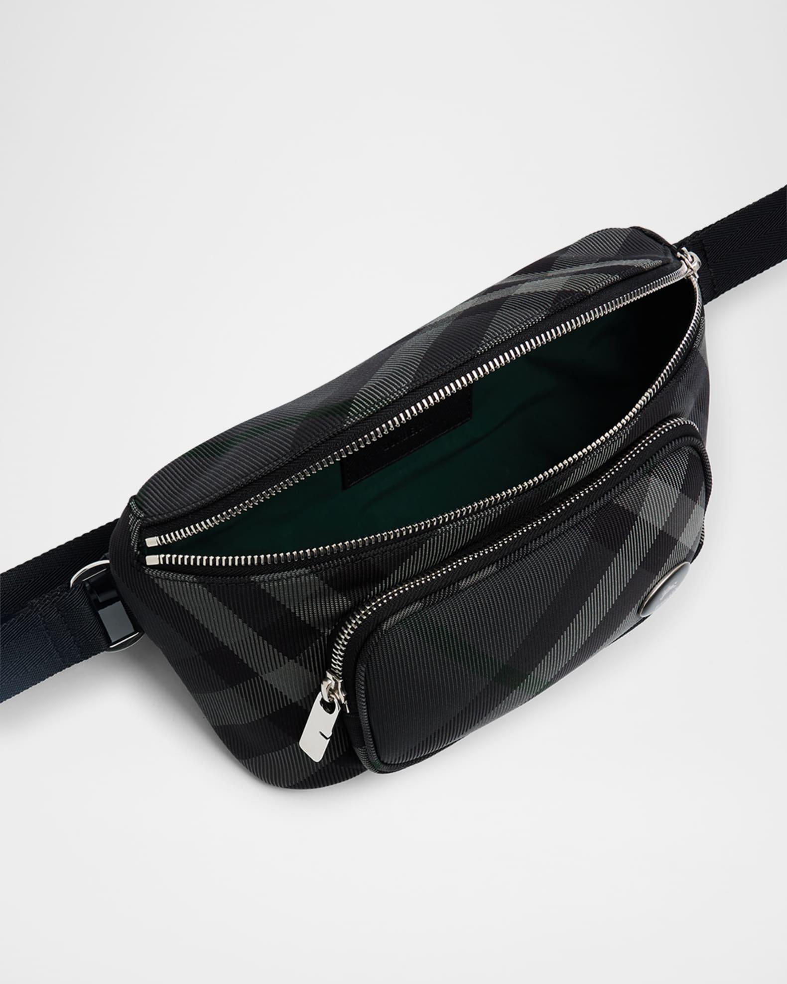 Burberry belt bag woven in the signature Charcoal Check with a durable, ribbed texture Shield plaqué enamelled with the Equestrian Knight Design Zip closure B-cut zip pulls Adjustable webbing strap with buckle Exterior, one front zip pocket Approx. 5.5"H x 10.6"W x 2.8"D Made in Italy