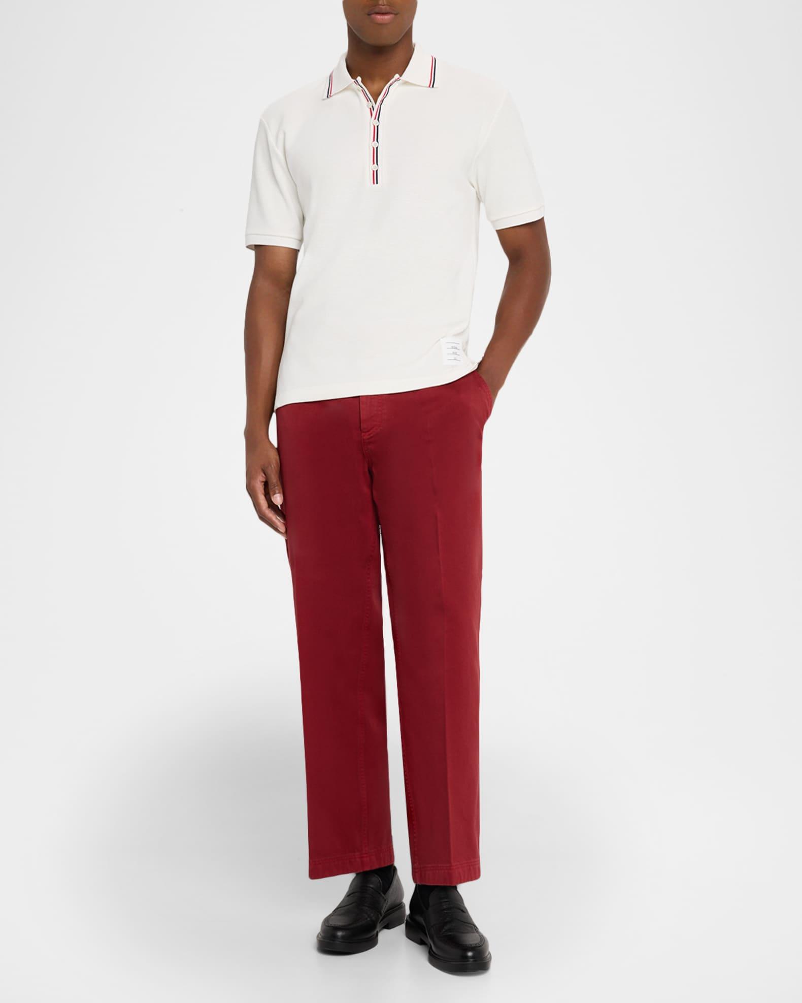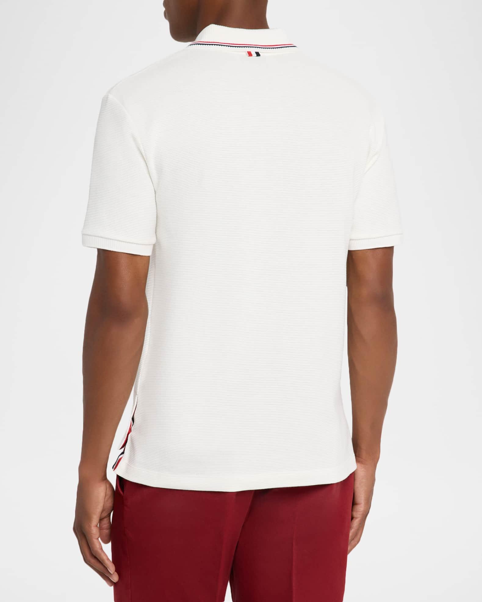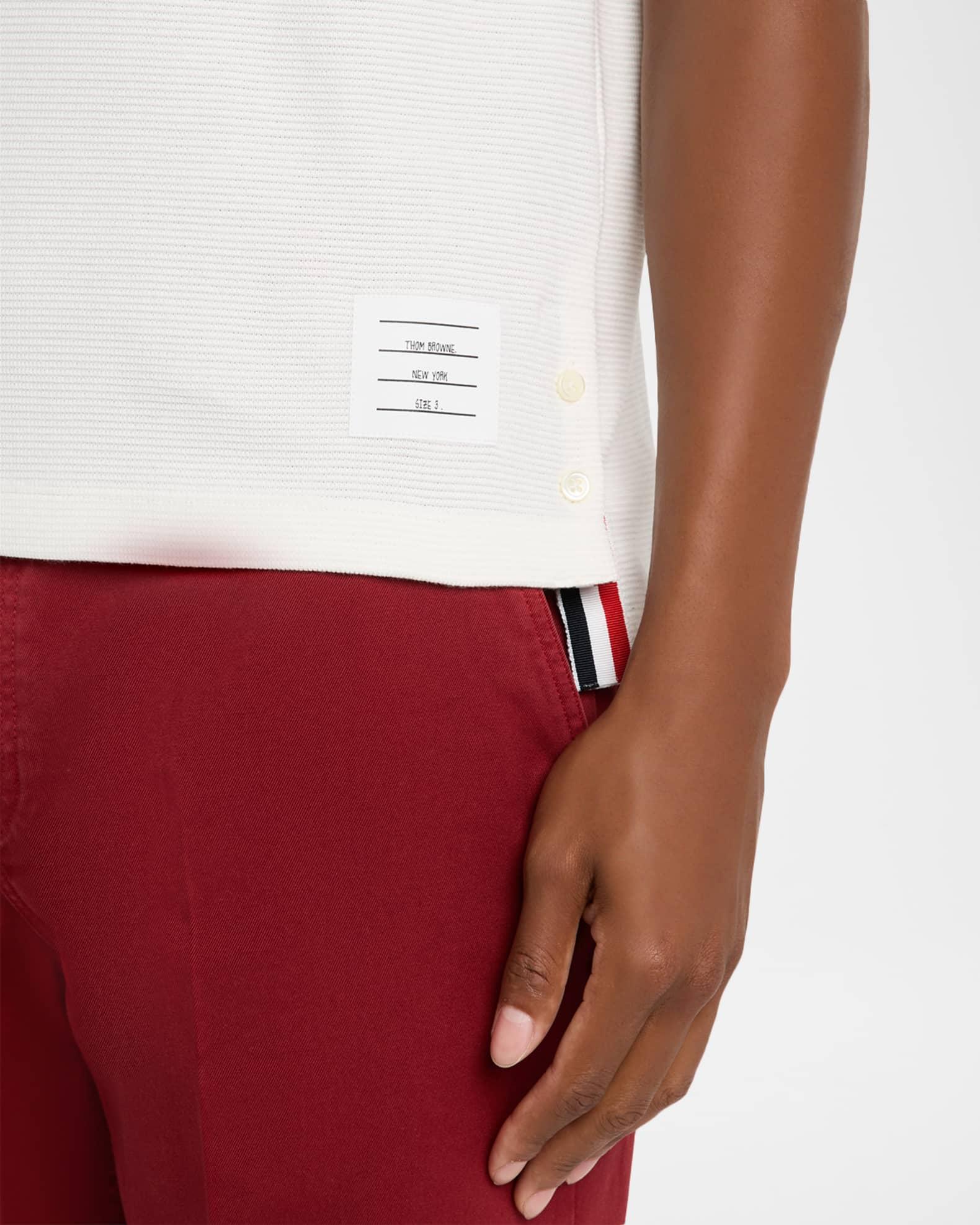 Thom Browne polo shirt in comfortable stretch cotton woven with a textured waffle stitch Signature stripe grosgrain trim Shirt collar Five-button placket Short sleeves Ribbed cuffs Buttoned sides Name tag appliqué on the hem Pullover style Cotton/elastane Dry clean Made in Italy