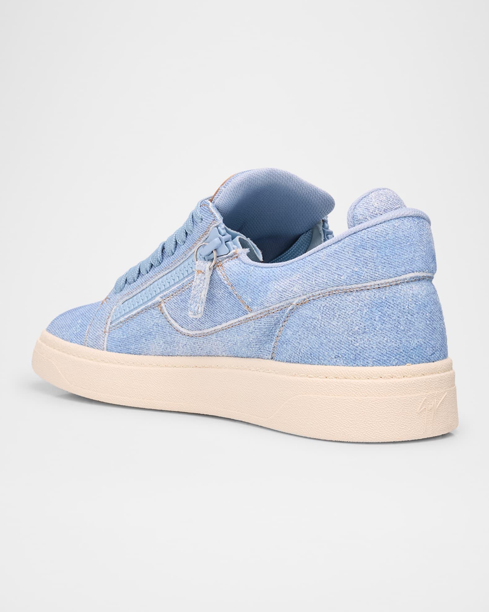 Giuseppe Zanotti "GZ 94" low-top sneakers in denim fabric Flat heel Round toe Lace-up vamp Leather logo patch on tongue Padded collar Leather lining Side zips for easy on and off Heel logo Rubber outsole Made in Italy