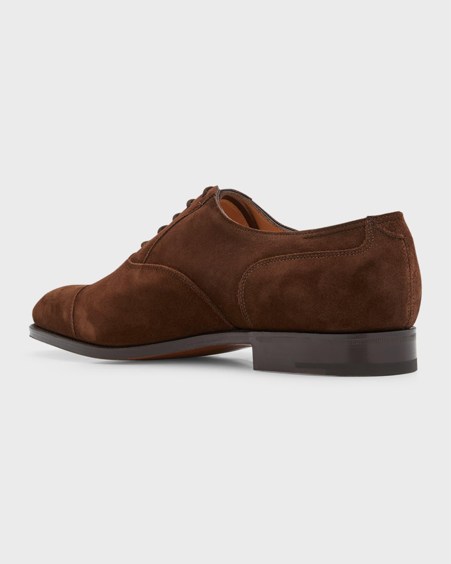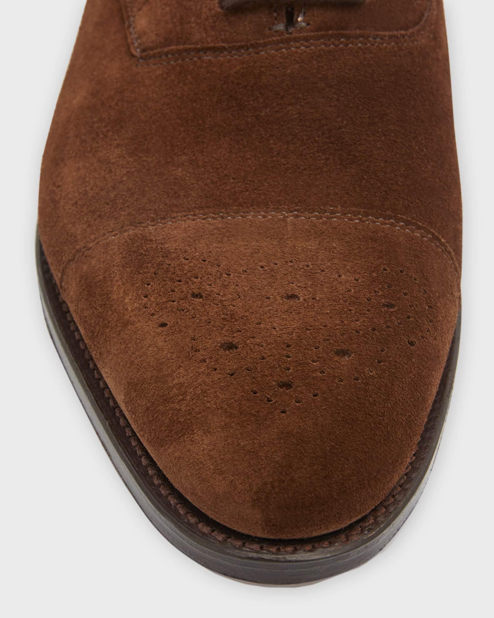 John Lobb "Hartland" oxfords in soft suede with brogue accents Stacked heel Round cap toe Lace-up vamp Leather lining Made in United Kingdom