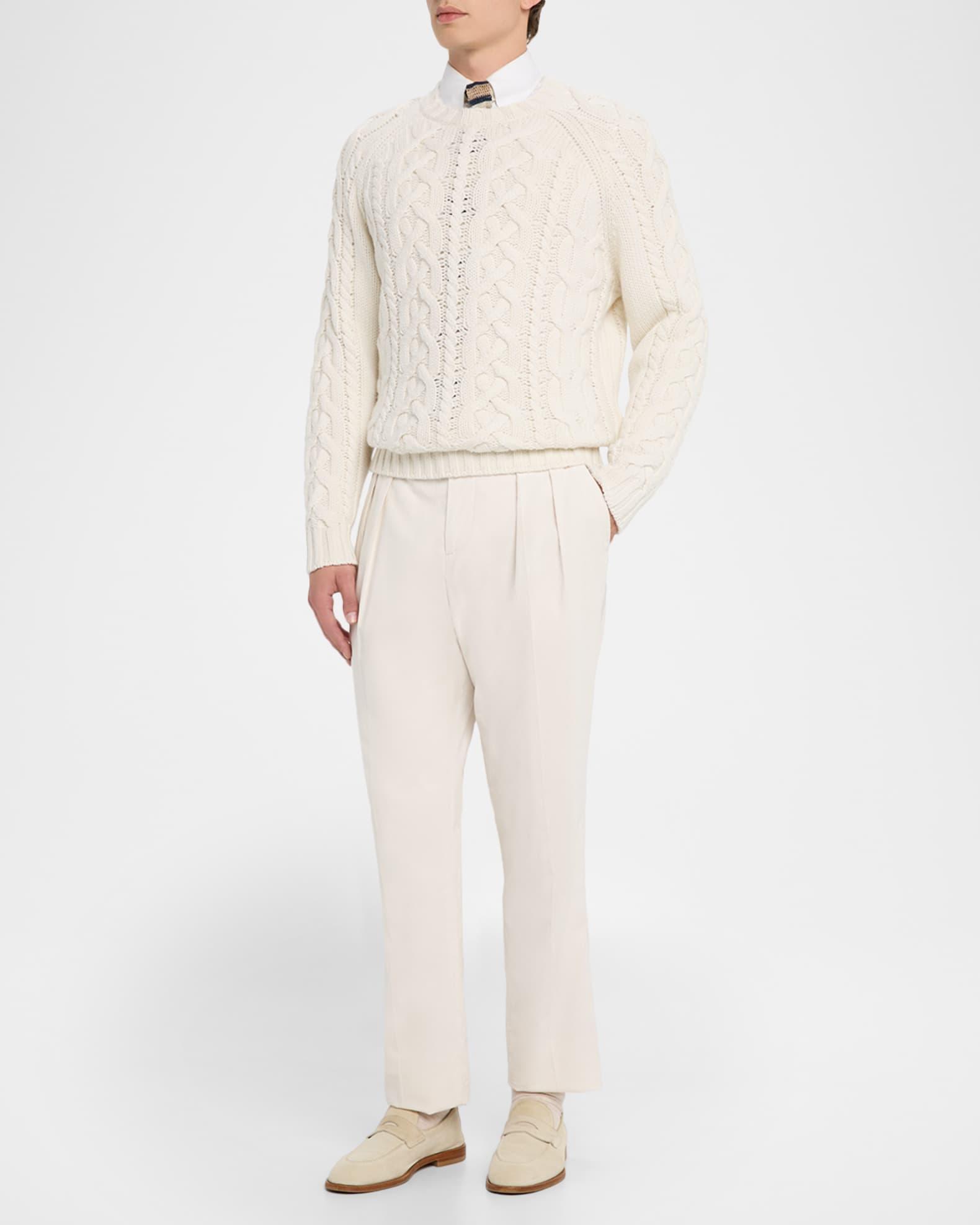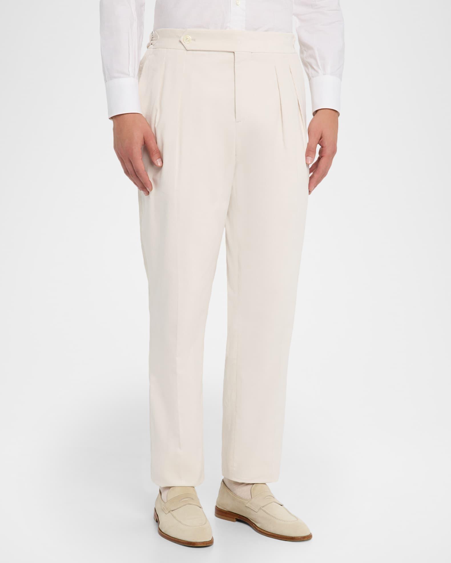 Brunello Cucinelli dress pants in fine corduroy for a velvet-like finish High rise Double-pleated front Side slip pockets Back besom pockets Straight legs Full length Waistband adjusters Extended button-zip front; belt loops Cotton/silk Lining: Cupro/viscose Dry clean, machine wash line dry Made in Italy