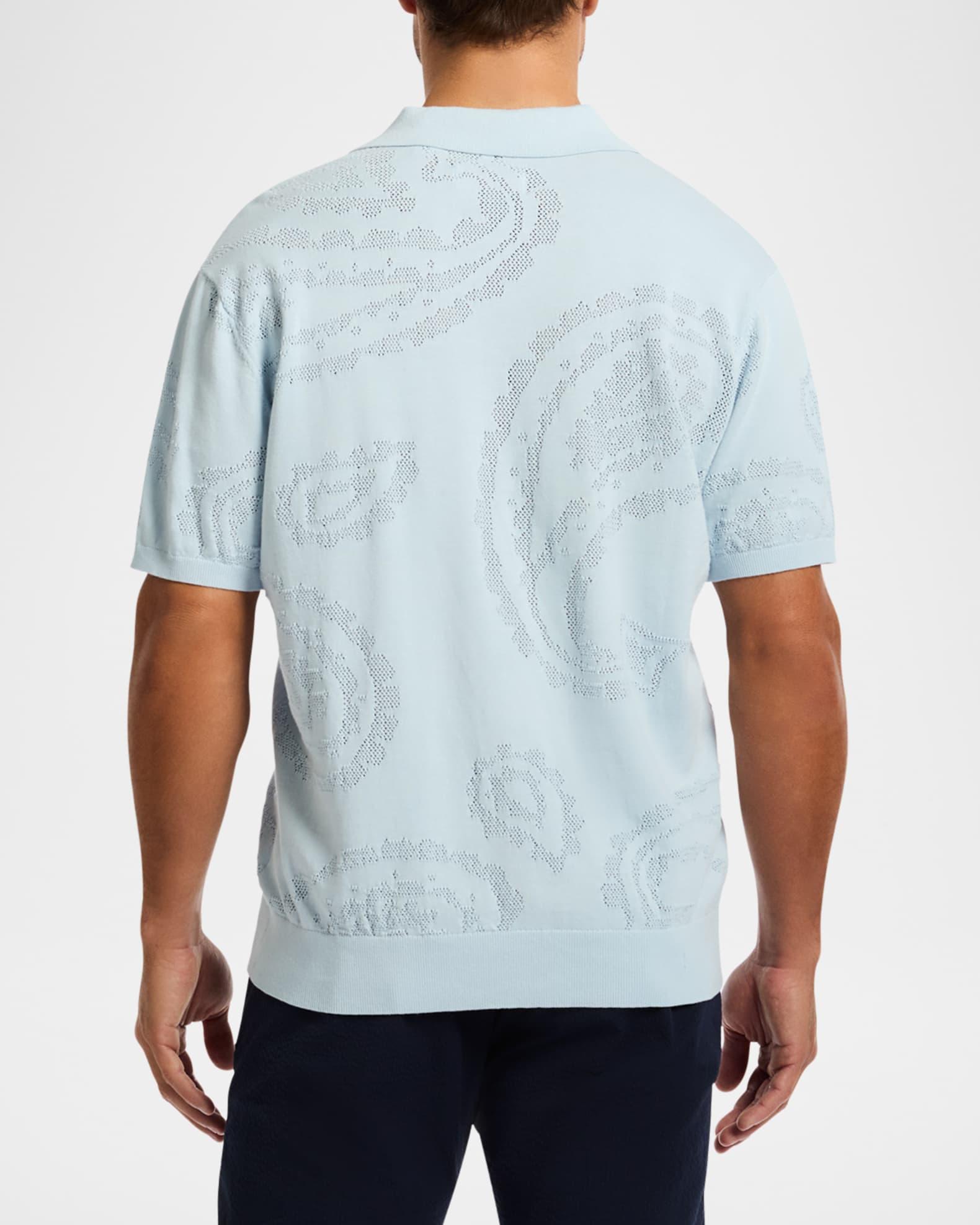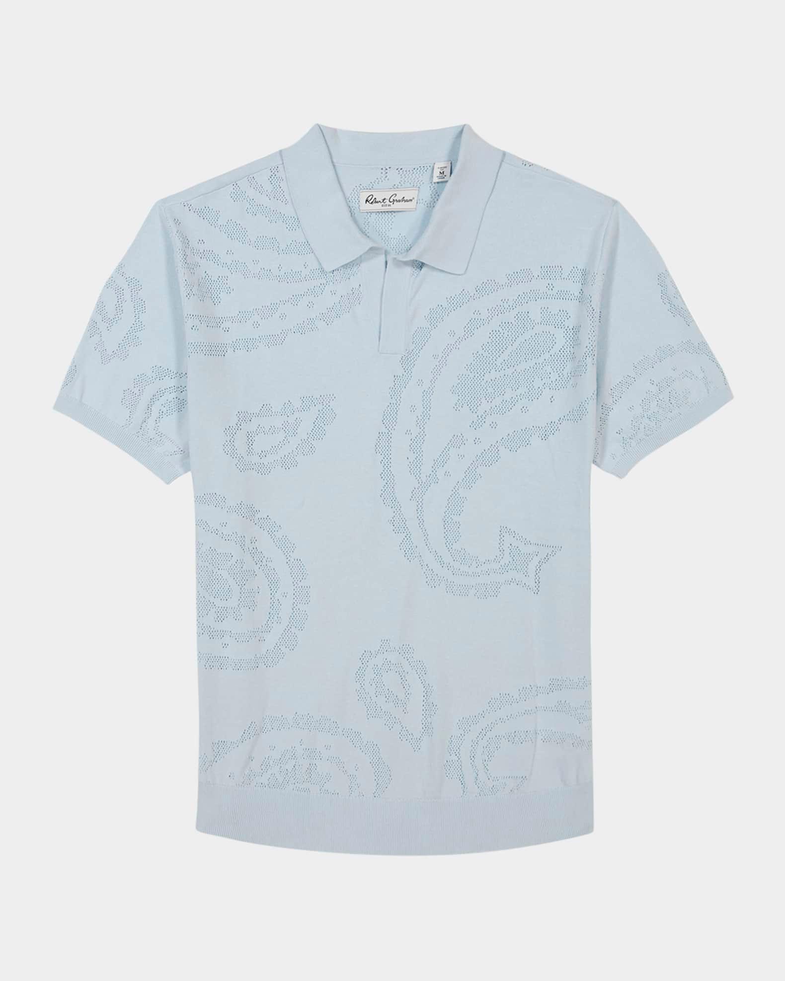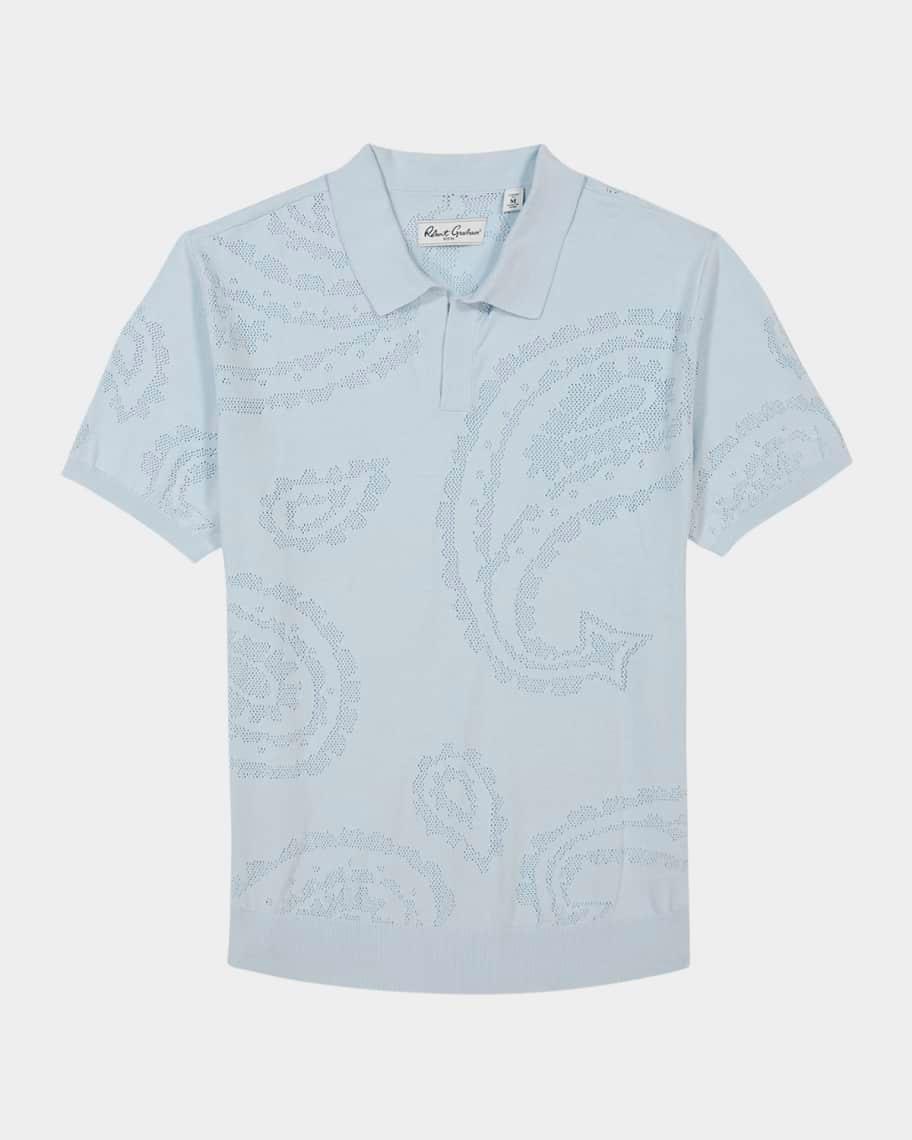 A paisley jacquard weave turns a basic polo into a standout style. Notice how the pale blue style is accented by large tonal paisleys, creating a pattern that is sure to turn heads. Pair with your favorite lightweight bottoms to complete the look. Robert Graham polo sweater in cotton with a paisley jacquard pattern Johnny collar Short sleeves Ribbed cuffs and hem Pullover style Cotton Machine wash cold Imported