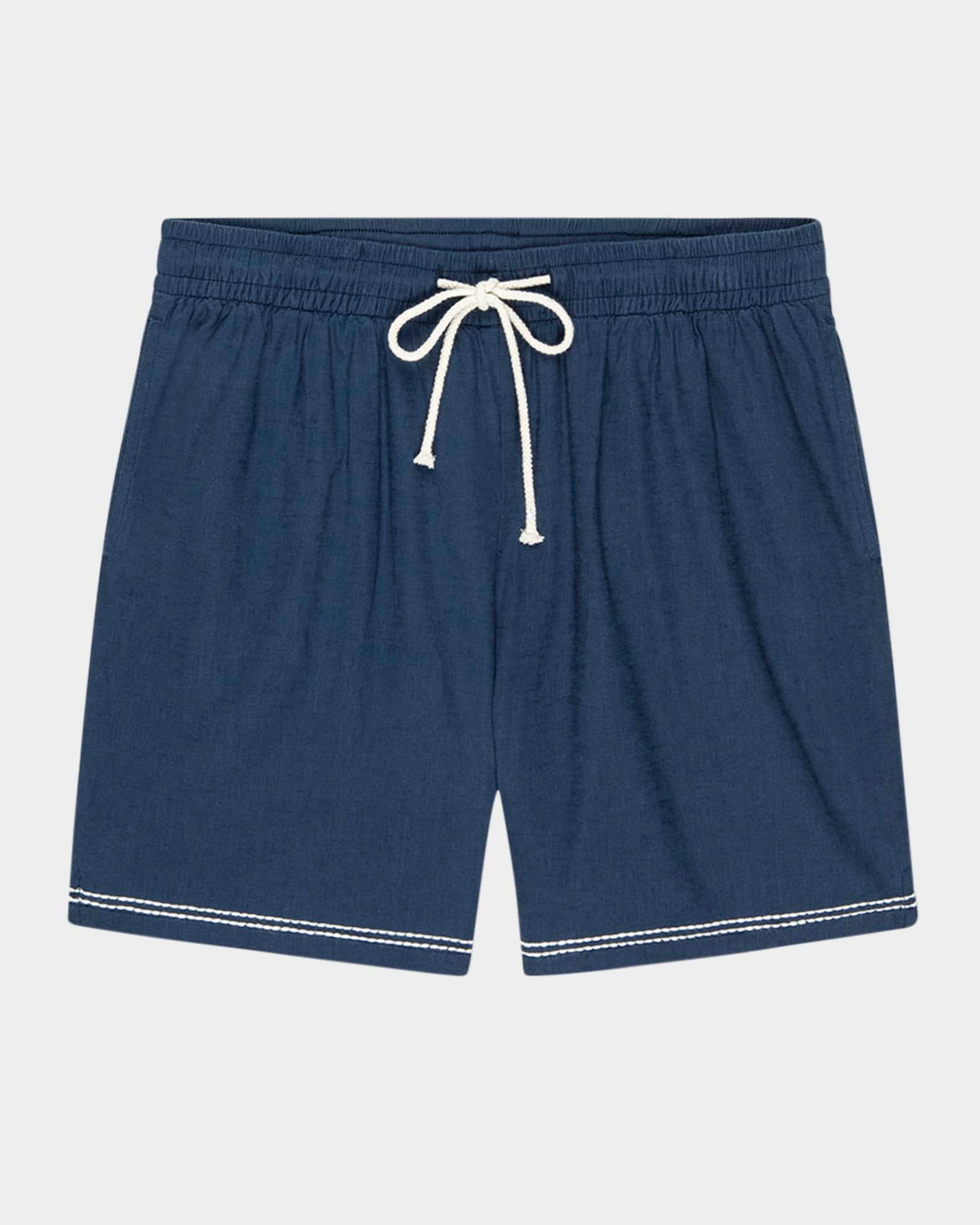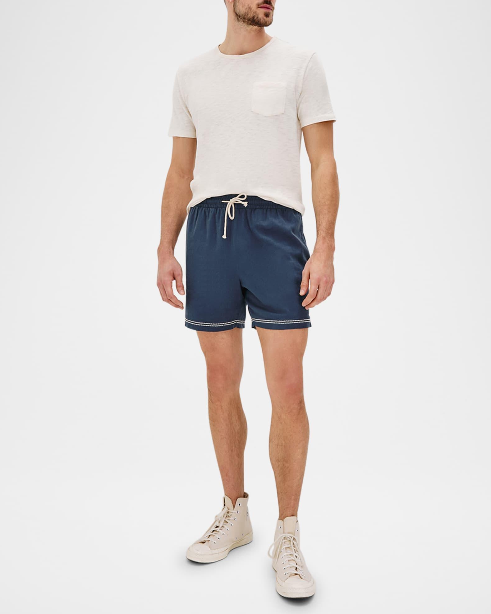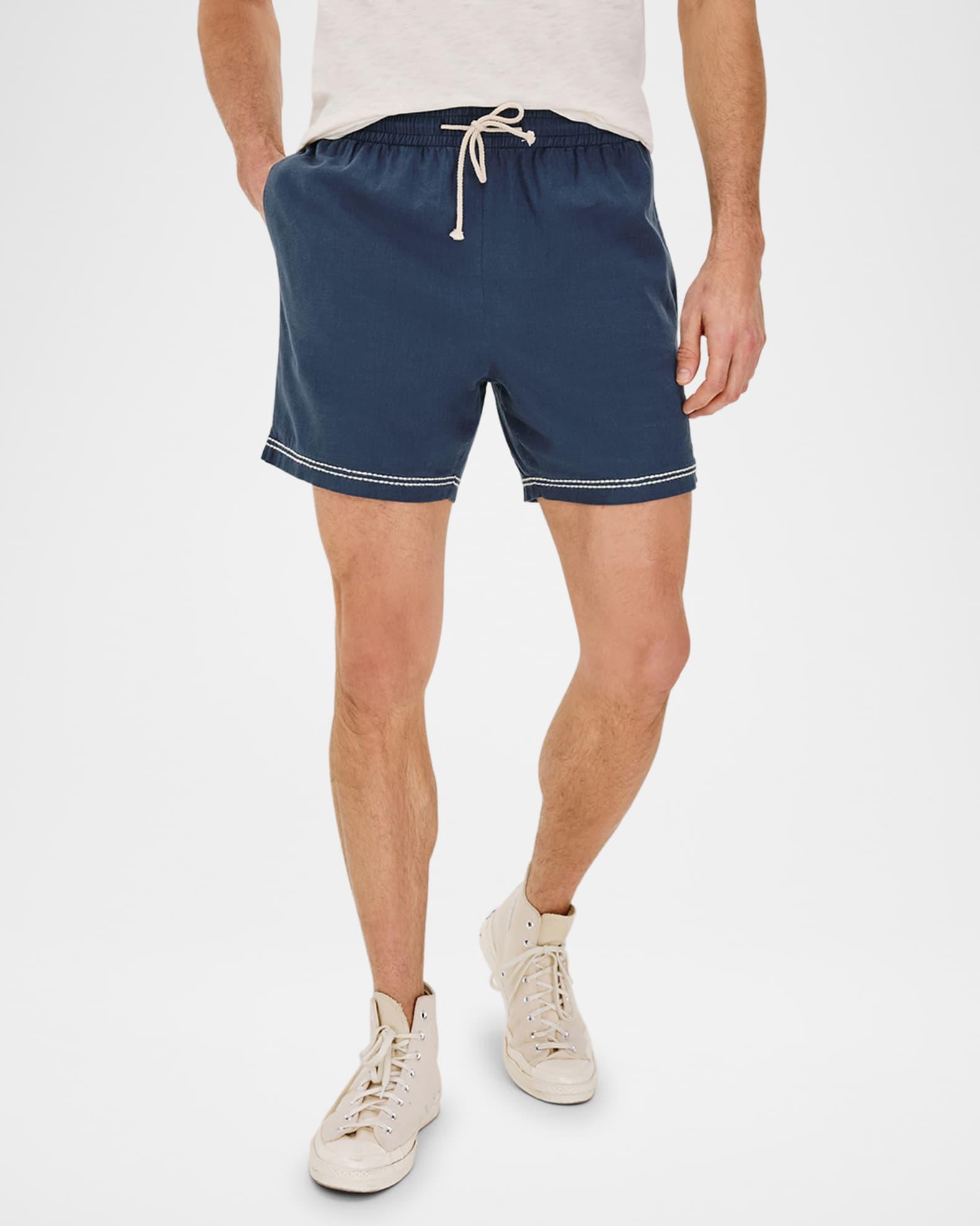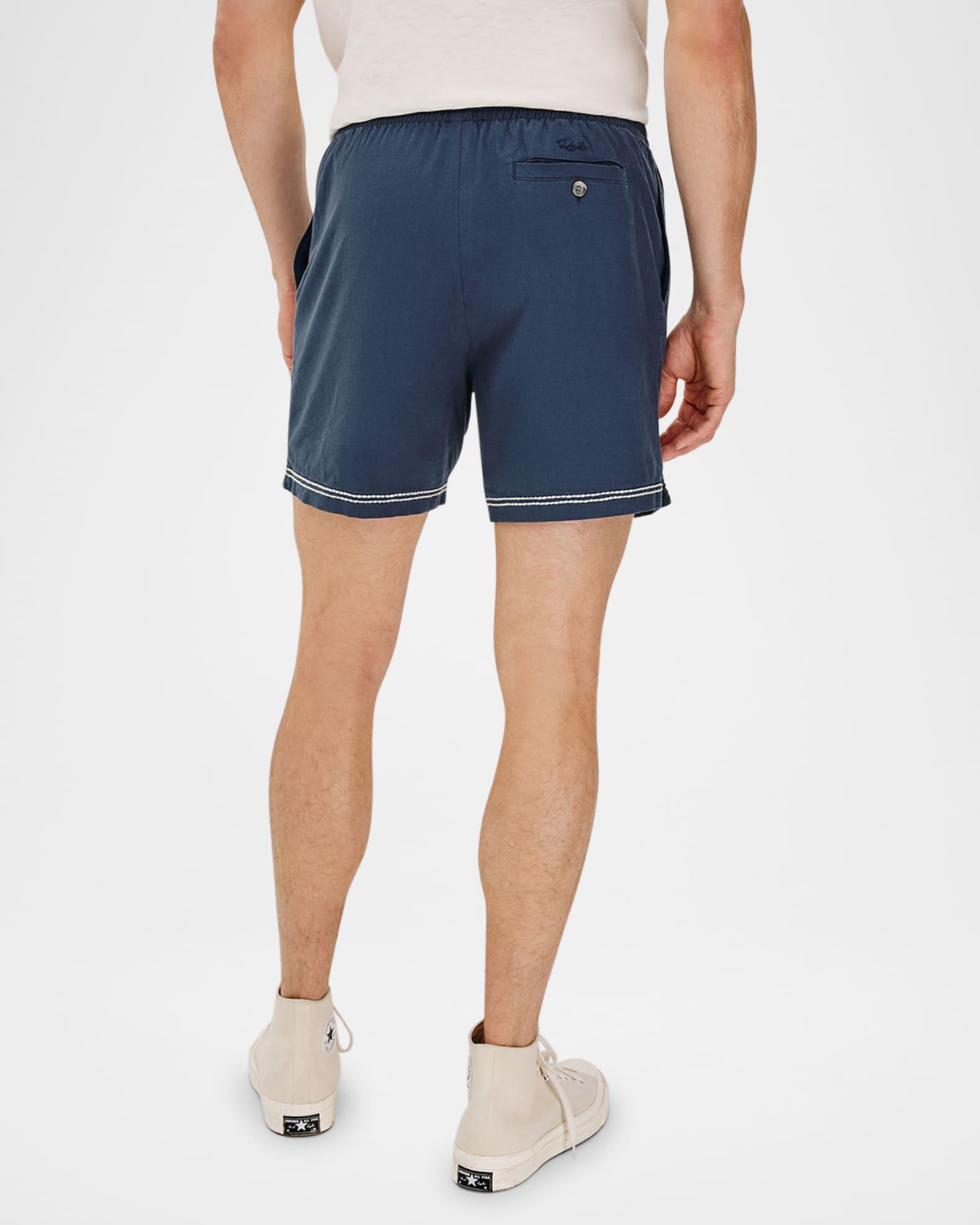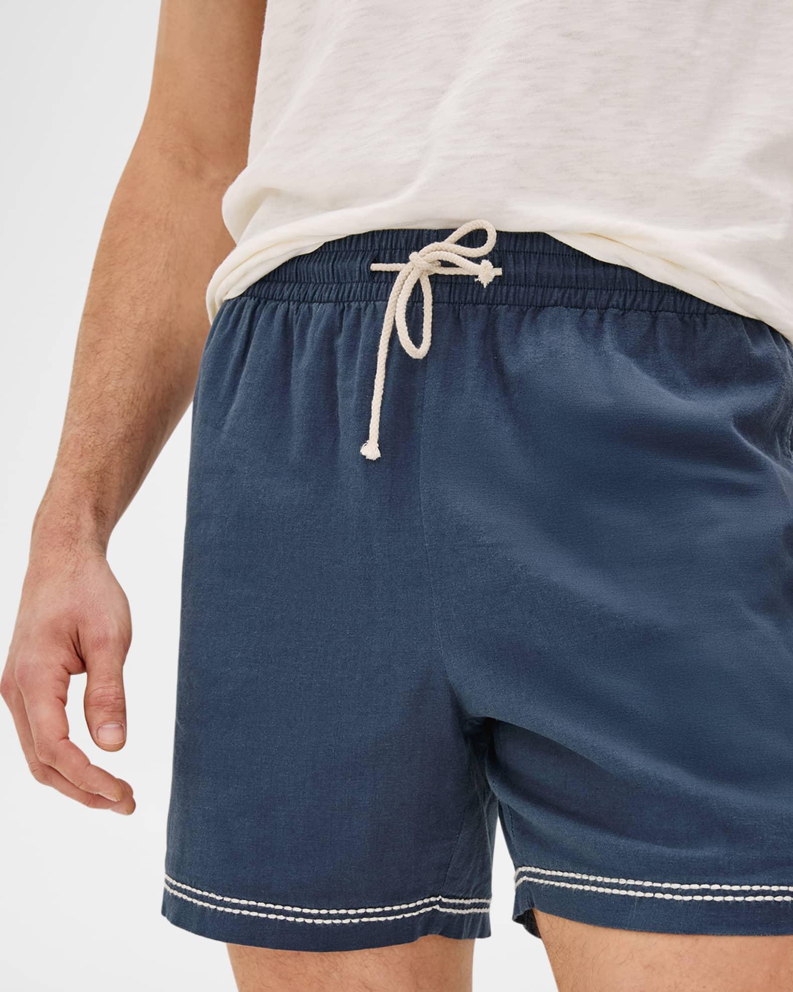 Rails "Hudson" shorts in a breathable linen blend accented with embroidered stripe trim Approx. 6" inseam Regular rise Side slip pockets Back buttoned welt pocket Embroidered logo Classic fit through slim legs Elasticized drawstring waistband Pull-on style Linen/rayon/cellulose acetate/spandex Hand wash Imported