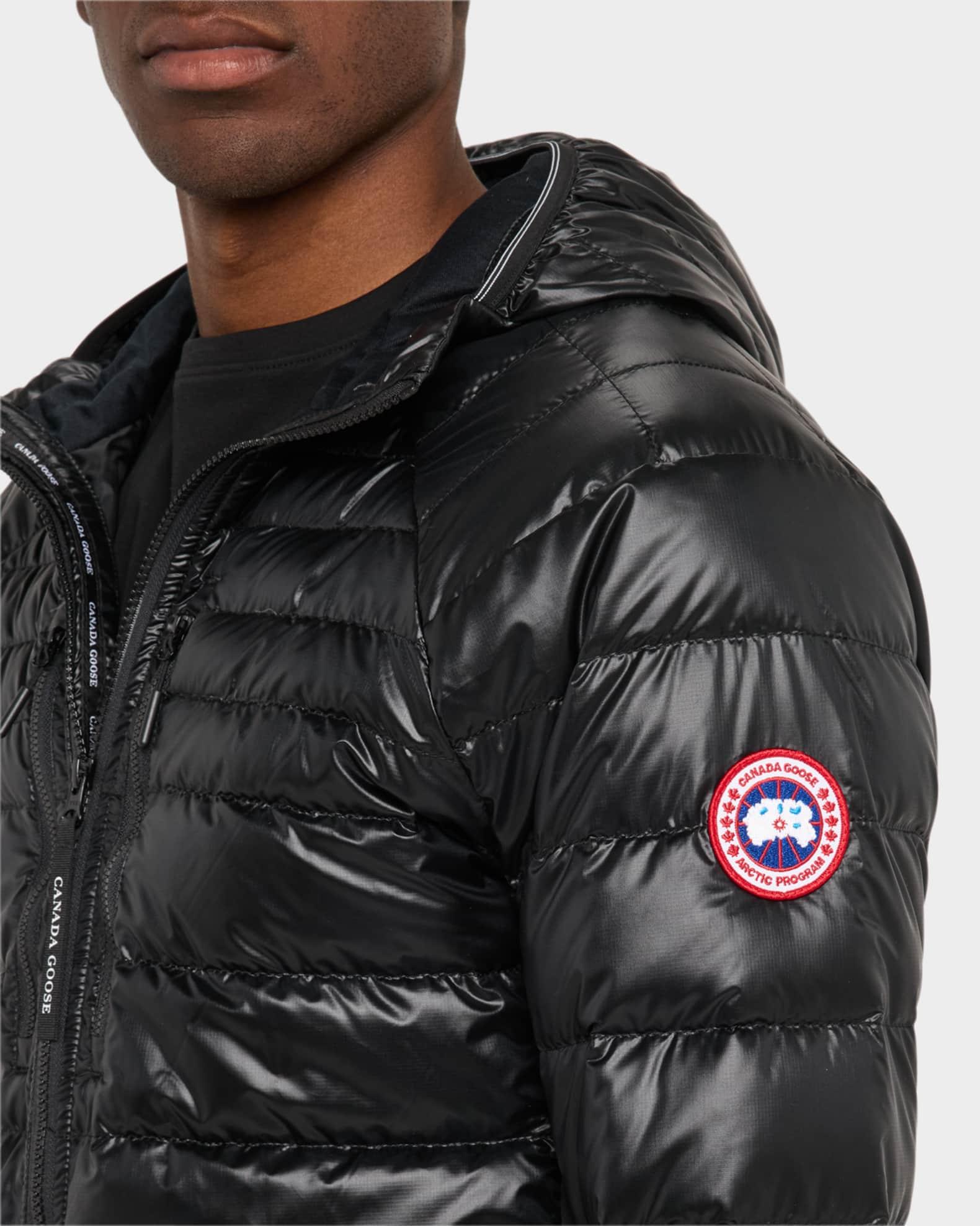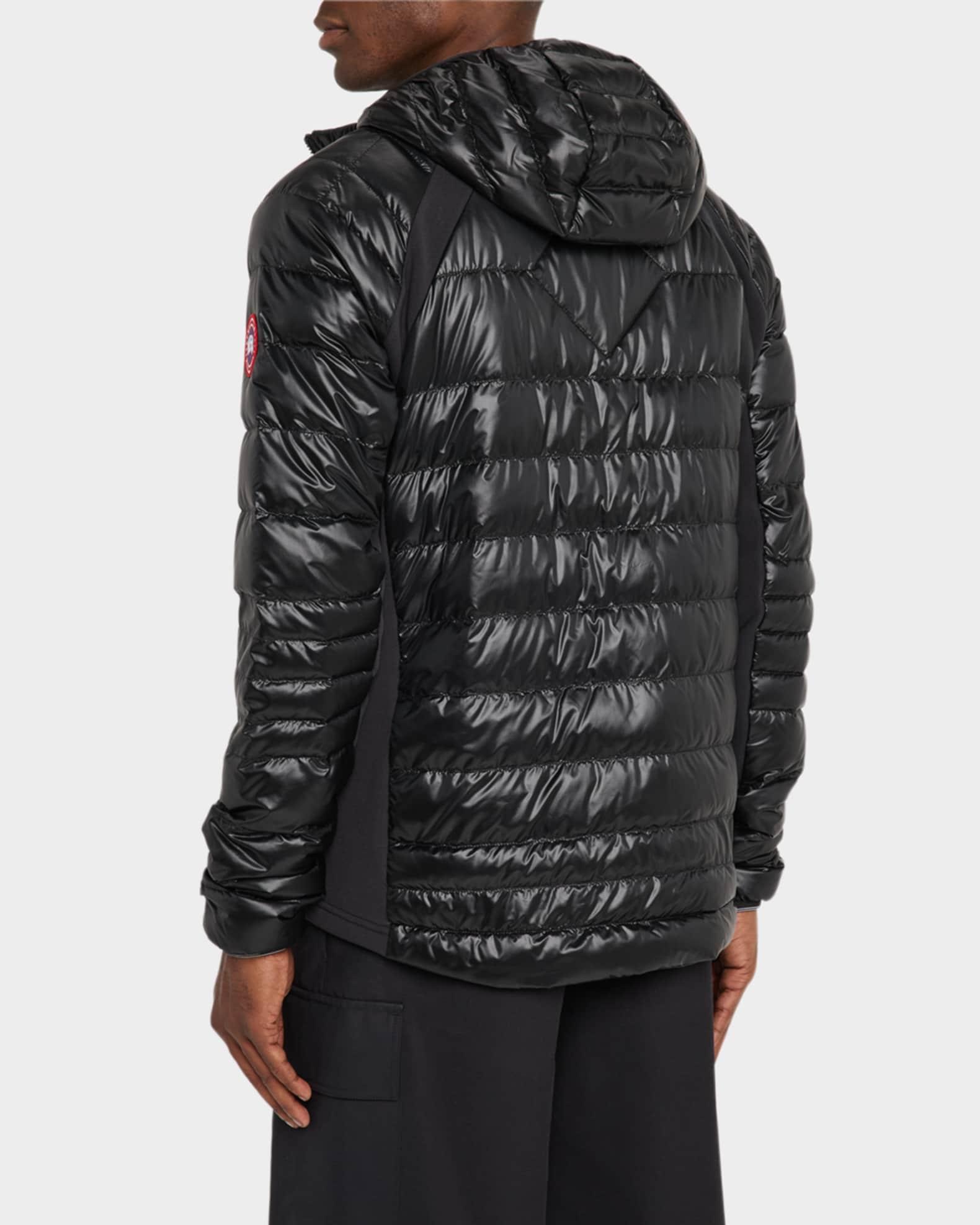 Canada Goose "Hybridge Lite" packable jacket in durable and lightweight ripstop, designed for transitional wear Water-repellent and wind-resistant Double-stripe reflective accents on back collar and cuffs Hooded neckline Lined chin guard Storm flap under two-way zip closure Mesh-lined side zip pockets Two interior pockets Long sleeves Logo patch on left sleeve Cuffs with hidden thumbhole Down/feather padding with 800 fill power Nylon/polyamide Machine wash cold Made in Canada