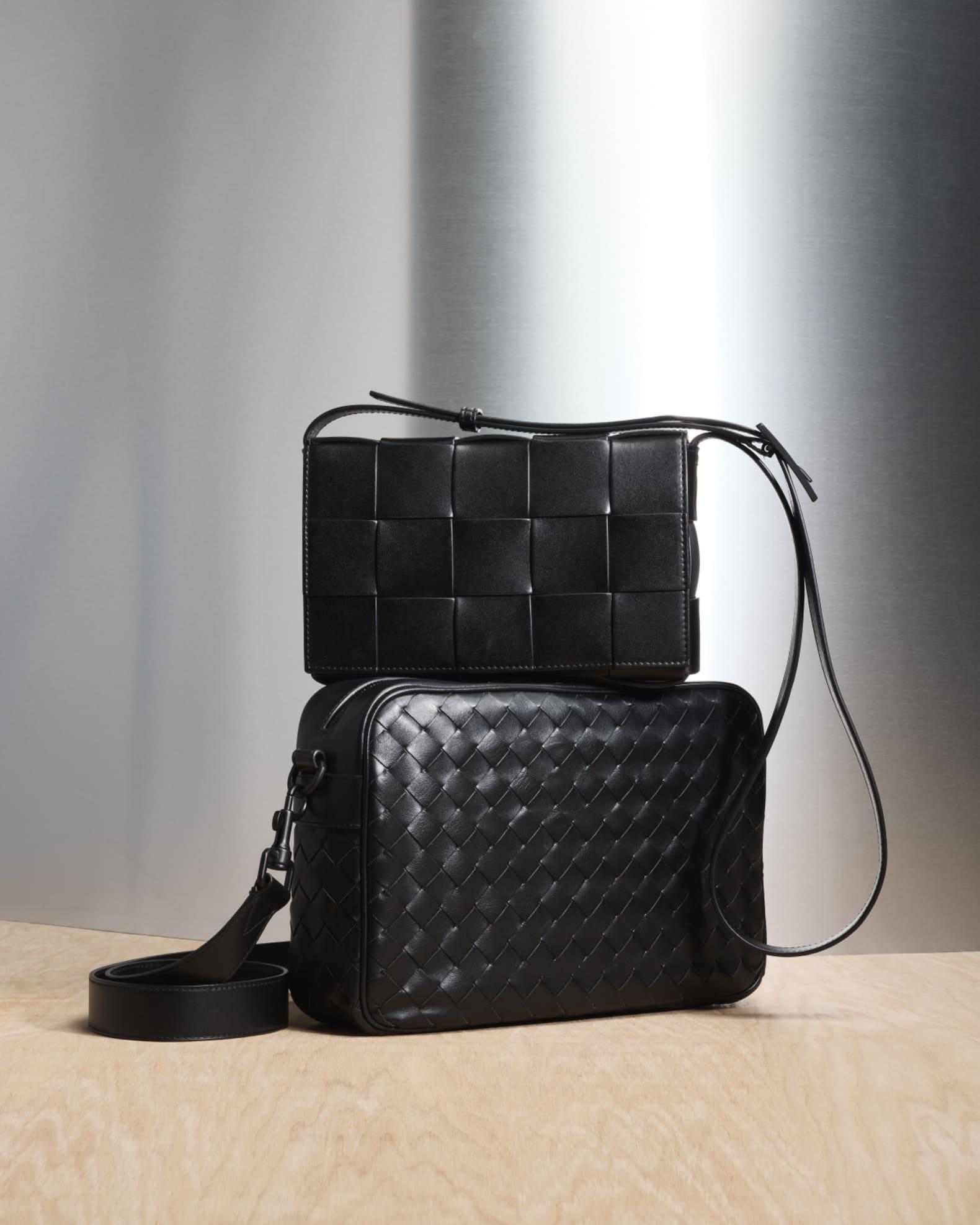 Bottega Veneta camera bag in intrecciato leather Detachable adjustable shoulder strap Two-way zip closure Approx. 7.7"H x 11.6"W x 3"D Made in Italy