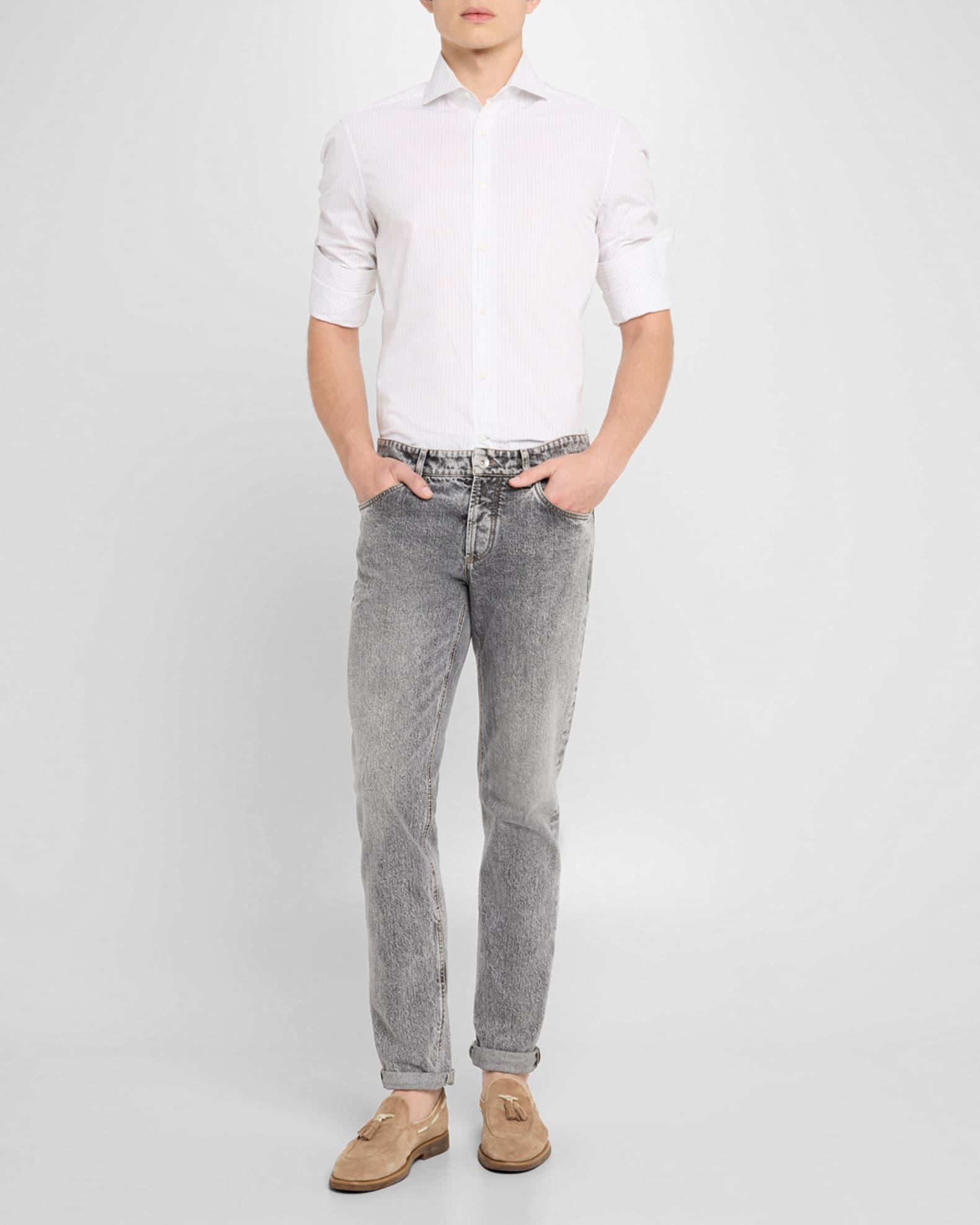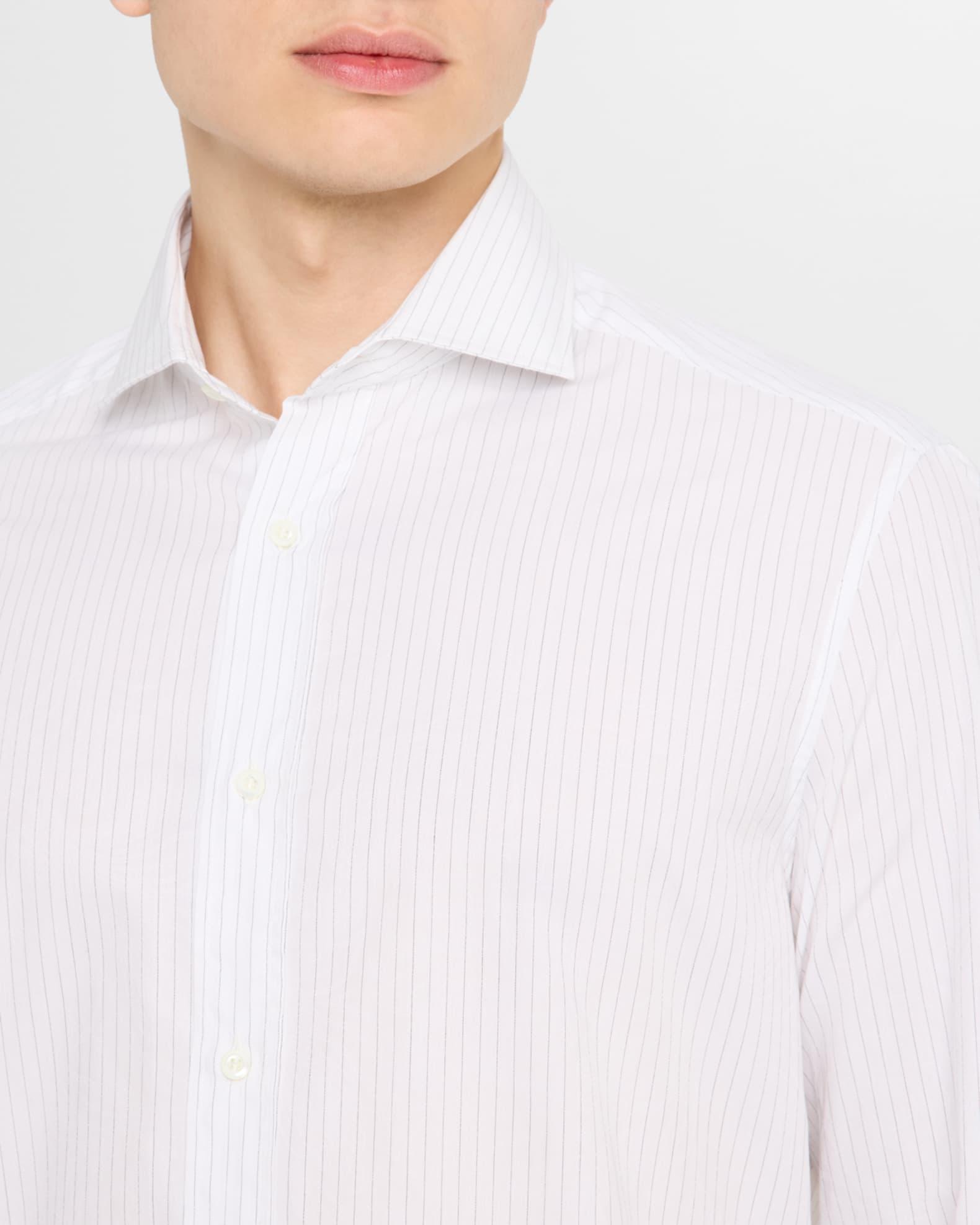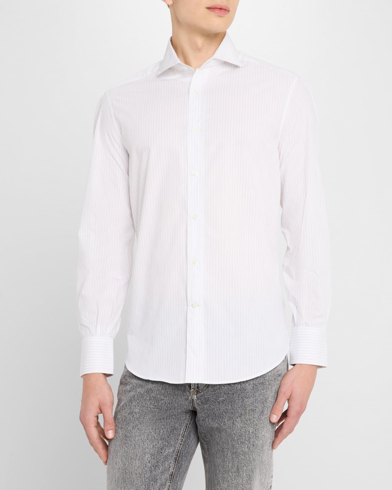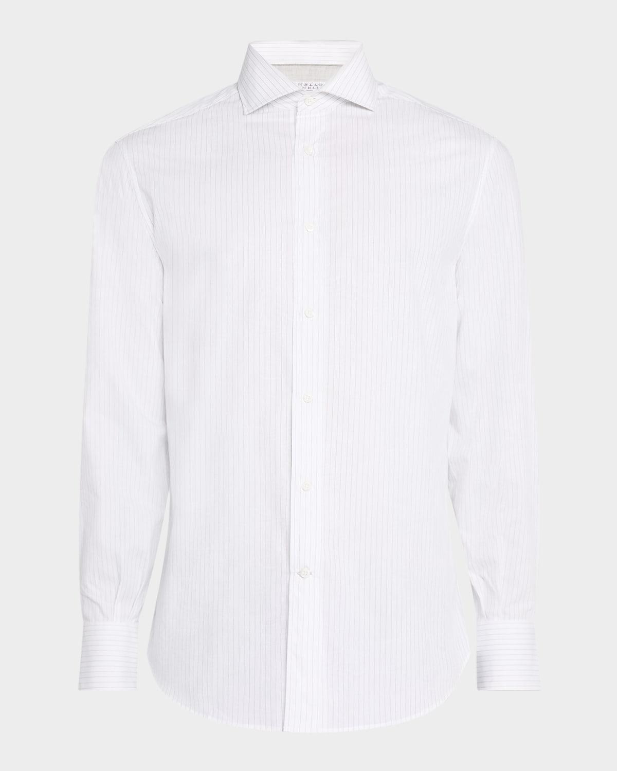Brunello Cucinelli sport shirt in textured pinstripe jacquard Genuine mother-of-pearl buttons Spread collar Button placket Long sleeves Double-button cuffs Pleated back yoke Curved hem Cotton Lining: Cotton Dry clean, machine wash cold Made in Italy