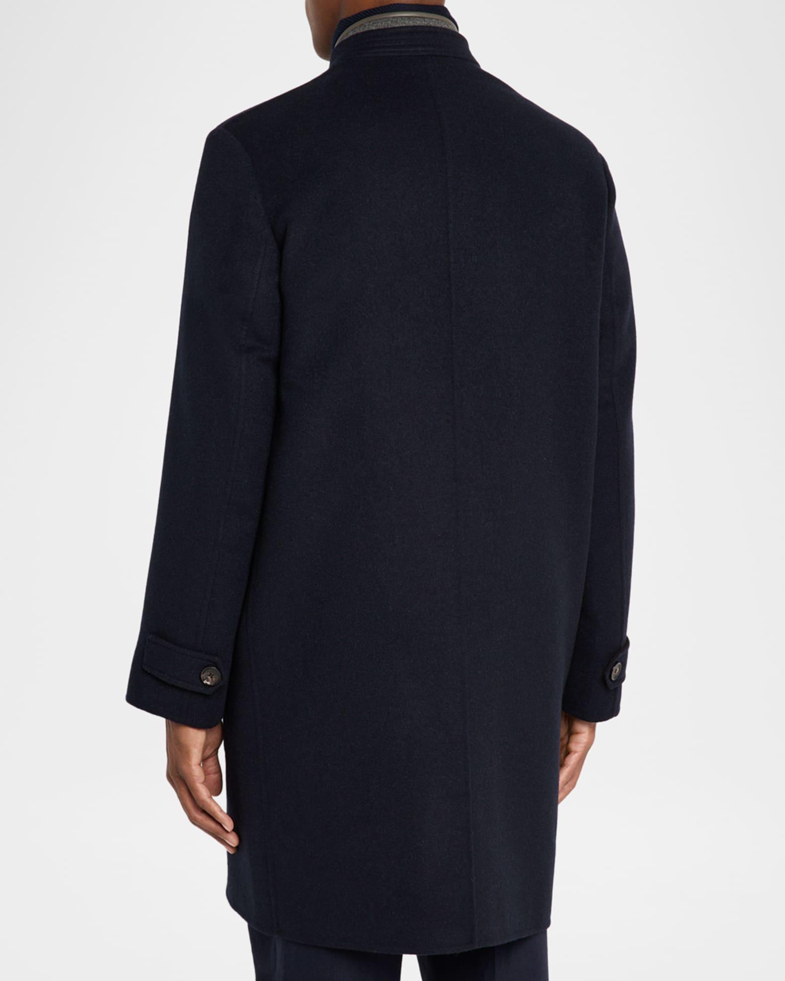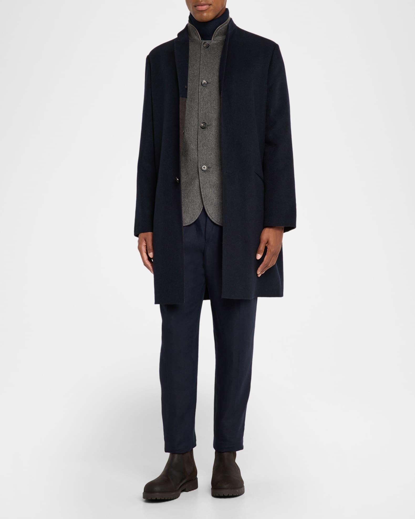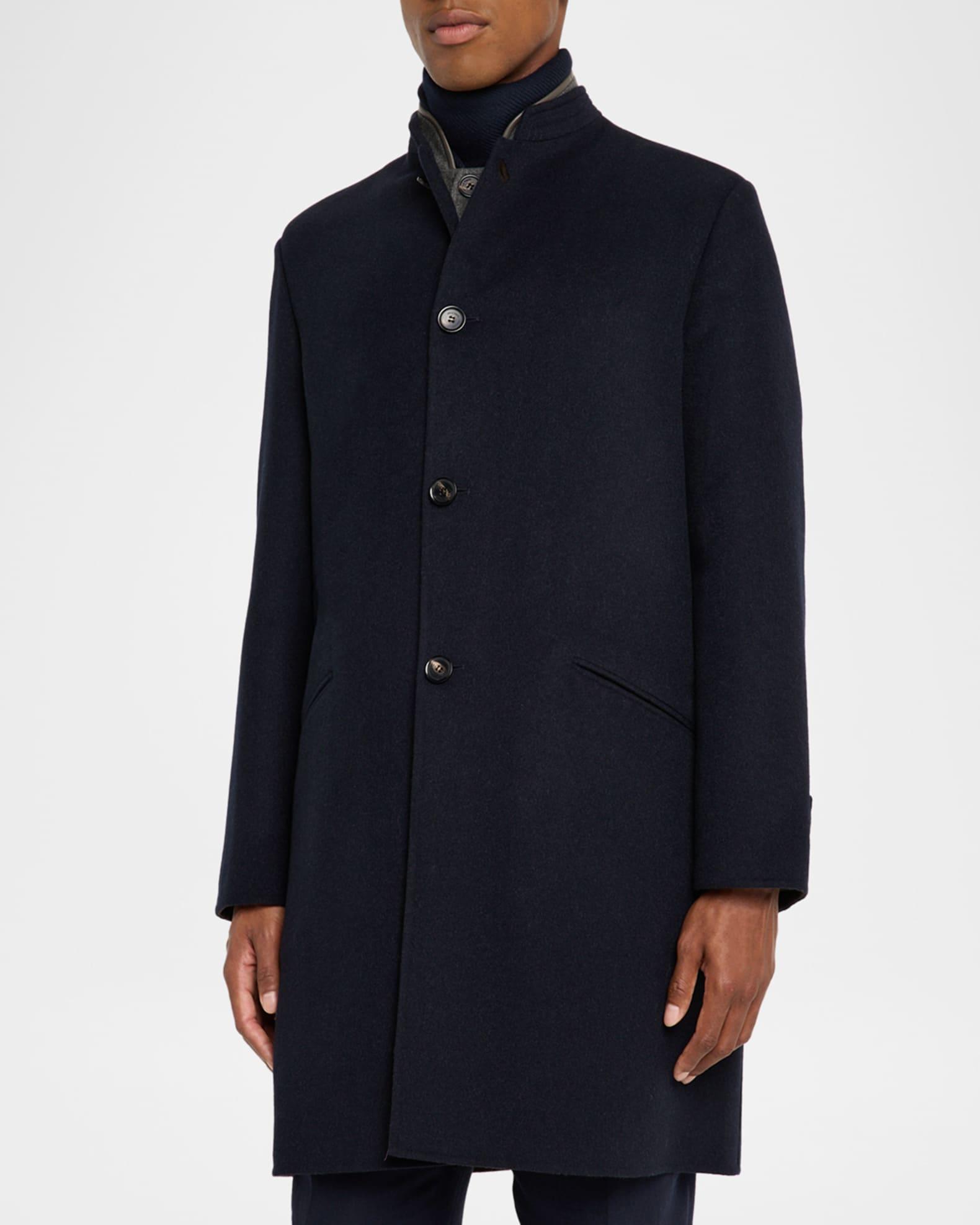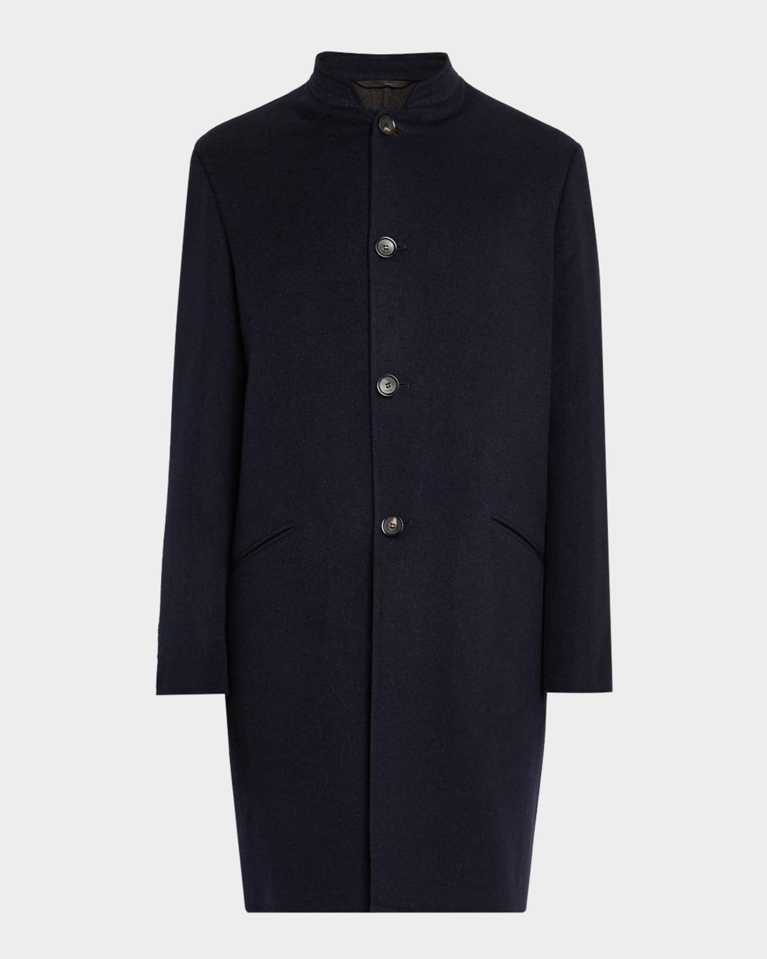 Loro Piana "Javier" overcoat in a sublime double-layer of Cashmere Rain® for a warm and water-repellent finish Stand collar Button front Hip besom pockets Long sleeves Buttoned cuffs Long length Cashmere Lining: Cotton/modal Dry clean Trim: Leather Made in Italy