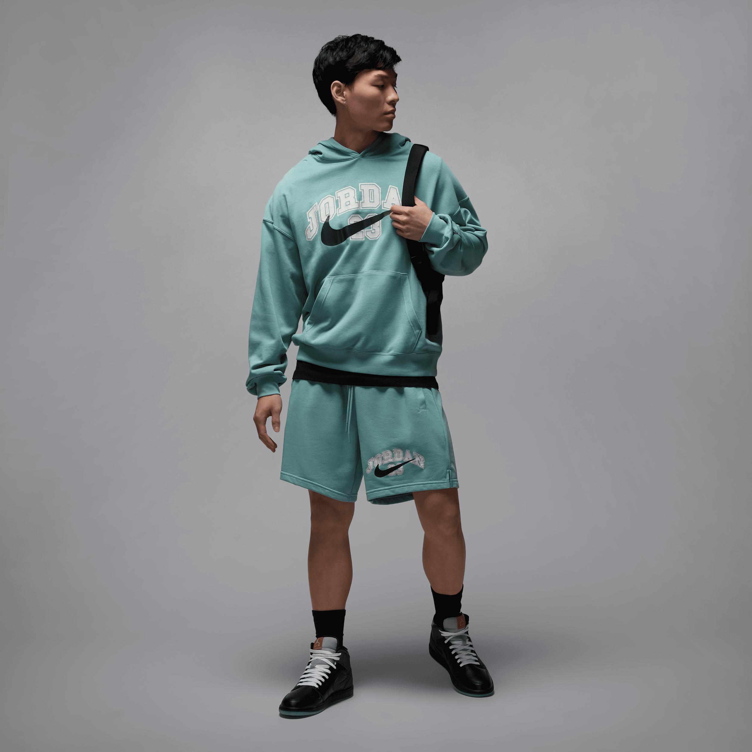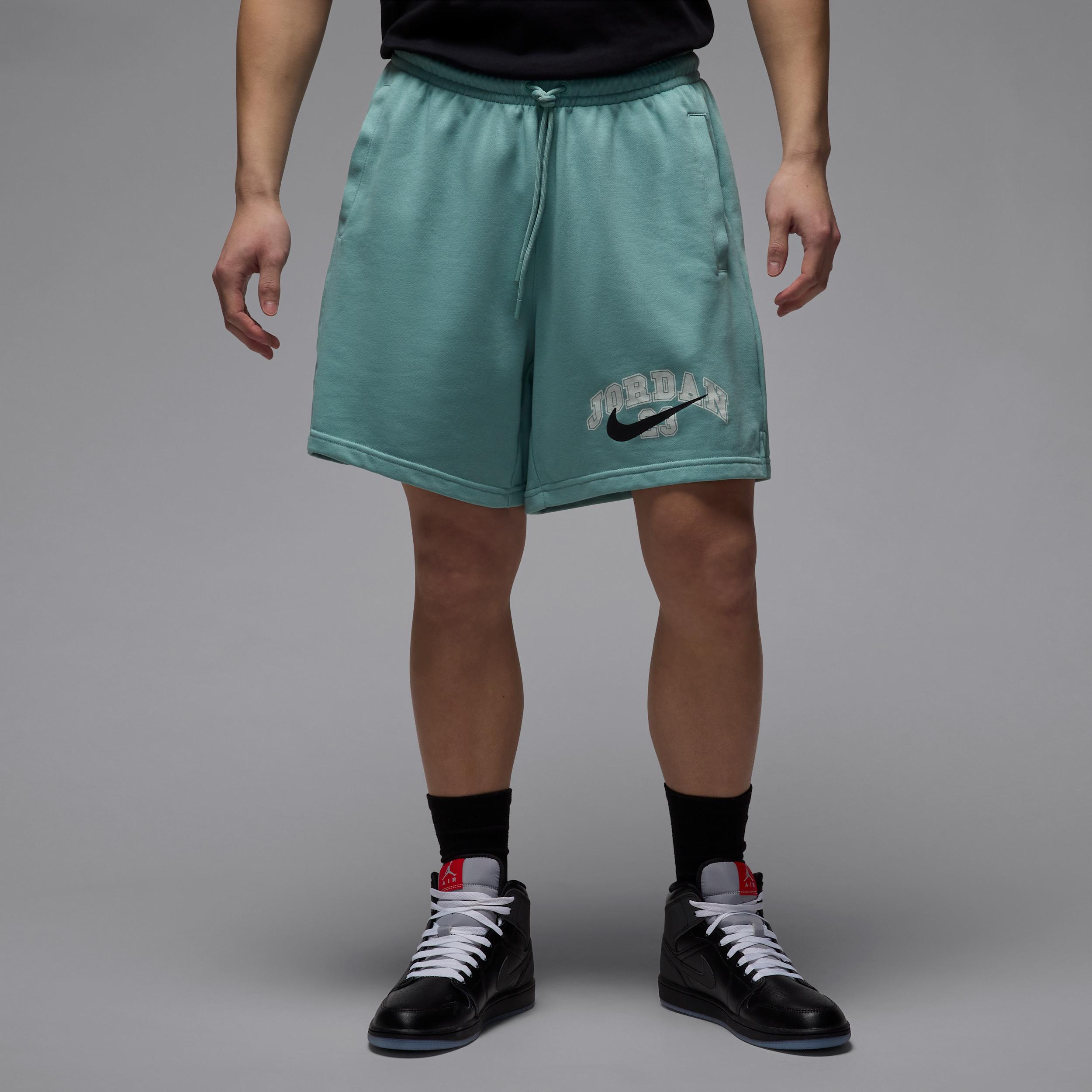 Lightweight and versatile, these baggy French terry shorts are ready for whatever you have planned. Crackle print graphics add vintage-inspired style while helping you rep the greatest to ever do it. Benefits:Smooth on the outside with tiny unbrushed loops on the inside, this French terry fabric is breathable and lightweight. Elastic waistband with drawcord helps you dial in your perfect fit. Product Details:Body: 80% cotton/20% polyester. Pocket bags: 100% cotton. Side and rear pockets. Machine wash. Imported. Style: IB7272; Color: Mineral/Black; Size: M; Gender: Male; Age Group: Adult | Jordan MVP Mens French Terry Shorts in Green, Size: Medium | IB7272-309