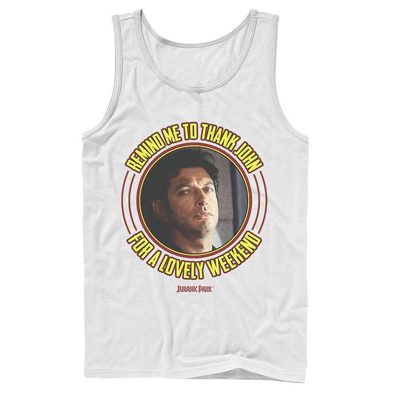 Hell be thankful when you gift him this mens Jurassic Park Remind Me To Thank John For The Weekend Tank Top. Hell be thankful when you gift him this mens Jurassic Park Remind Me To Thank John For The Weekend Tank Top. Printed design SleevelessFABRIC & CARE Cotton Machine wash Imported Color: White. Gender: male. Age Group: adult. Pattern: Graphic.