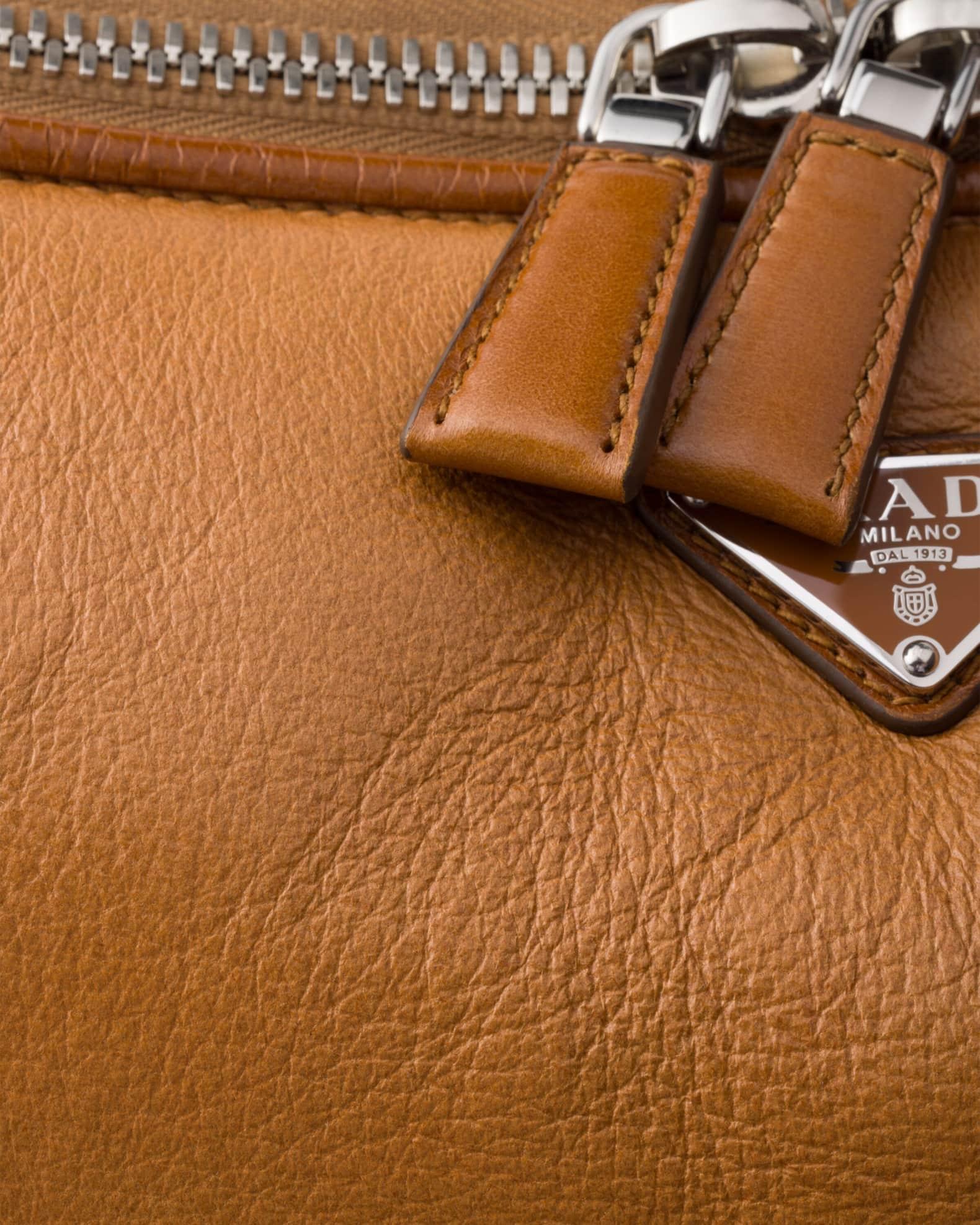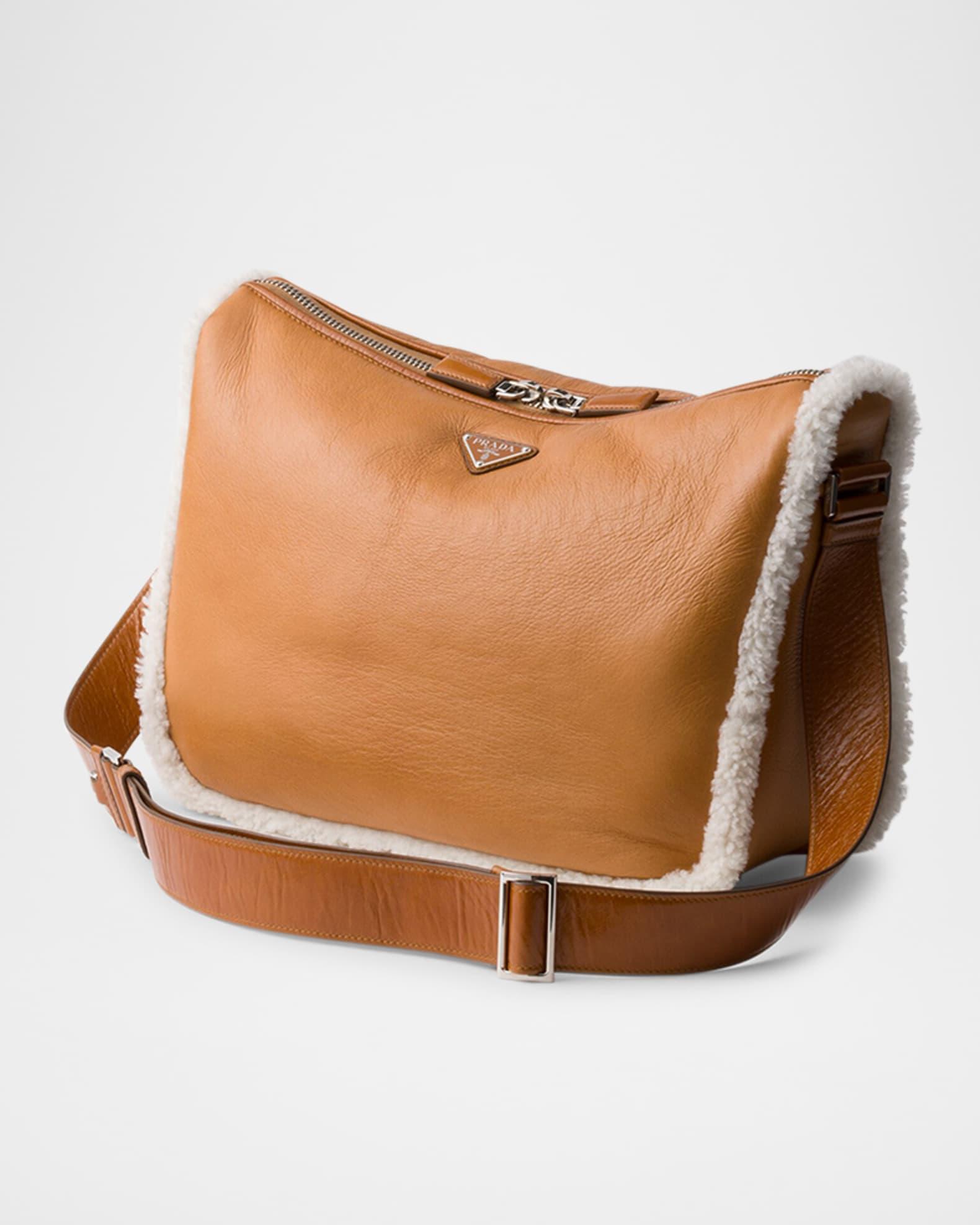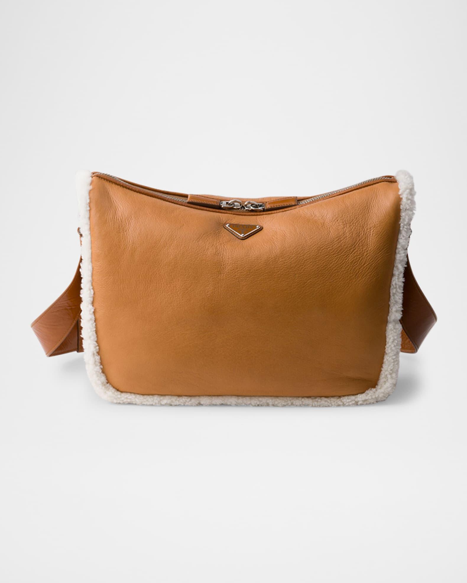 Prada shoulder bag reimagined in dyed lamb shearling (Antarctica) Adjustable leather shoulder strap with a trick attachment ring; approx. maximum length: 47.2"L Two-way zip top closure Signature enameled metal triangle logo Unlined Approx. 9.8"H x 12.4"W x 5.5"D Imported