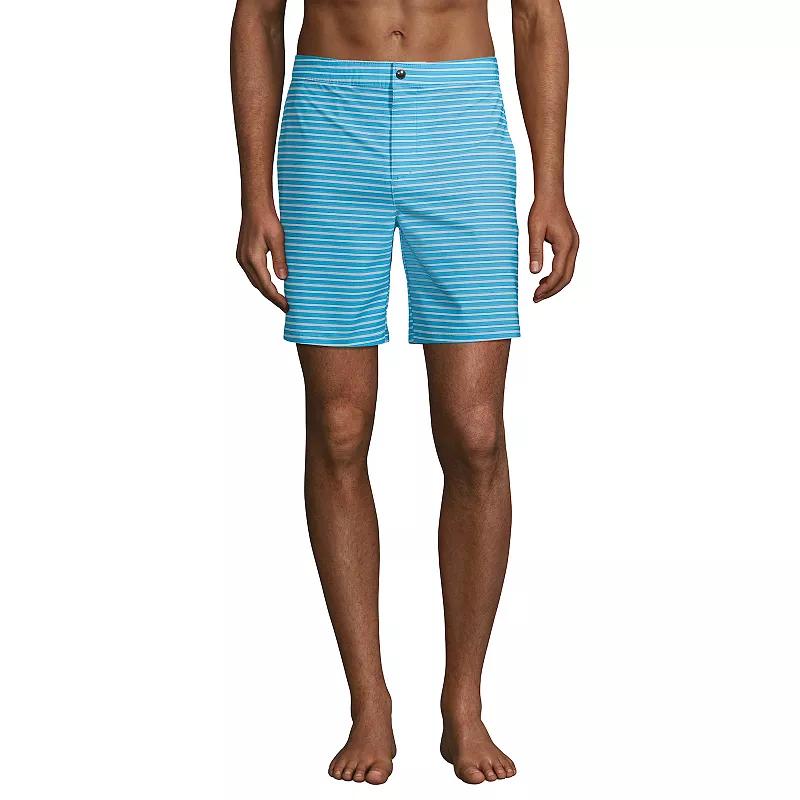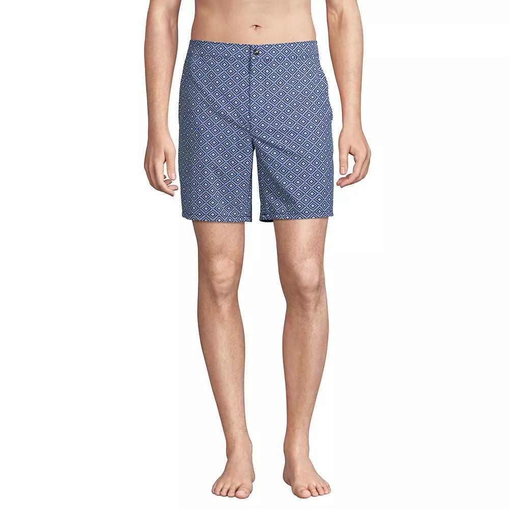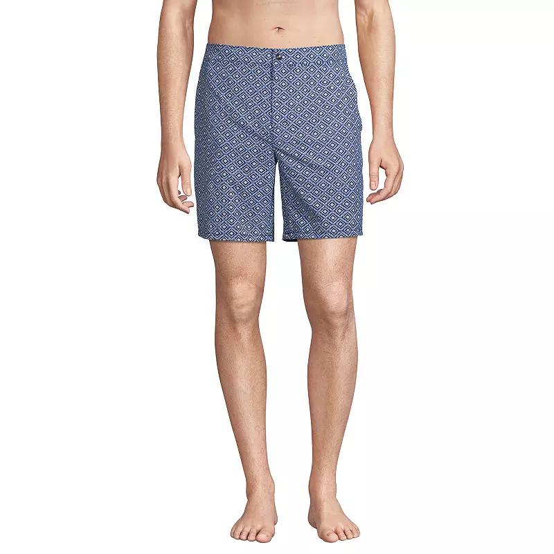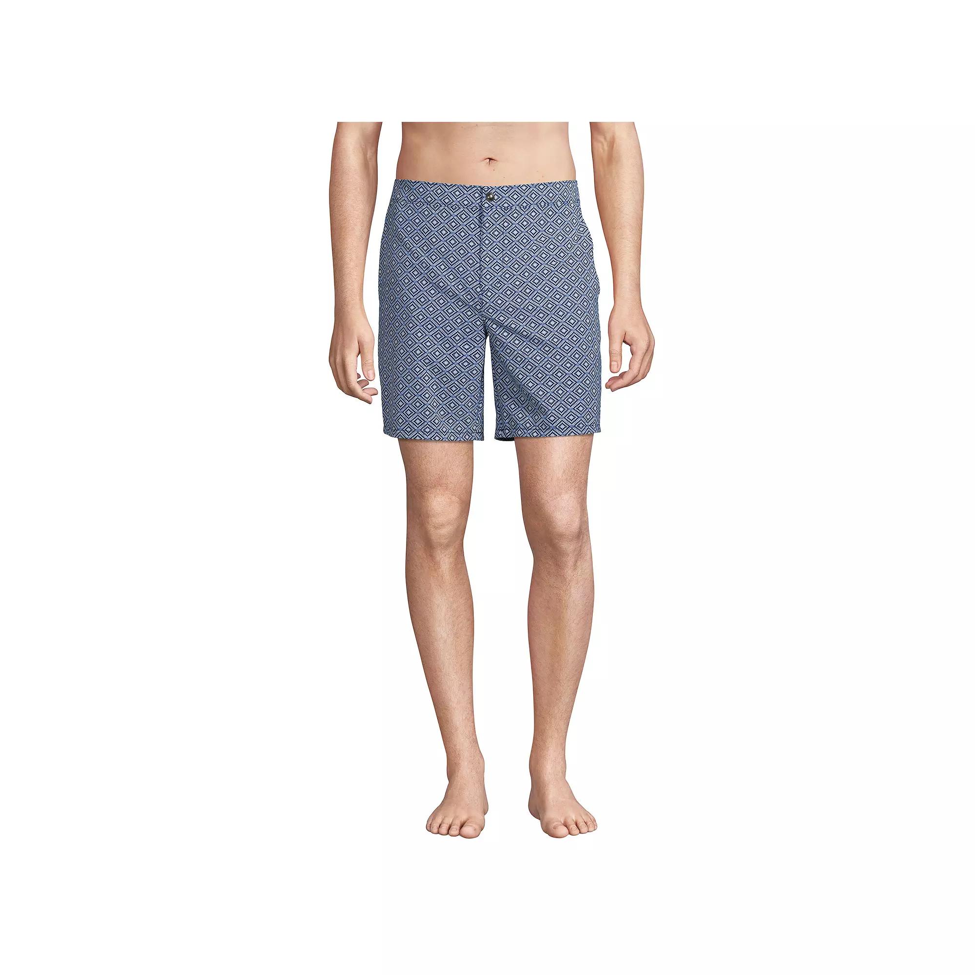 Youll be beach ready with these mens Lands End swim shorts. Youll be beach ready with these mens Lands End swim shorts. Water-repellent exterior 4-way stretch fabric Interior mesh lining Snap front Back-elastic waistband 3-pocketFIT & SIZING Approximate 7-inch inseamFABRIC & CARE Polyester, spandex Machine wash Imported Size: XXL. Color: Dark Blue. Gender: male. Age Group: adult. Pattern: Pattern.