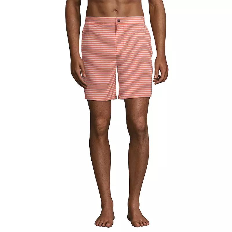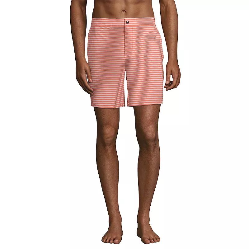 Youll be beach ready with these mens Lands End swim shorts. Youll be beach ready with these mens Lands End swim shorts. Water-repellent exterior 4-way stretch fabric Interior mesh lining Snap front Back-elastic waistband 3-pocketFIT & SIZING Approximate 7-inch inseamFABRIC & CARE Polyester, spandex Machine wash Imported Color: Red. Gender: male. Age Group: adult. Pattern: Pattern.