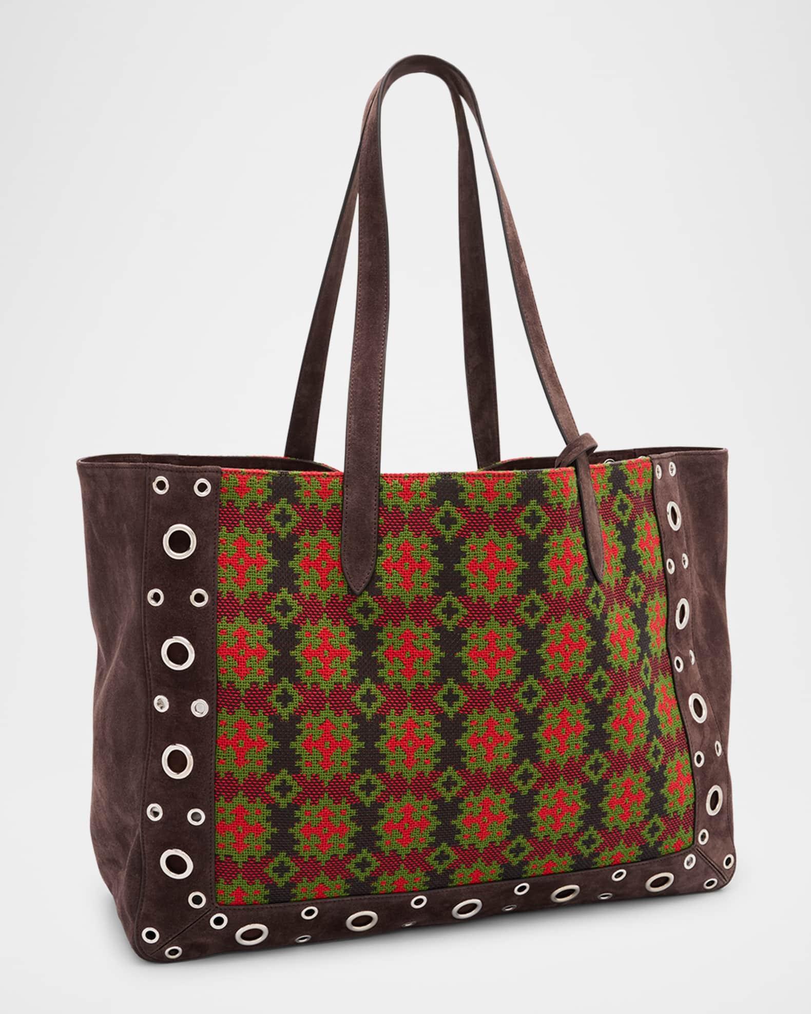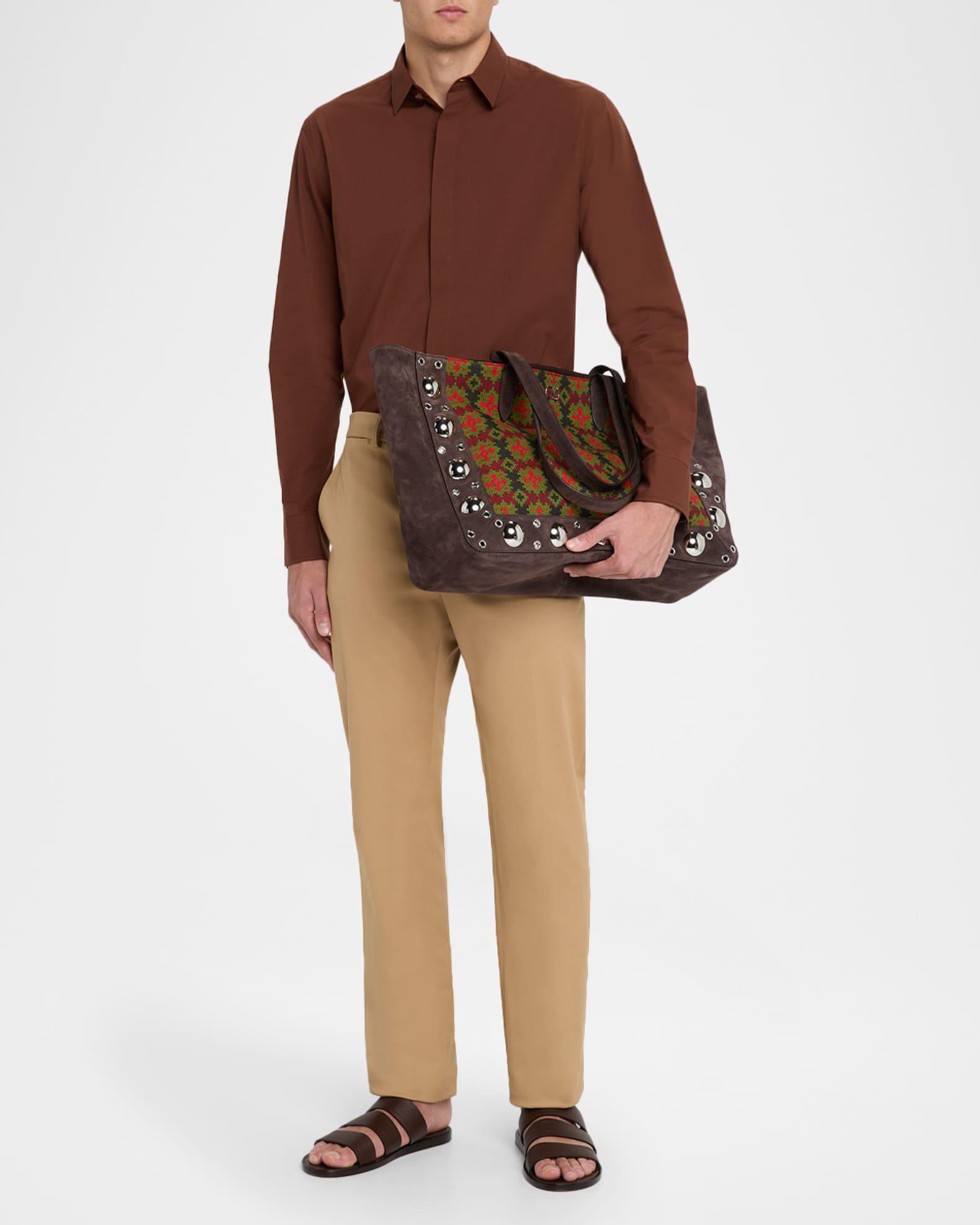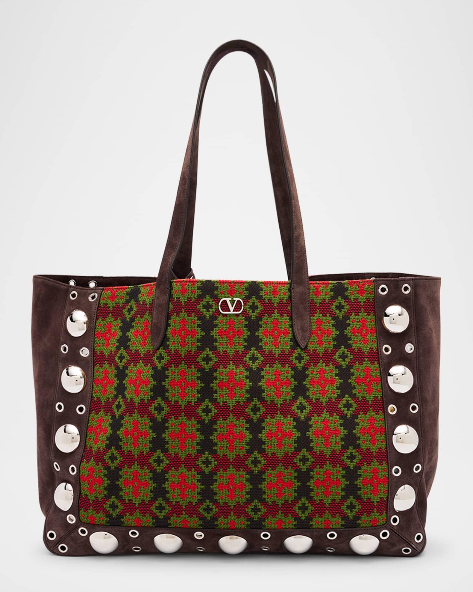 Valentino Garavani tote bag in suede and cotton jacquard decorated with palladium-finish ball studs and rivets Small metallic VLogo Signature on the front Suede shoulder straps; 9.4" drop Can be worn on the shoulder or by hand Open top Interior, one removable inner pouch Approx. 11.8"H x 15.7"W x 5.1"D Made in Italy