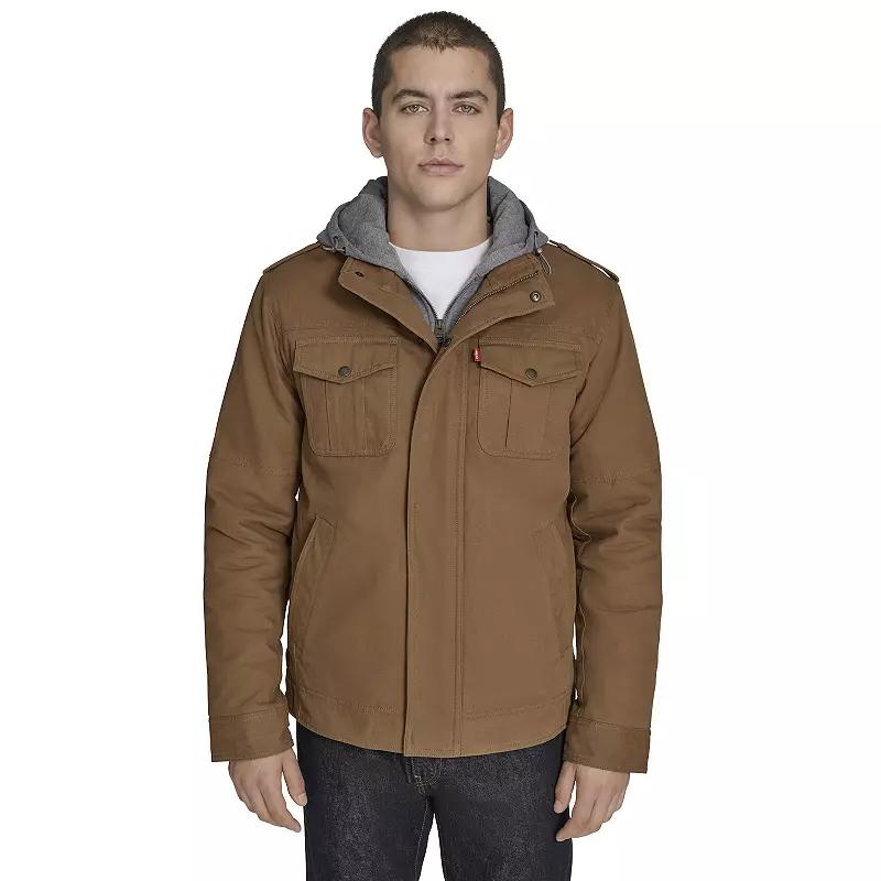 Rugged style. This mens trucker jacket from Levis is perfect for the road ahead. Midweight insulation for active wear in cool conditions Hooded design Knit collar Soft polyester lining Zip & snap front Long sleeves 5-pocket Long sleeves Fabric & Care: Cotton Machine wash Imported Size: XXL. Color: Olive. Gender: male. Age Group: adult.