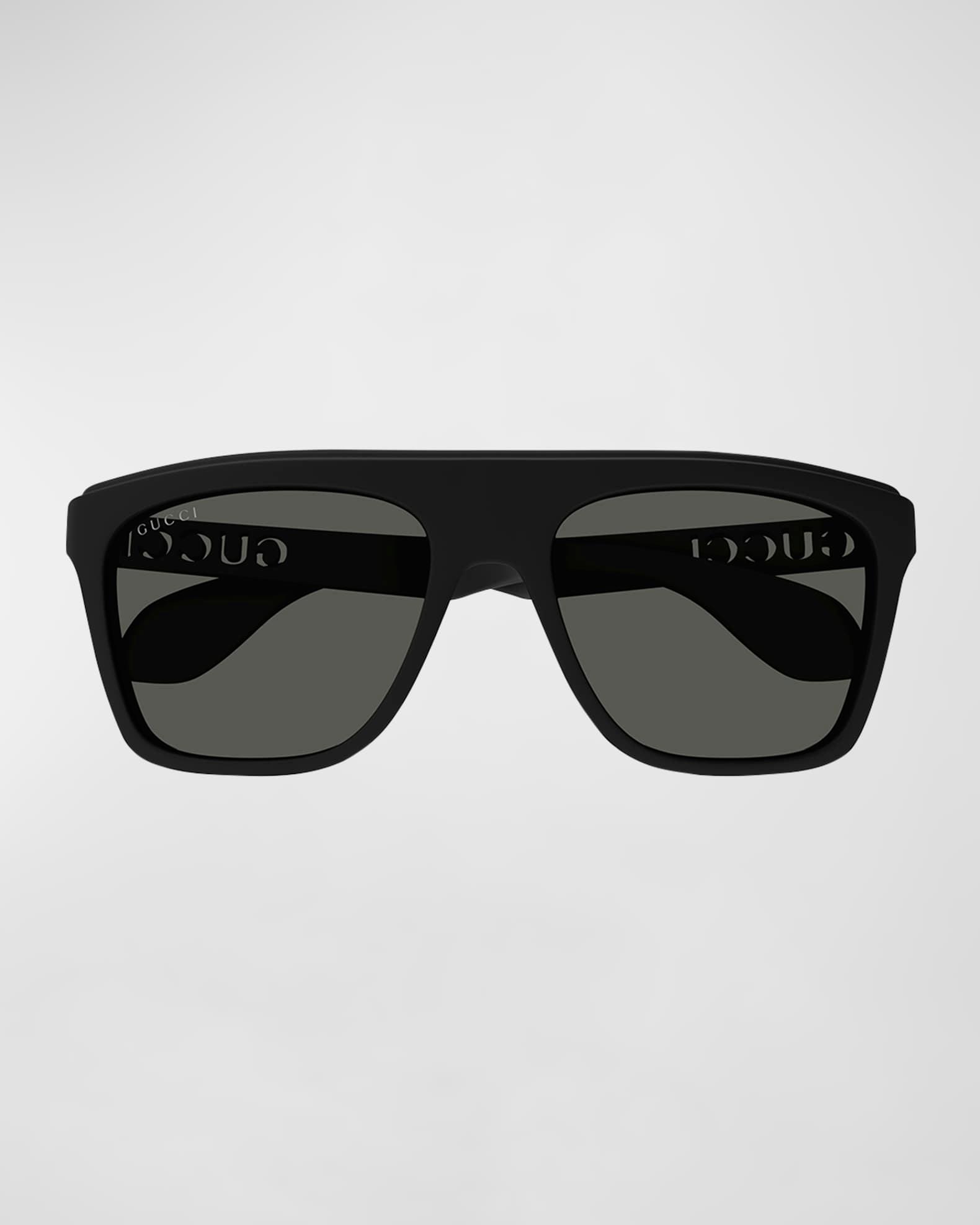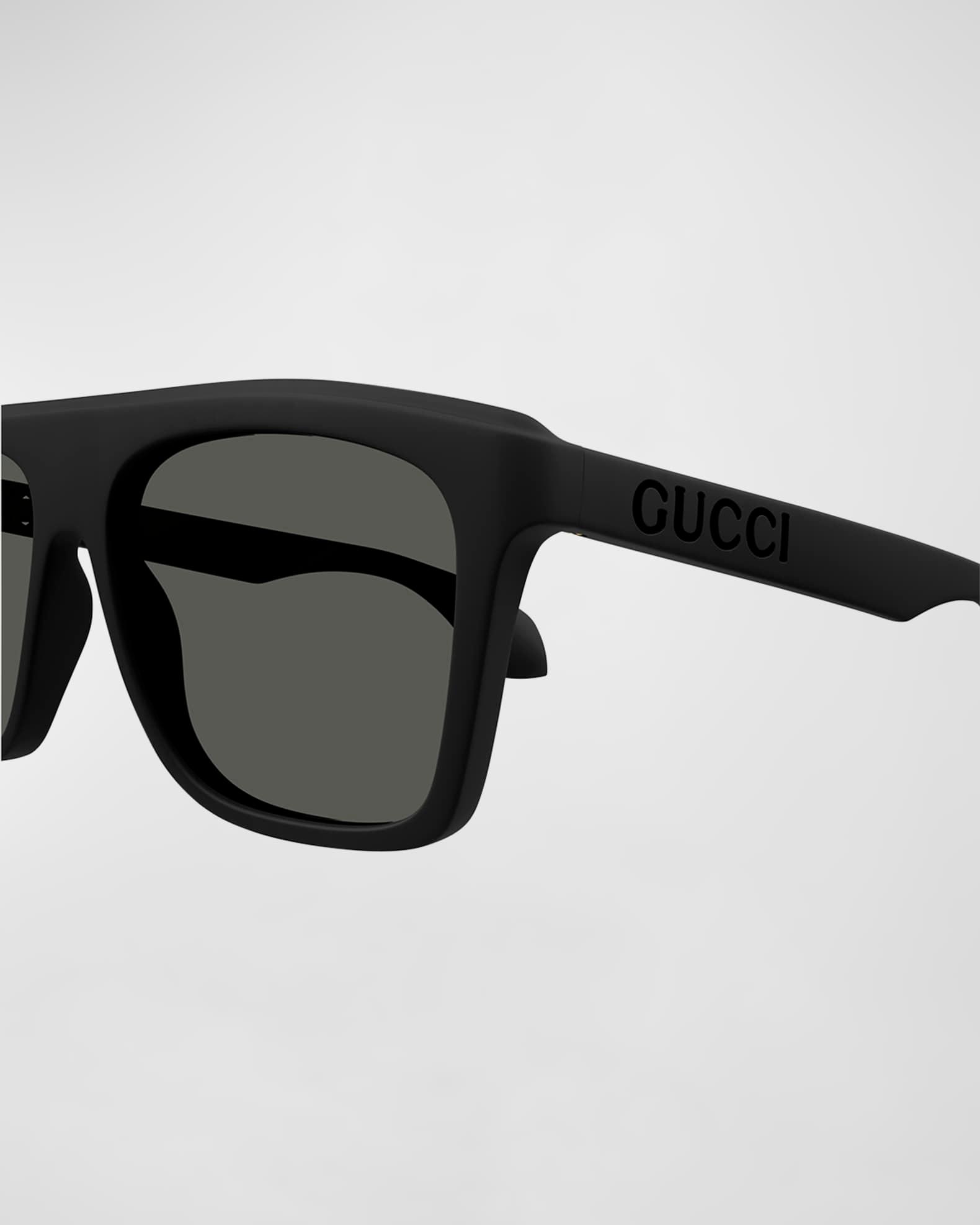 Gucci "GG1570SM" rectangle sunglasses in acetate Lens/bridge/temple (in mm): 54-19-145 Solid-color lenses Right lens logo script Saddle nose bridge Temples with cutout logo lettering Thin, tapered arms Curved temple tips Acetate 100% UVA/UVB protection Made in Italy Proposition 65 warning for California residents