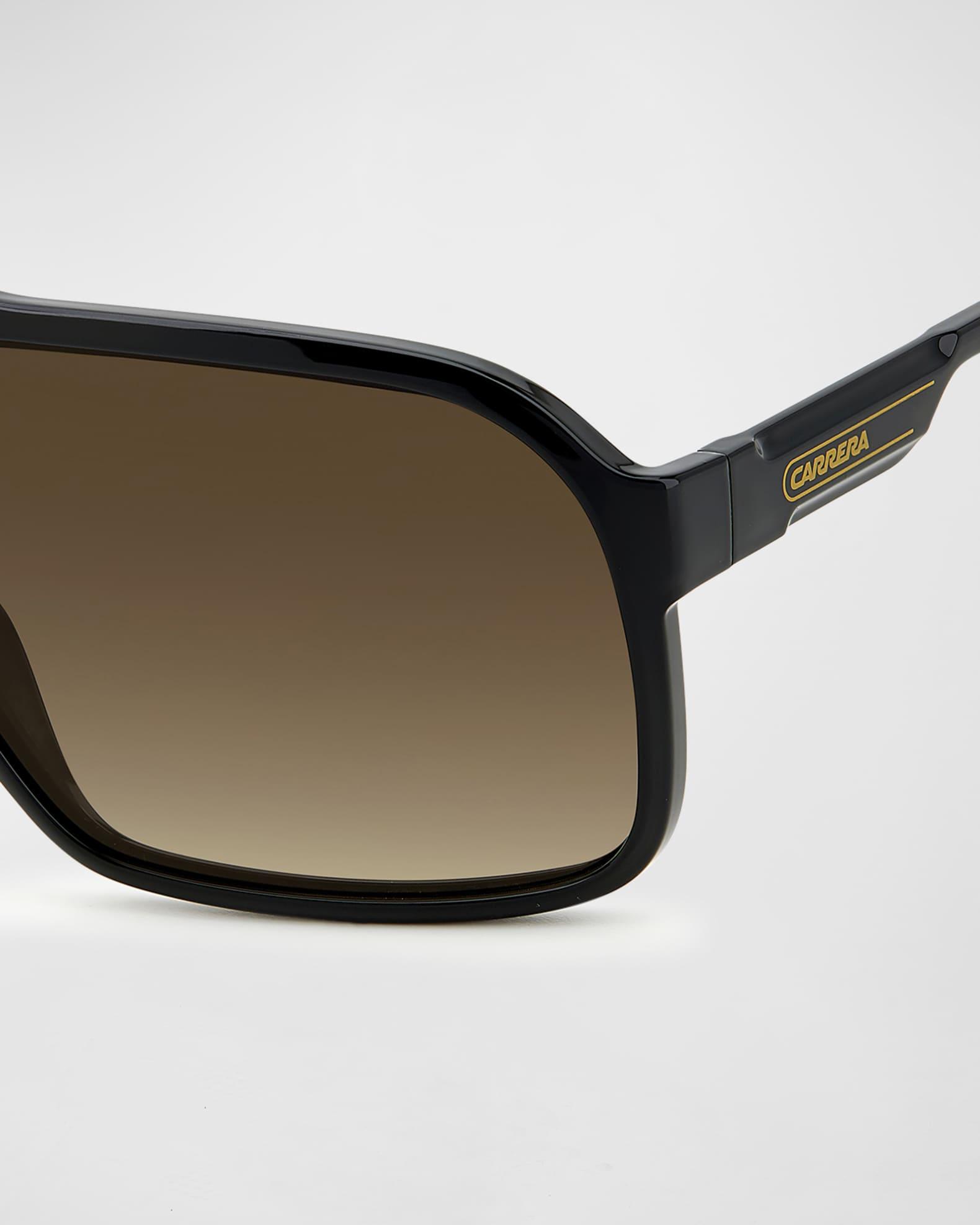Carrera "1046/S" shield sunglasses features logo lettering at center lens Eye/bridge/temple (in mm): 99-01-130 Gradient lens Full-rim frames Saddle nose bridge Logo motif at temples Tapered arms; curved temple tips Plastic 100% UVA/UVB protection Imported Proposition 65 warning for California residents