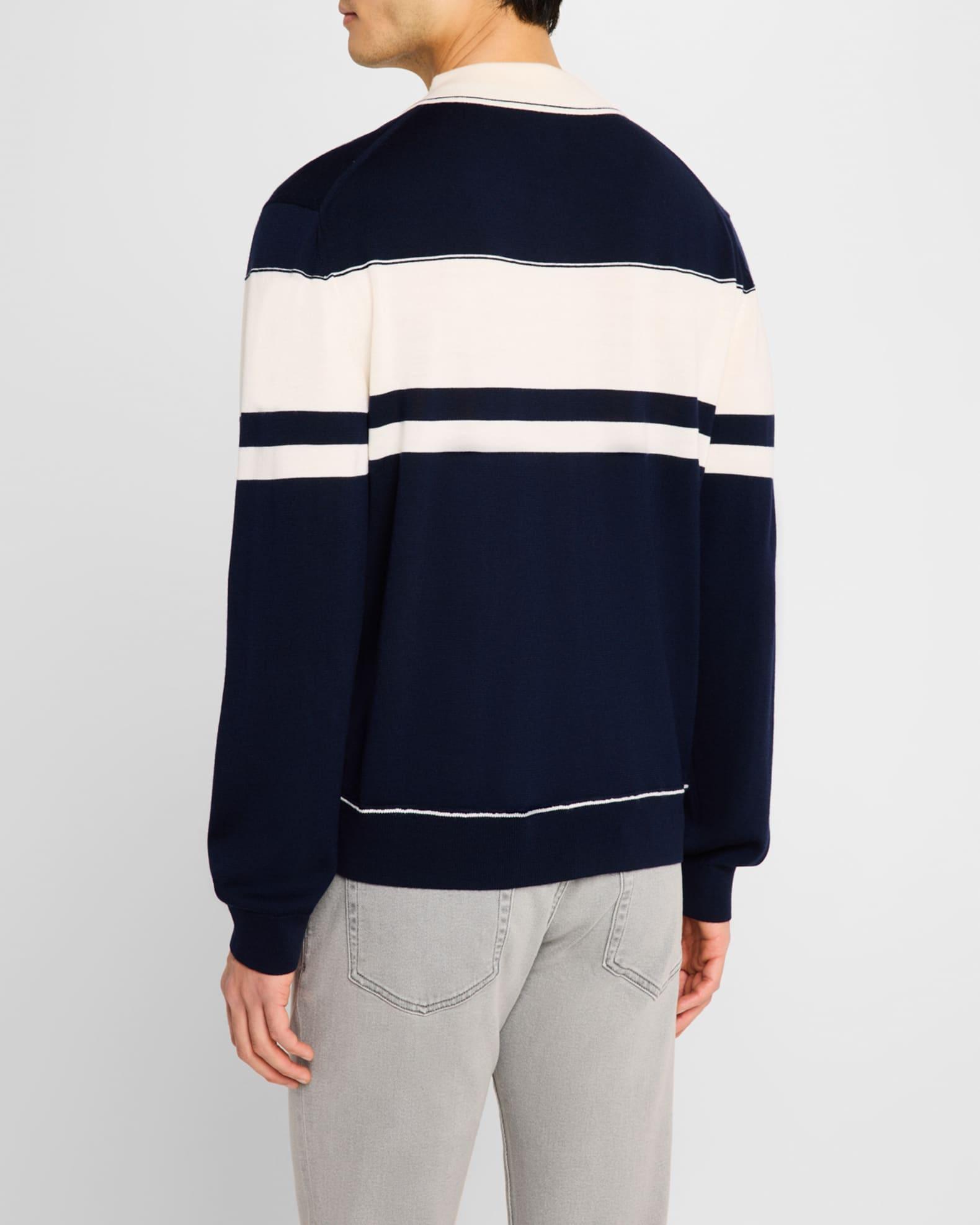 SIMKHAI "Louis" polo sweater crafted from premium merino wool for a soft and breathable feel Highlighted with bold stripes and contrast stitching Spread collar Concealed three-button placket Long sleeves Ribbed cuffs and hem Pullover style Merino wool Dry clean Imported