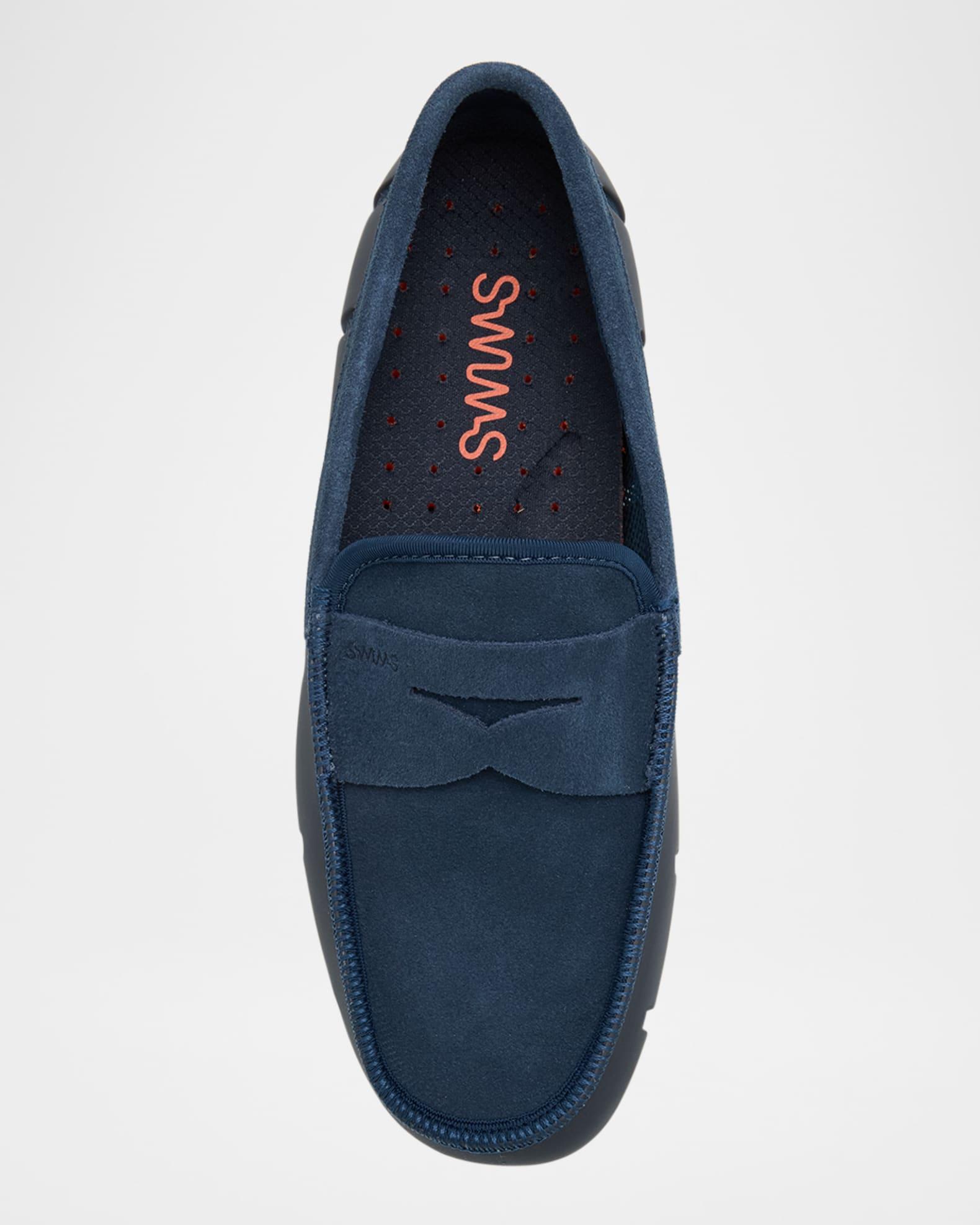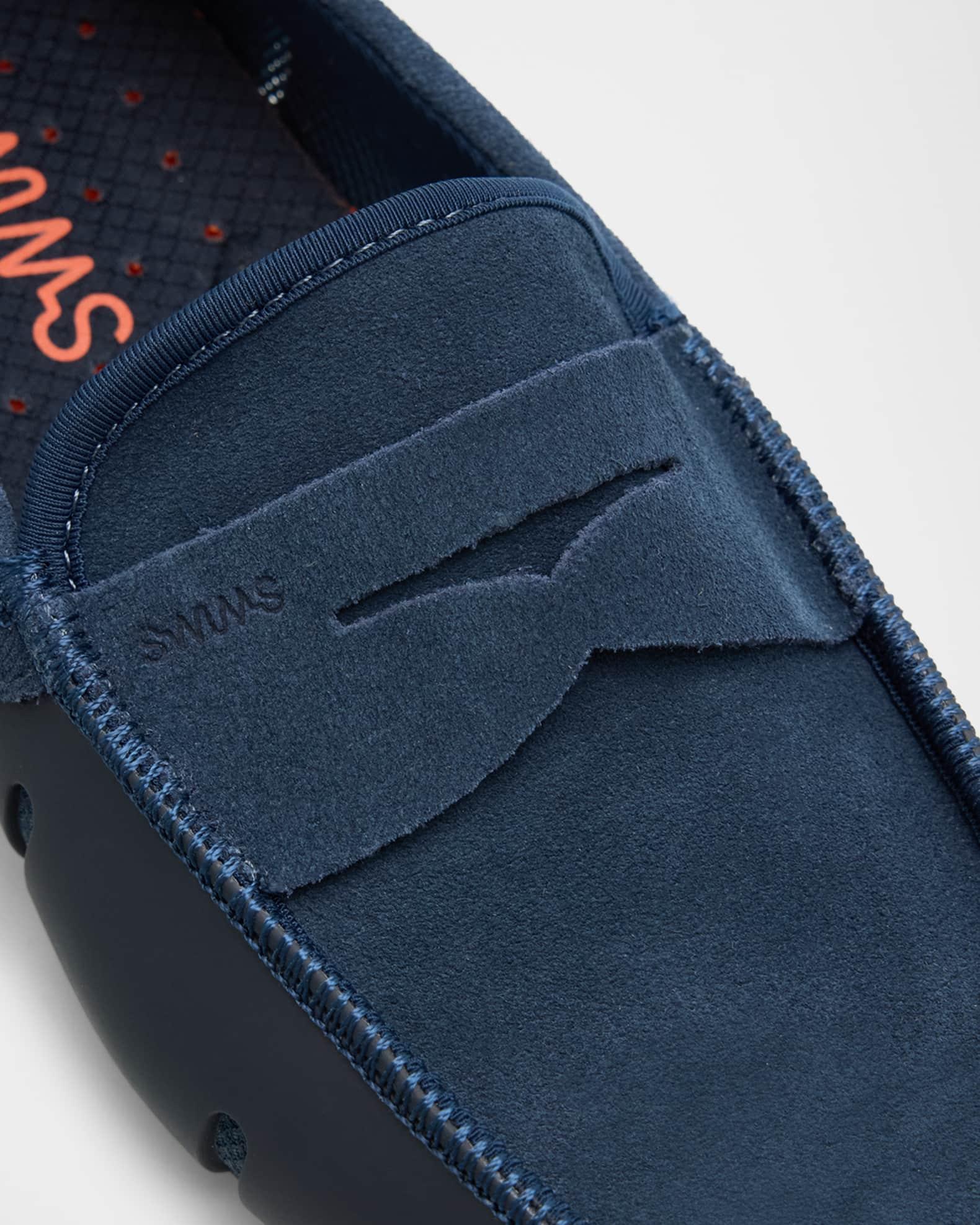 Swims "Lux" waterproof loafers with suede vamp and trim Flat heel Round moc toe Penny keeper strap; debossed logo Raised logo at backstay Rubber structure with vertical cutouts Synthetic lining Pebbled rubber sole for non-slip grip Machine wash; air dry Imported