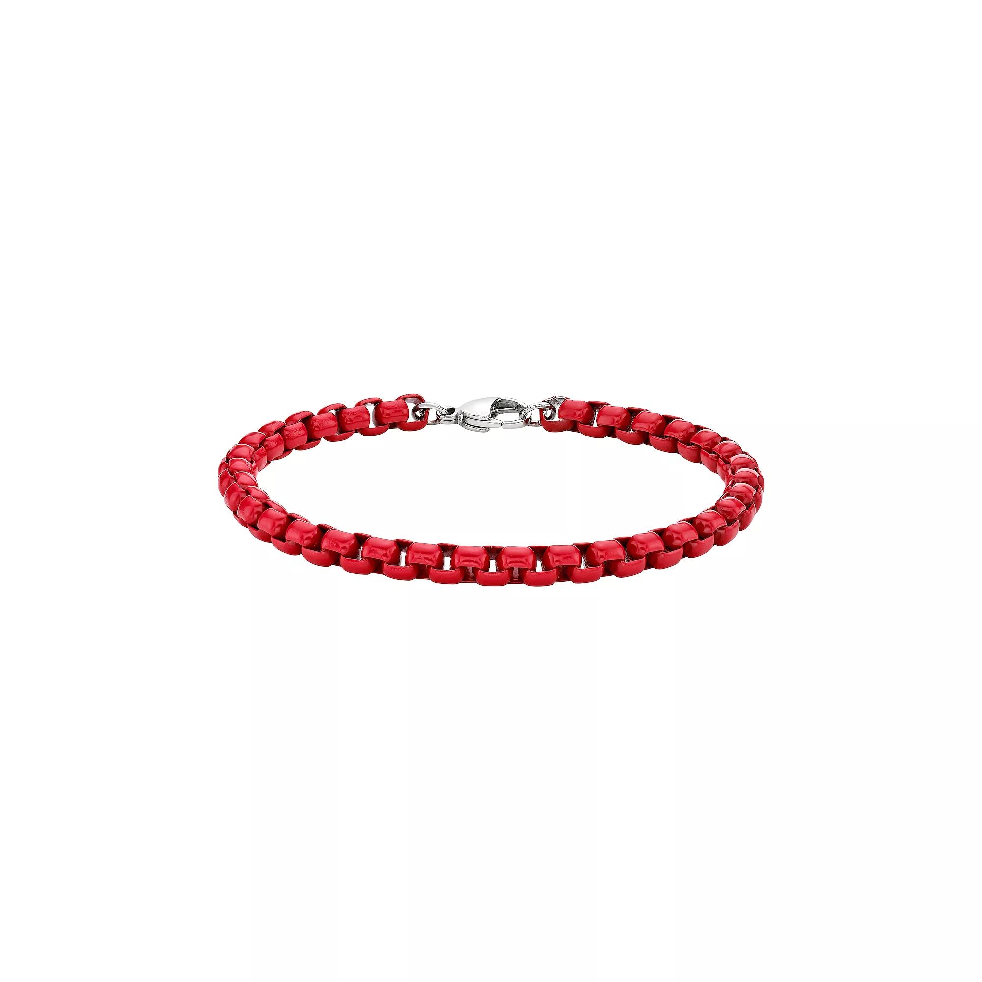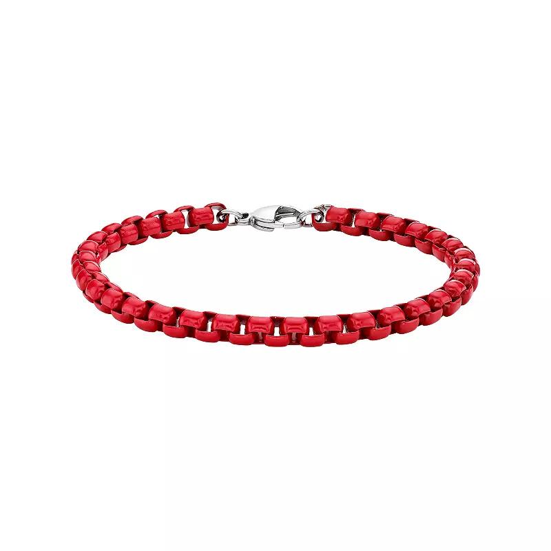 Add something new and exciting to your daily look with this red acrylic coated stainless steel box chain bracelet. Add something new and exciting to your daily look with this red acrylic coated stainless steel box chain bracelet. Length: 9 in. Chain type: box Clasp: lobster-claw Metal: stainless steel Plating: red acrylic coating Finish: polished Packaging: boxed Please note, due to the high value of this item, a signature may be required upon delivery. Size: 9. Gender: male. Age Group: adult.