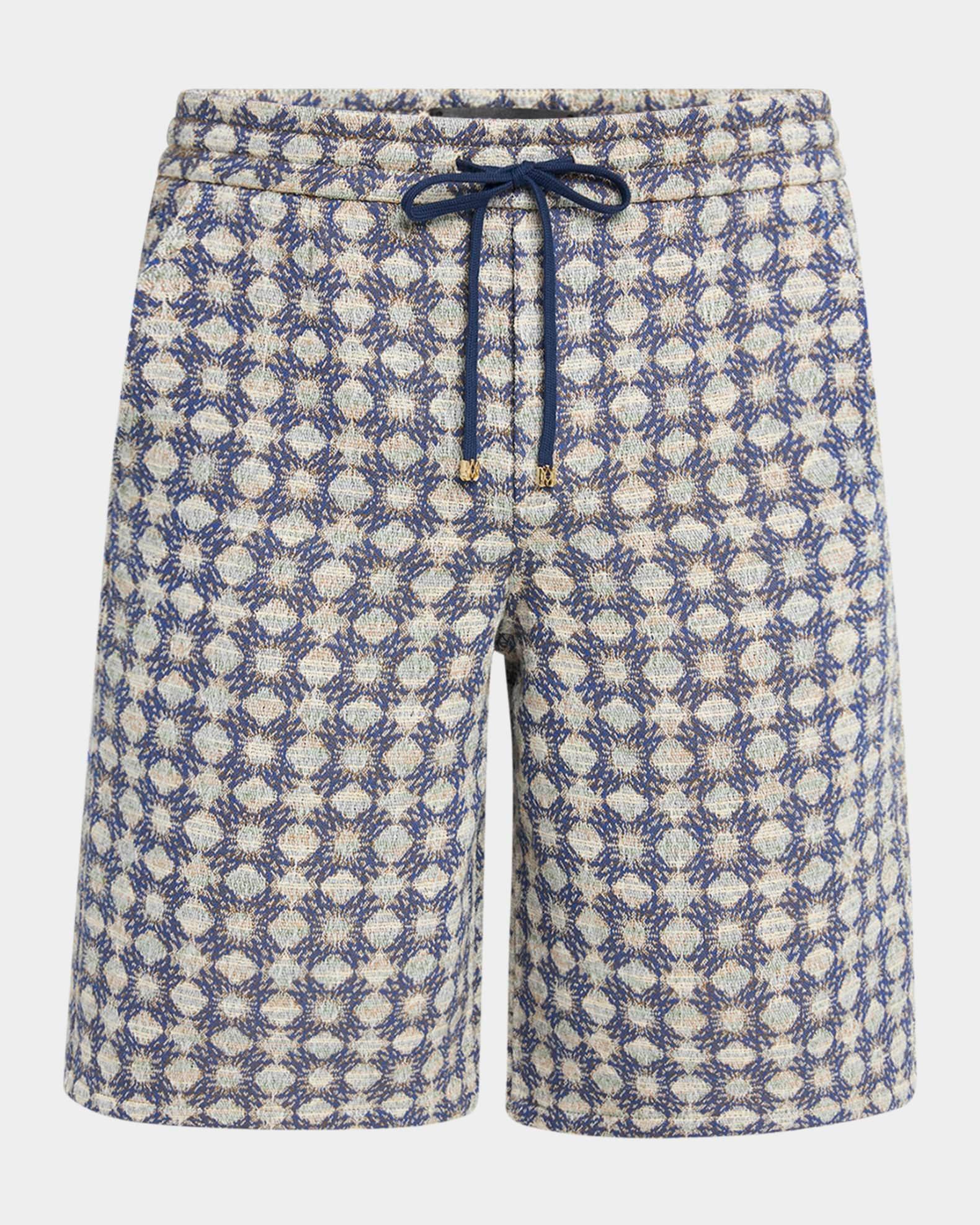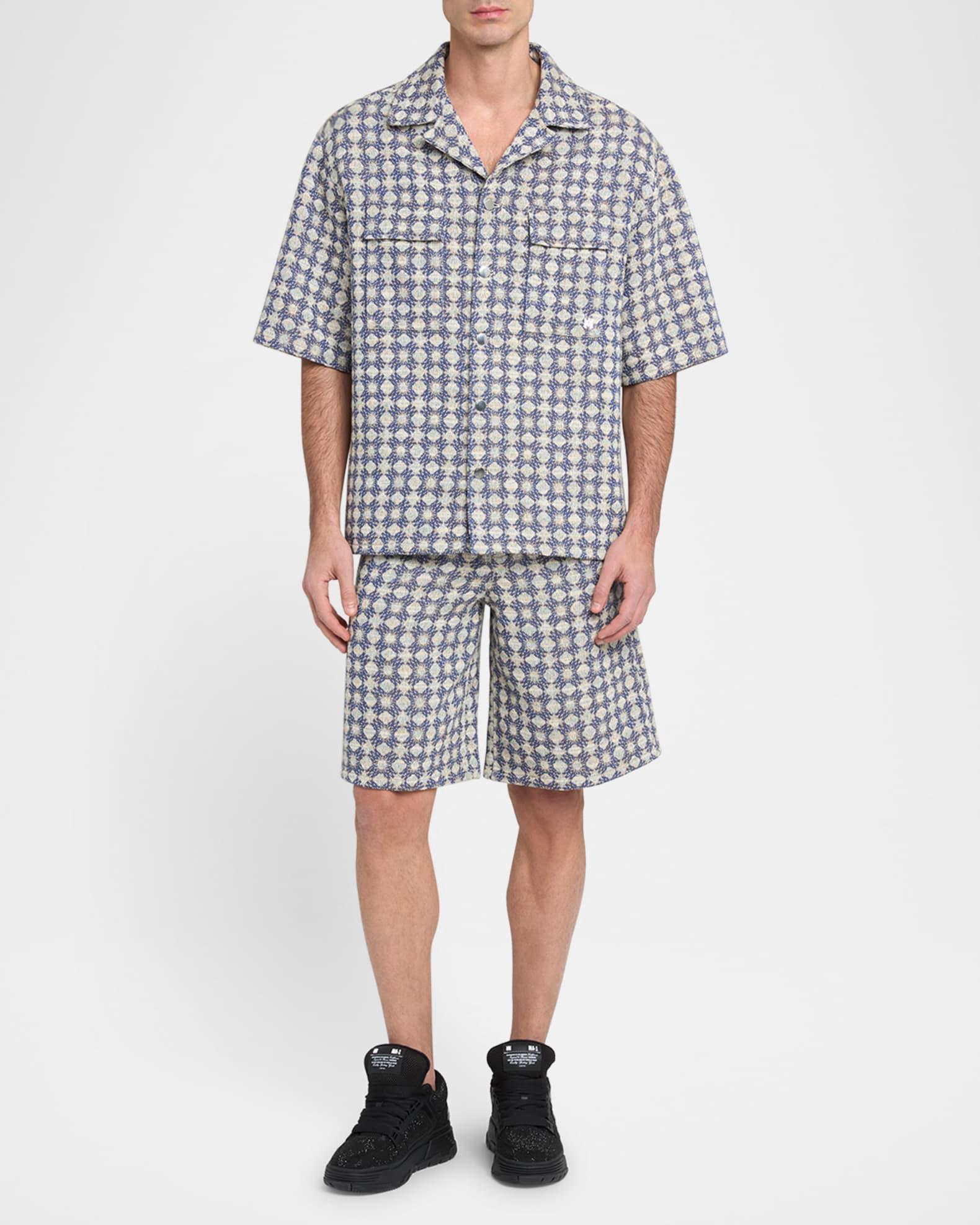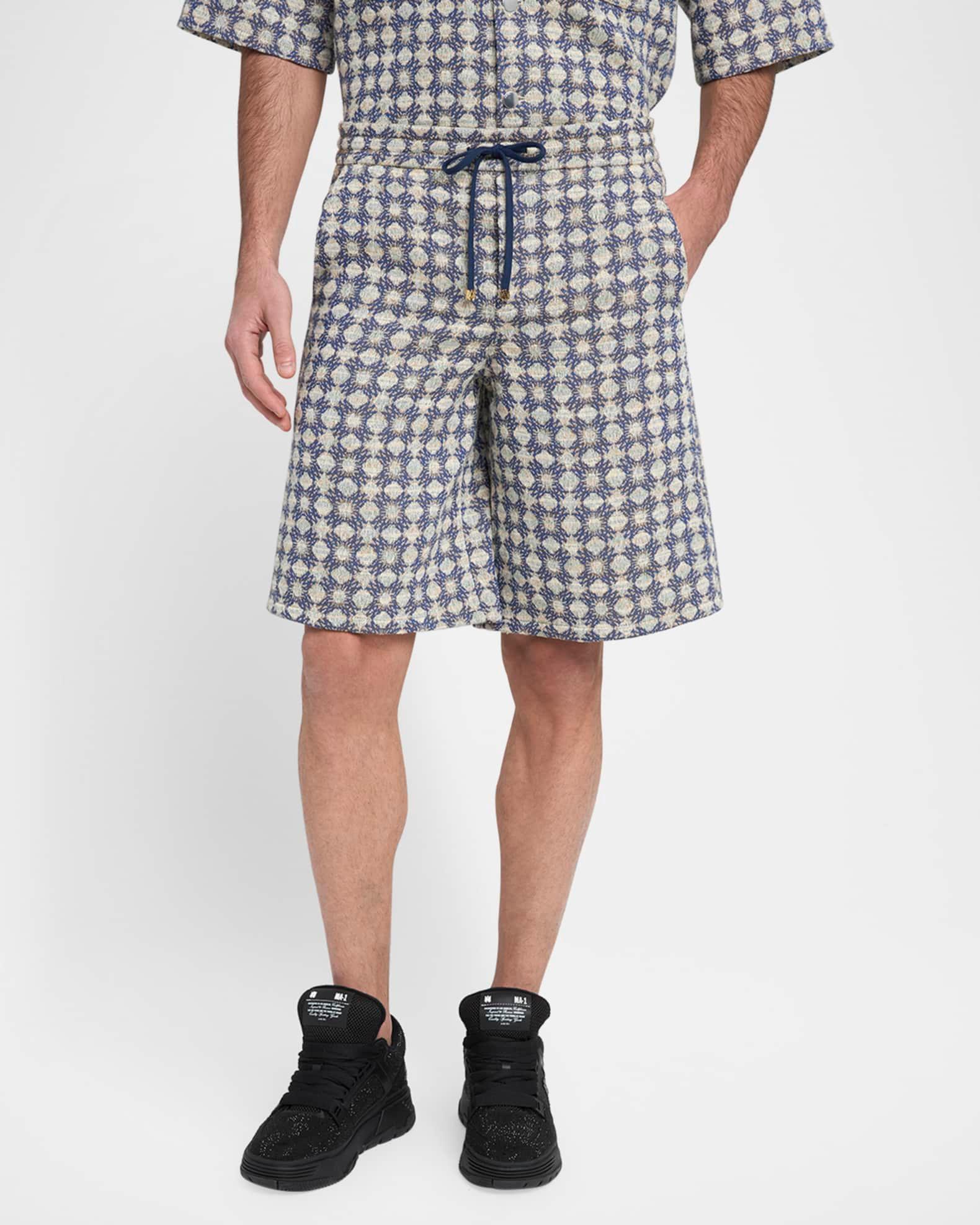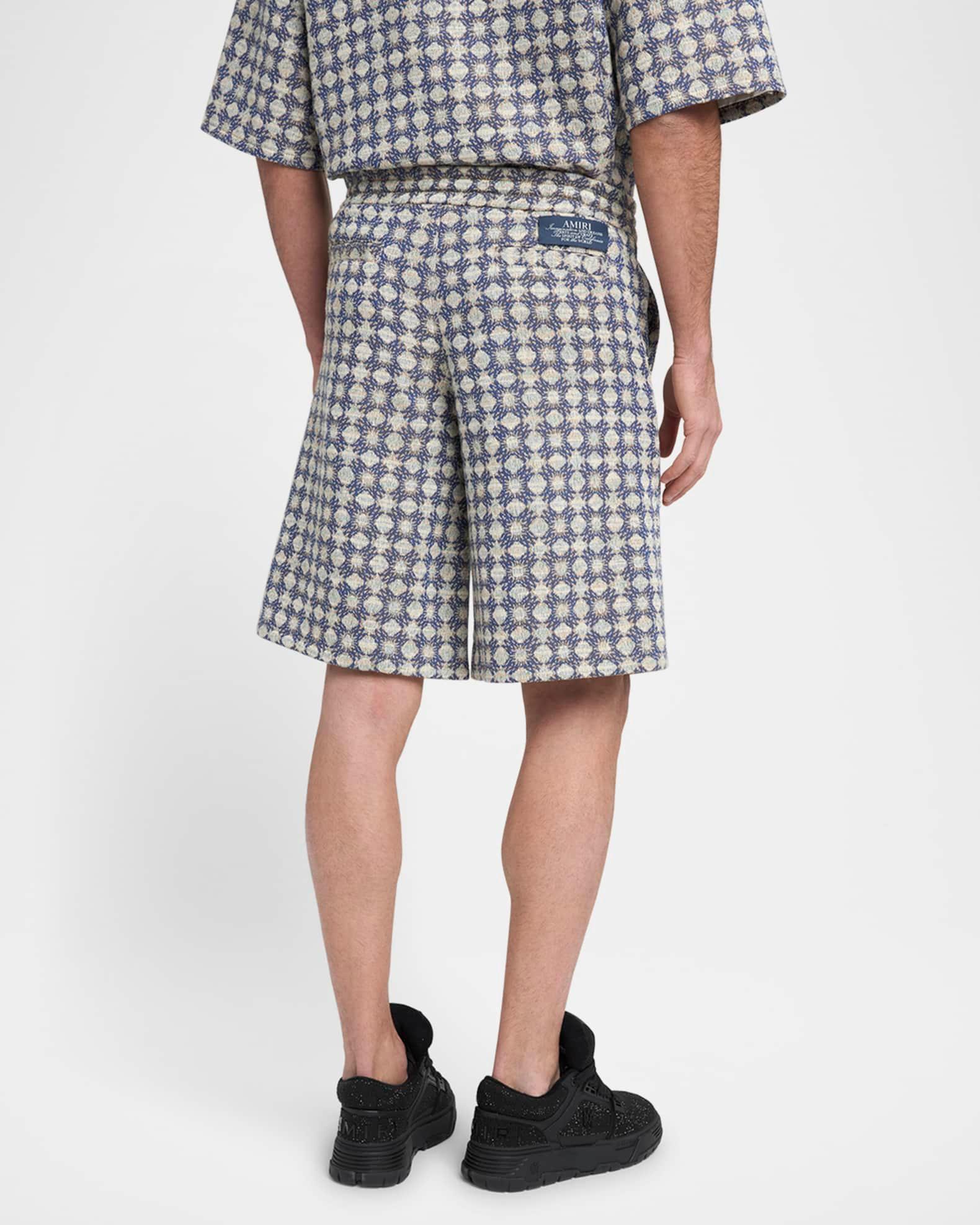 Amiri shorts in bouclé fabric showcasing an allover MA Quad pattern Regular rise Flat front Side slip pockets Back welt pockets Woven back label Relaxed legs Elasticized drawstring waistband Pull-on style Cotton/polyester/wool Dry clean Made in Italy